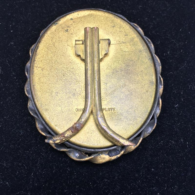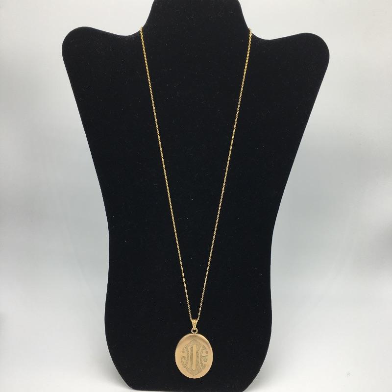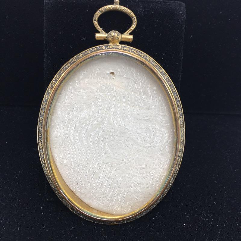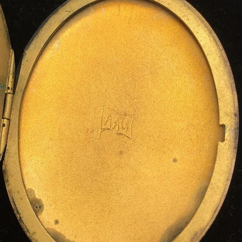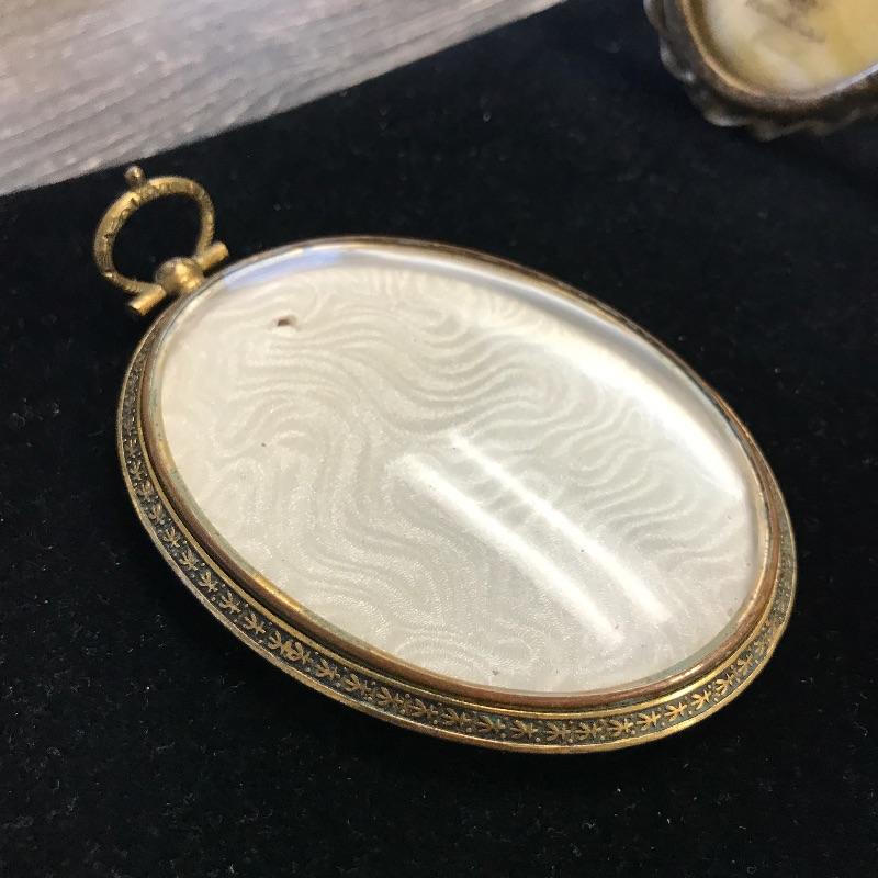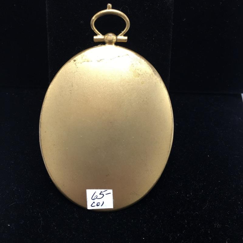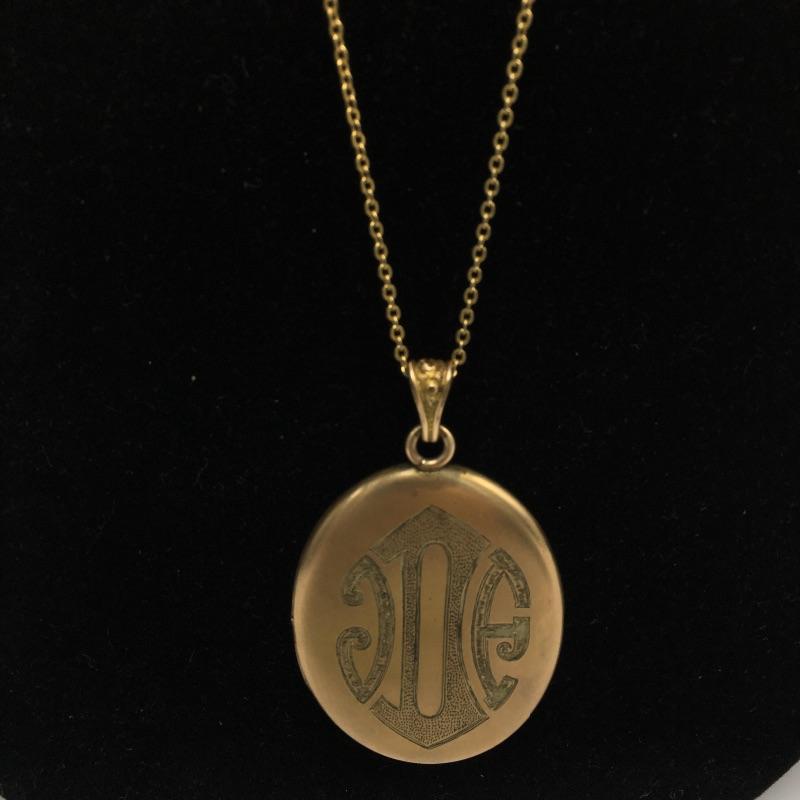 Lot includes locket that can accommodate two pictures with chain, oval shaped frame marked quadruple plate and a oval shaped hanging frame that measures 2.25” x 3”. All brass colored