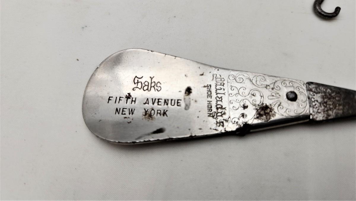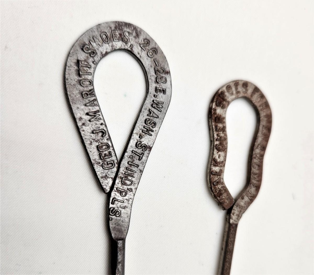 Lot of 4 turn of the century advertising button hooks with store advertising - these were just for high-button shoes. The large one is a shoehorn/button hook combo that folds down in the center - the other three are stationary. Large on is from SAKS - 5" long. The small ones are about 3.5" - Geo. J. Marriott Shoes, Indianapolis, 26-28 Wash. St, and WalkOver Shoes for Women (no address). Antique condition - some rusting, but advertising is readable. I would be willing to ship these - you pay priority postage.