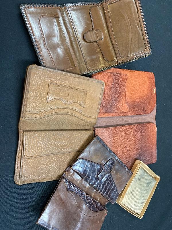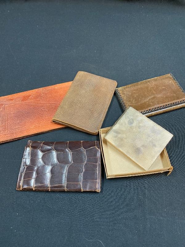 Vintage gold money clip w box and four leather men’s wallets. Please see all pictures for condition of the items listed and what is included in the lot. Pictures will also show any measurements if taken and is the best representation of the items. Thank you for looking and have fun bidding! We appreciate Treasure Hunters!
