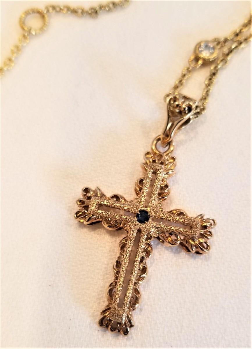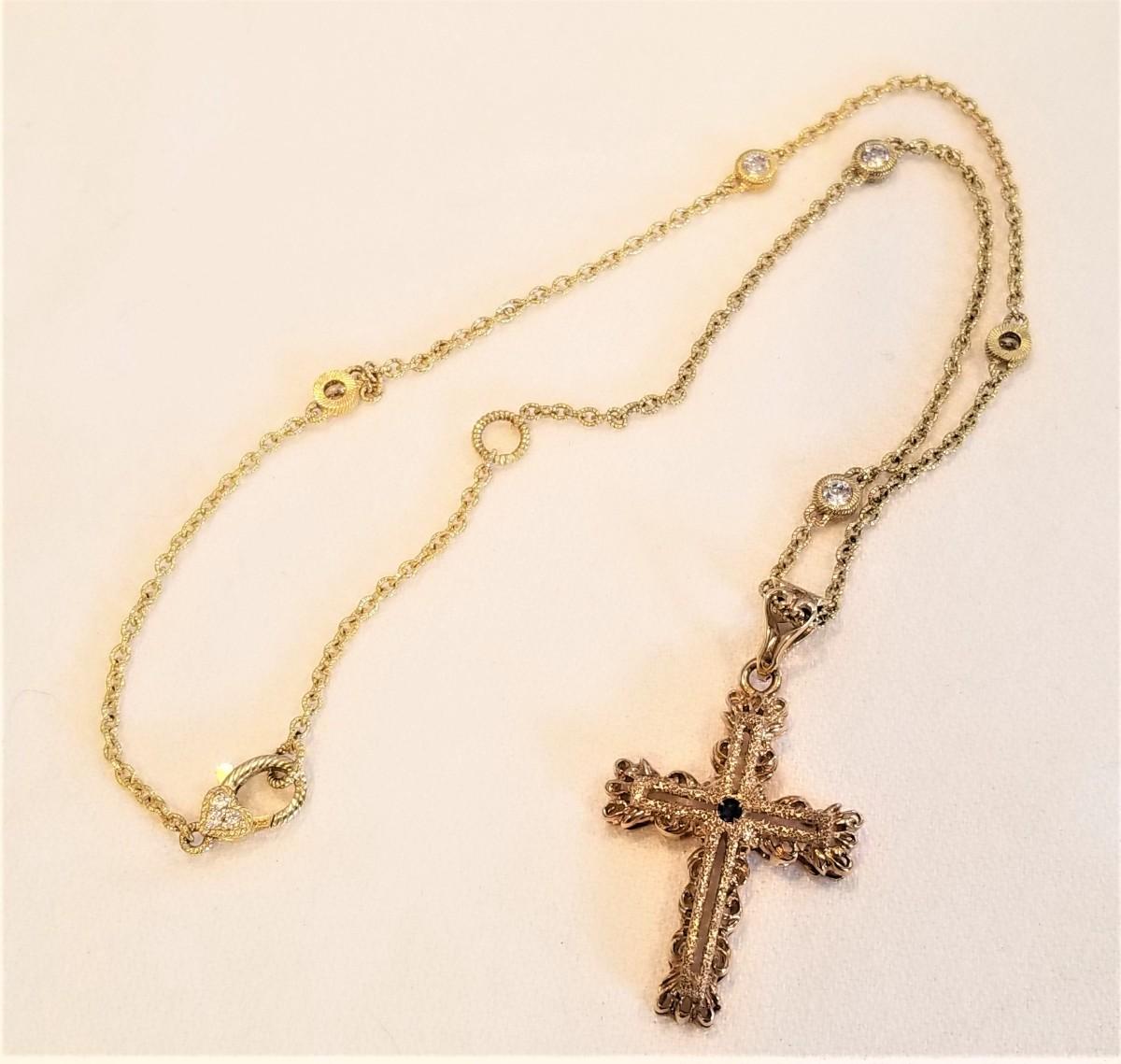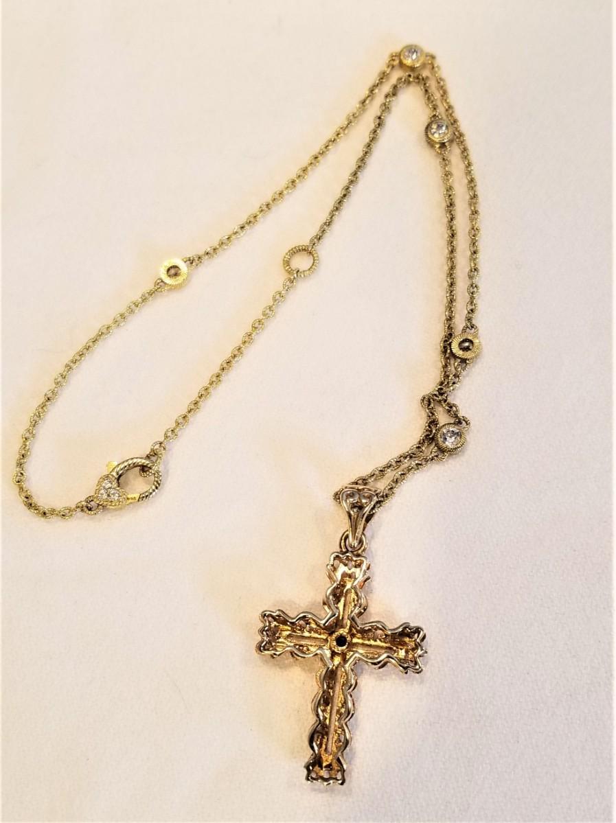 Set with CZs - very pretty baroque style cross pendant on more contemporary chain (15" long) - cross is 1" x .75". Gold plated over Sterling Silver. Looks a lot more expensive than it is. Good condition.