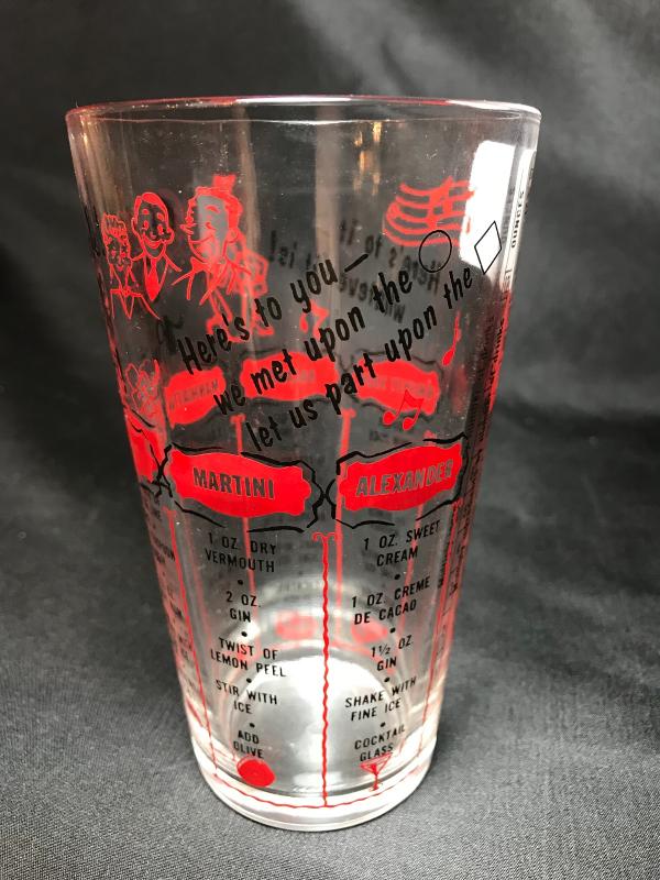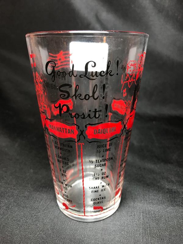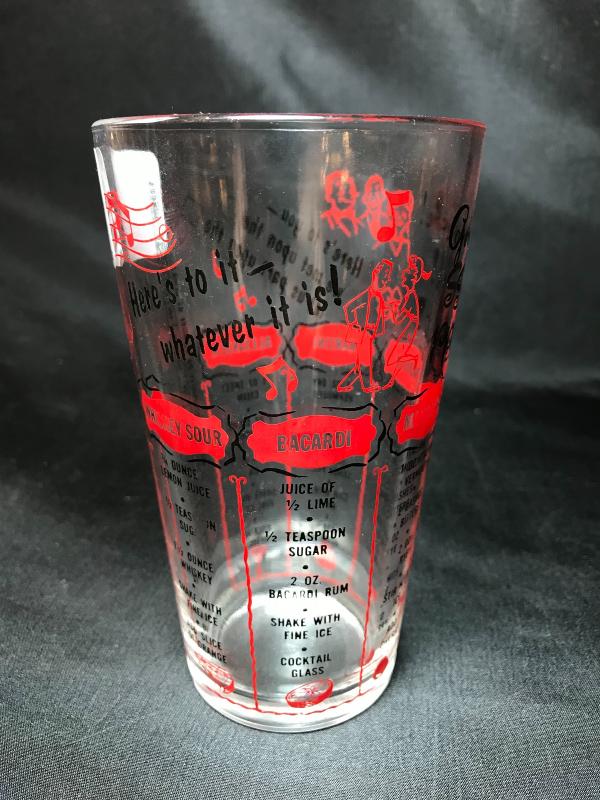 1950s Federal Glass cocktail shaker. Says "Here's to it-whatever it is", "Good Luck!, Skol!, Prosit!", and "Here's to you- we met upon the circle lut us part upon the square." Has recipies for whisky sour, bacardi, manhattan, daiquiri, martini, and alexander. Black and red designs in great condition. Holds 12 oz. 6" H