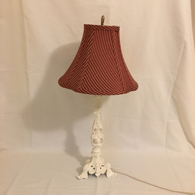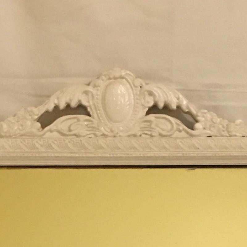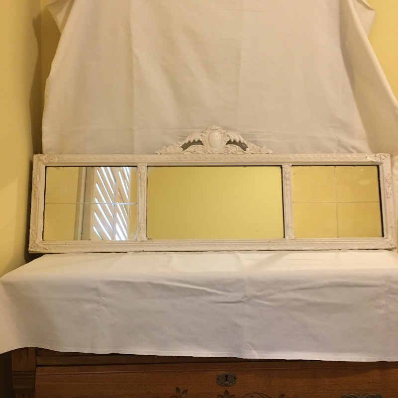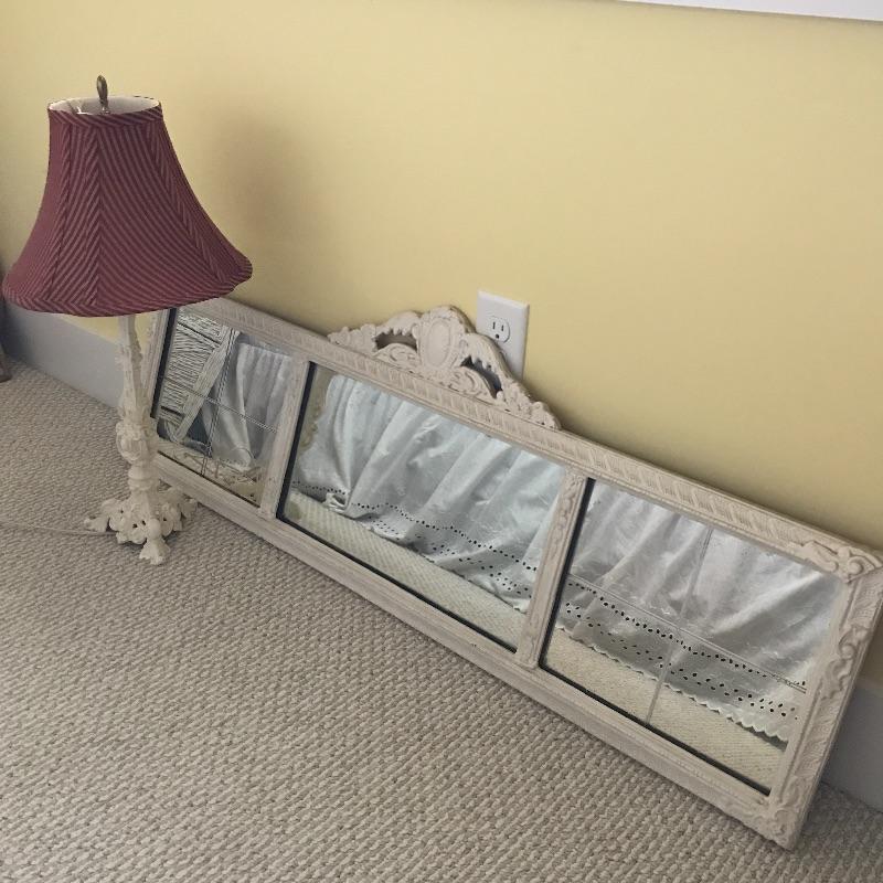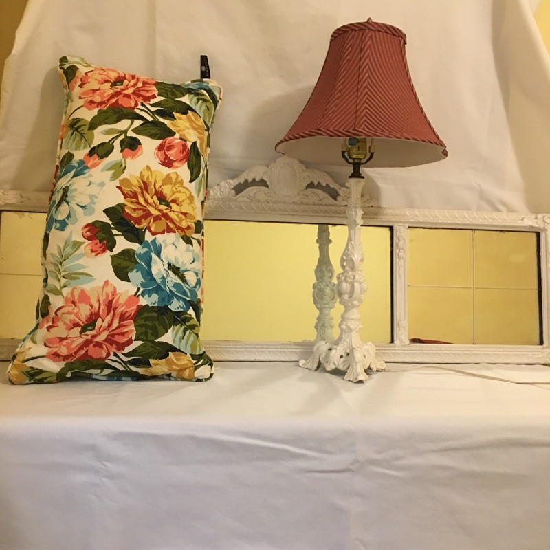 Two great accent pieces with this vintage style mirror and lamp. Both are white and would make a lovely addition to a bathroom or bedroom. The details on the mirror look like wood but are a hard plastic material. Also included is a pretty floral accent pillow and the lamp which does work has a red shade. Mirror measures 16” x 45.5”.