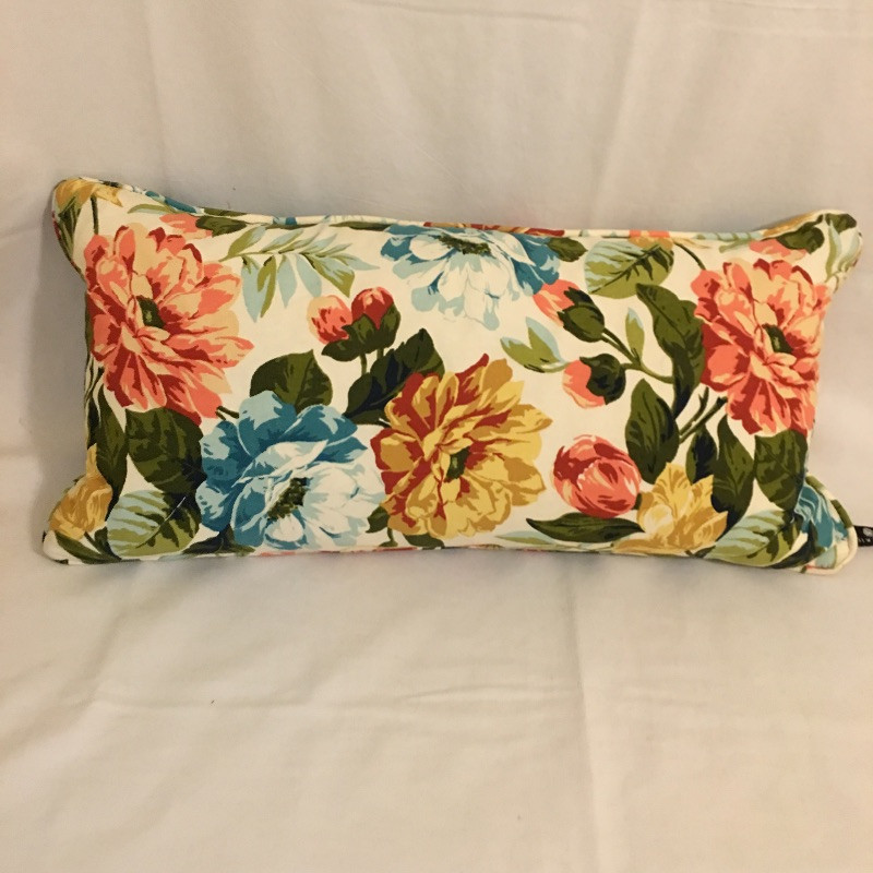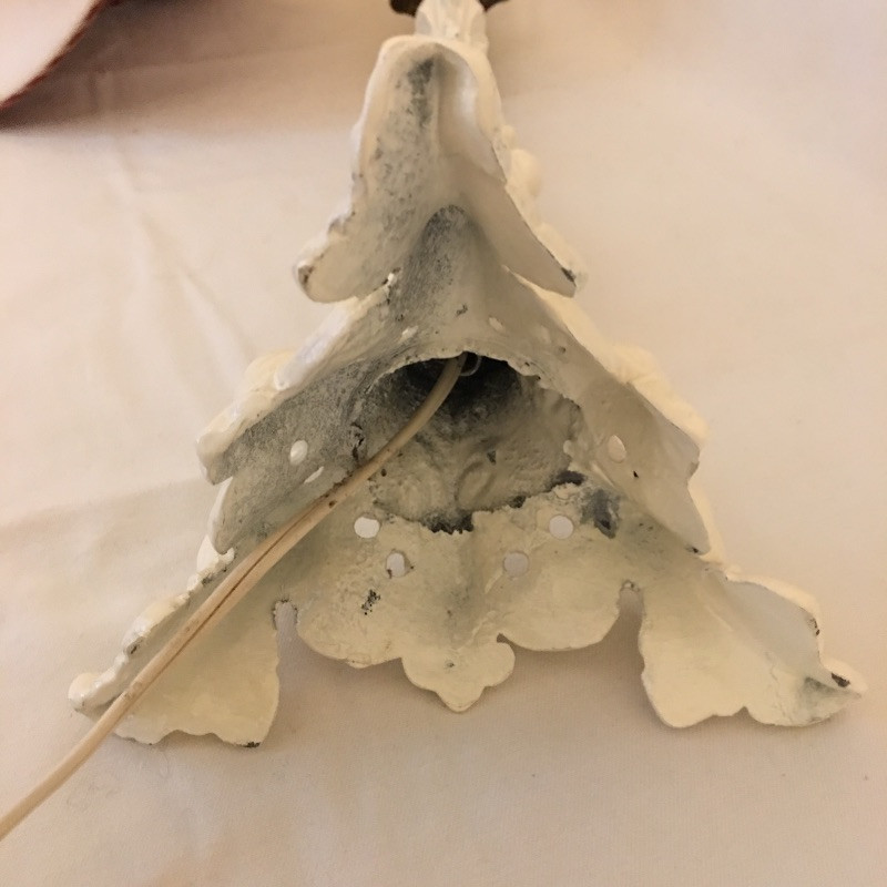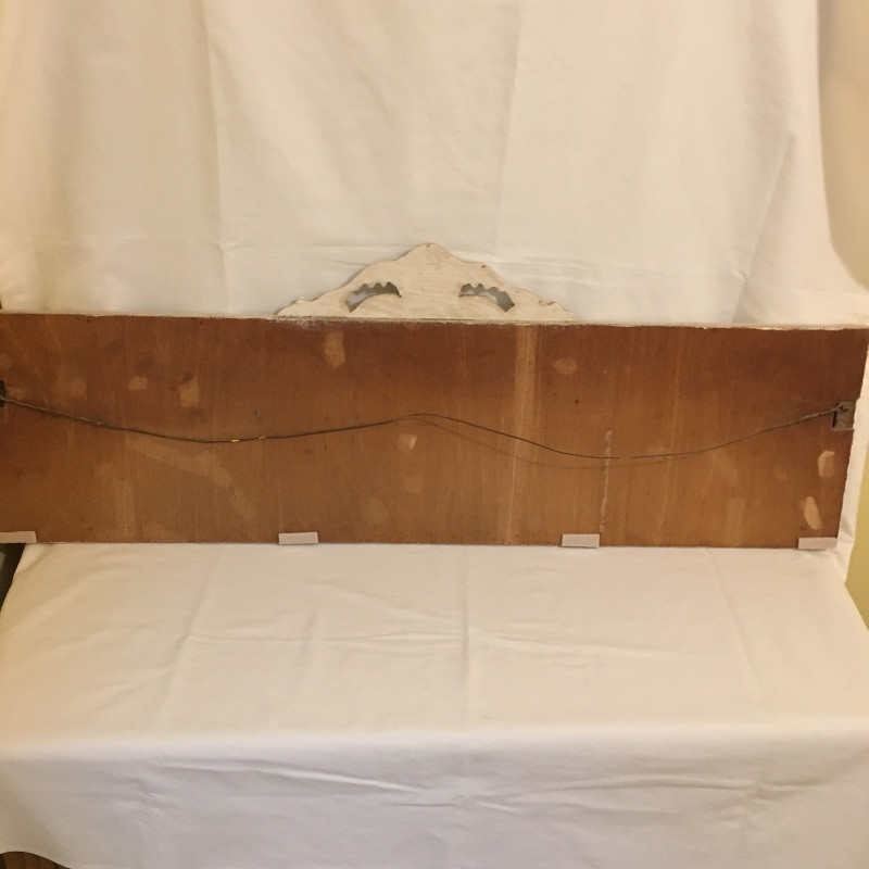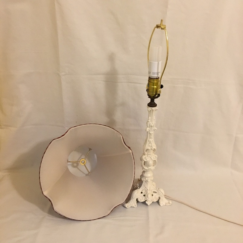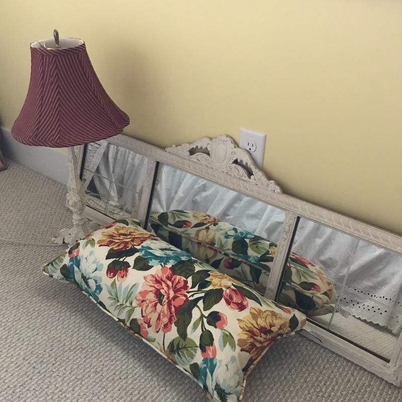 Two great accent pieces with this vintage style mirror and lamp. Both are white and would make a lovely addition to a bathroom or bedroom. The details on the mirror look like wood but are a hard plastic material. Also included is a pretty floral accent pillow and the lamp which does work has a red shade. Mirror measures 16” x 45.5”.