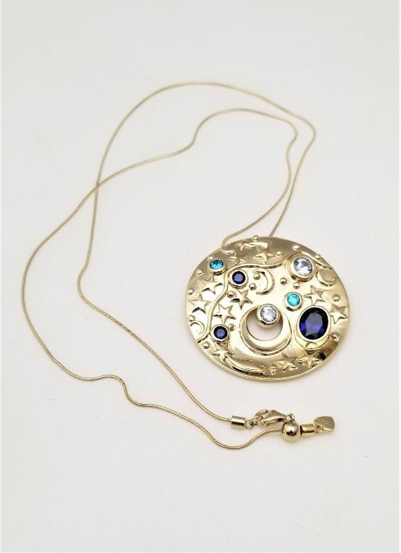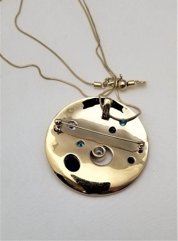 Designed by TOVA, here is a modernistic necklace/brooch combo - solid sterling silver overlayed by gold. Lovely, fluid ADJUSTABLE chain allows you to set the length. The pendant is easily removed and can be worn by itself as a brooch. Stones are colored CZs. Pendant measures 2 inches across. 24 inch chain can be adjusted downward. Weighs 1.18 ounces.