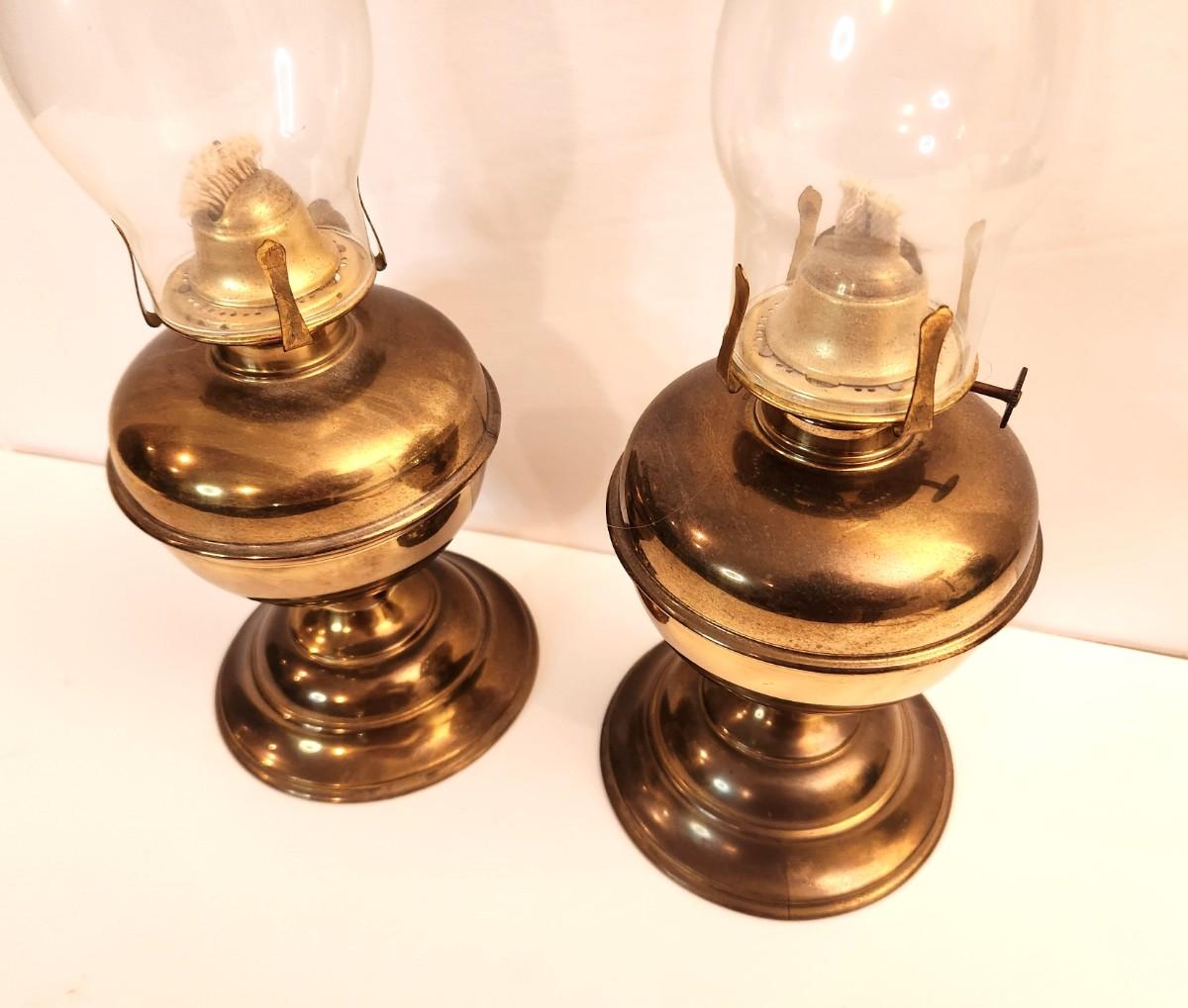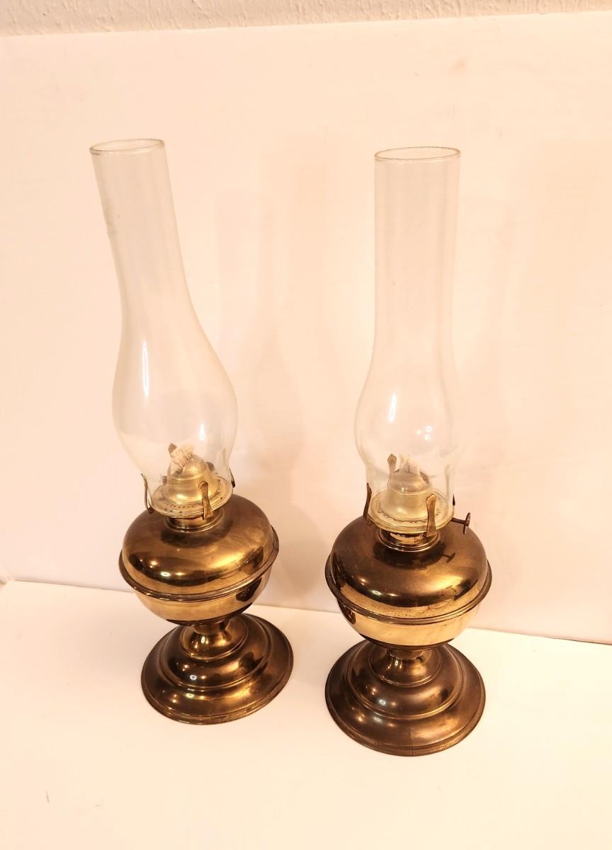 Nice Pair of Contemporary Brass oil lamps with glass shades, each 17.5" tall. Good condition.