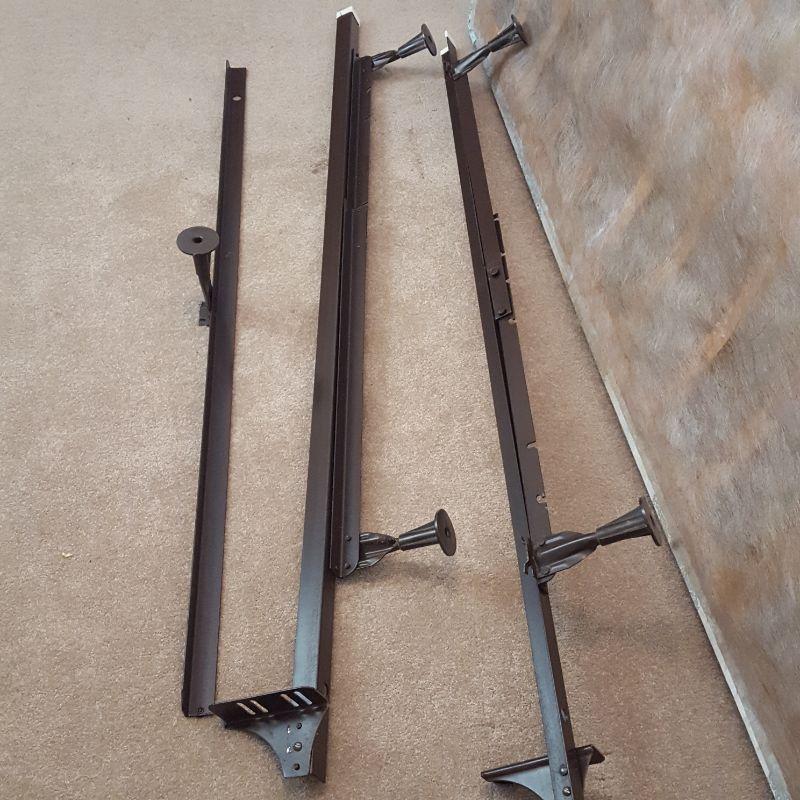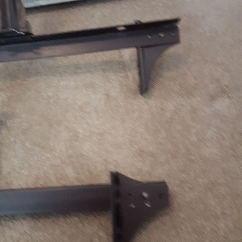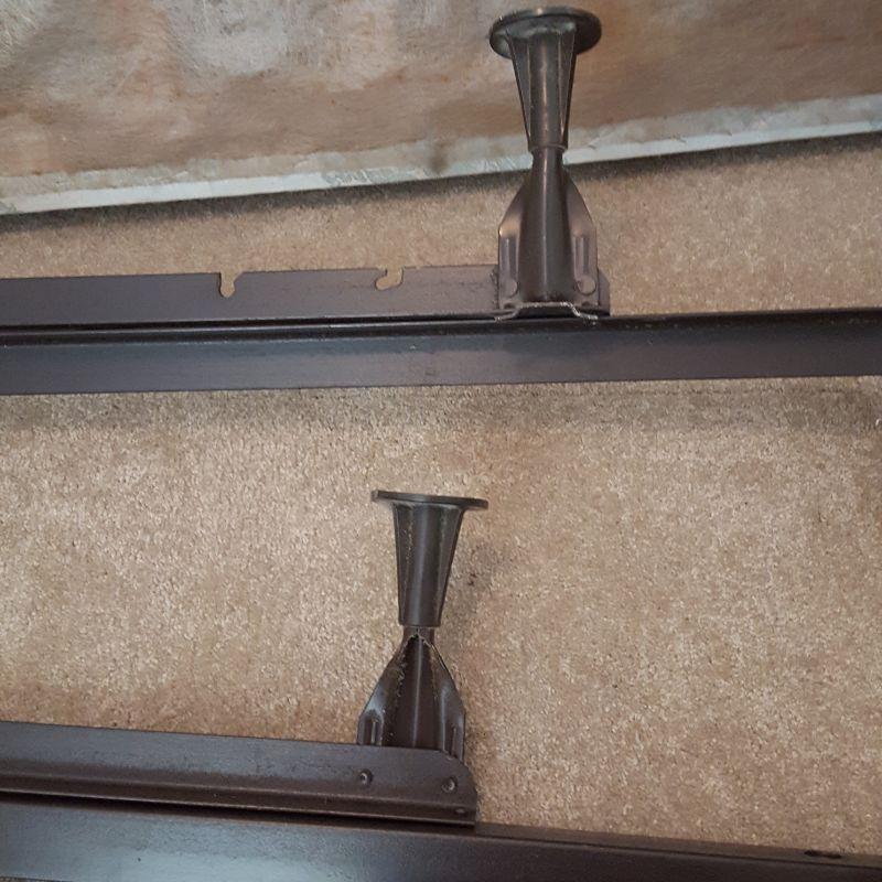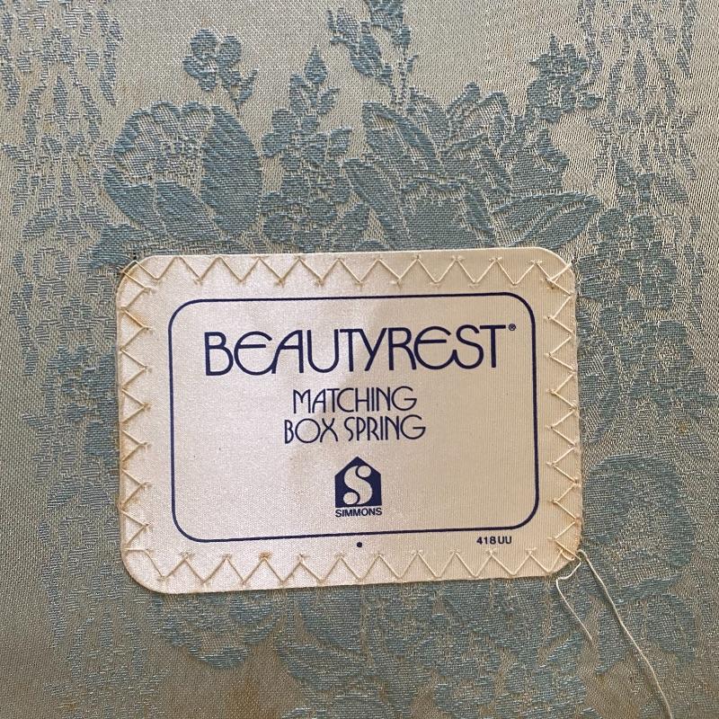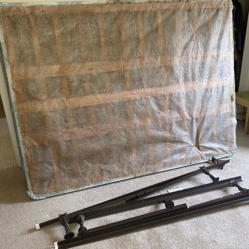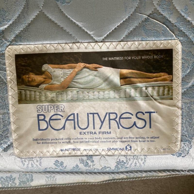 This lot contains a Queen size metal bed frame. The three pieces fit together to hold a box spring and mattress. The feet on the frame appear to be in good condition. The frame comes with a free Beautyrest box spring and mattress. Includes a foam egg carton type mattress pad as a bonus for comfort. The mattress and boxspring appear to be in good condition. A few small stains of edges of boxspring. Local pick up only.