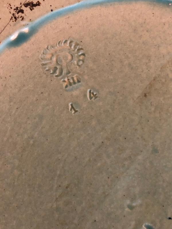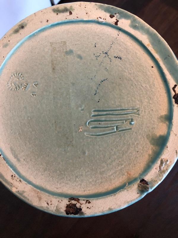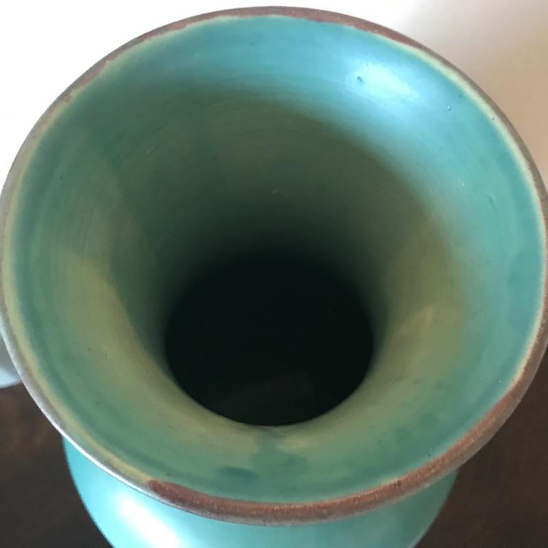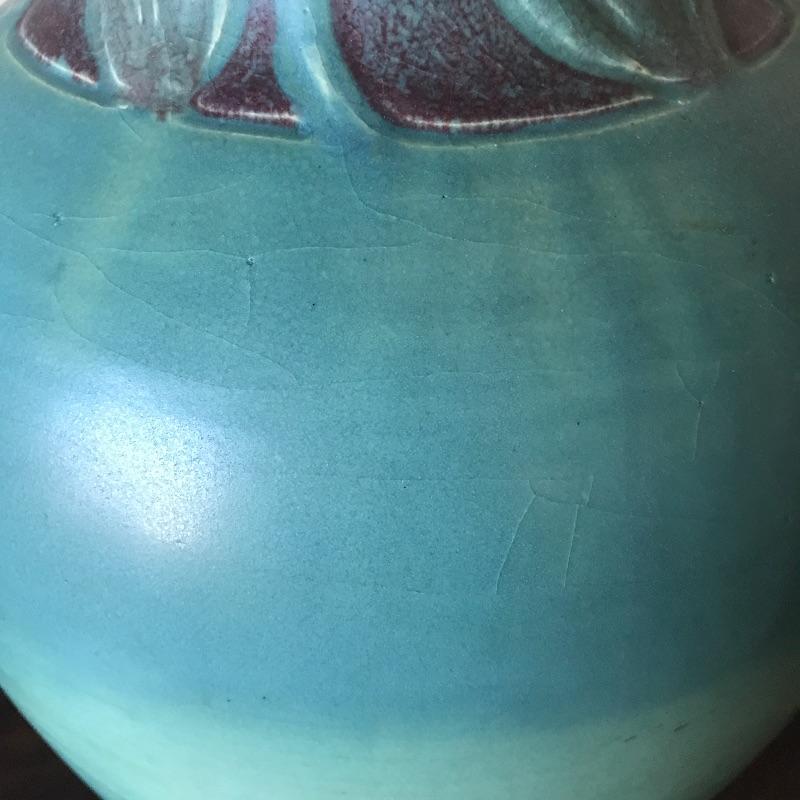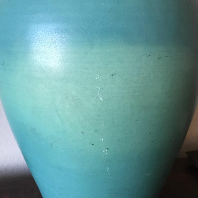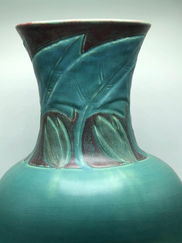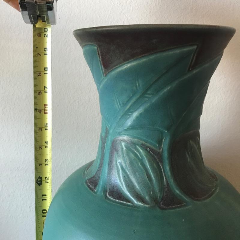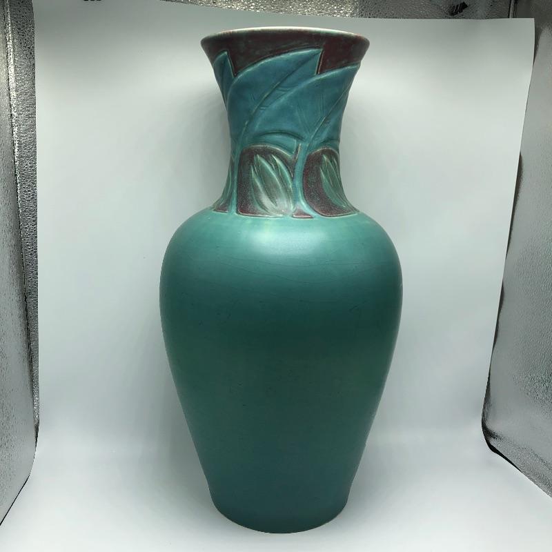 This signed large 20” tall Rookwood Vase is a teal color with burgundy and green leaves around the neck. Has a small scuff on side. See pix. .