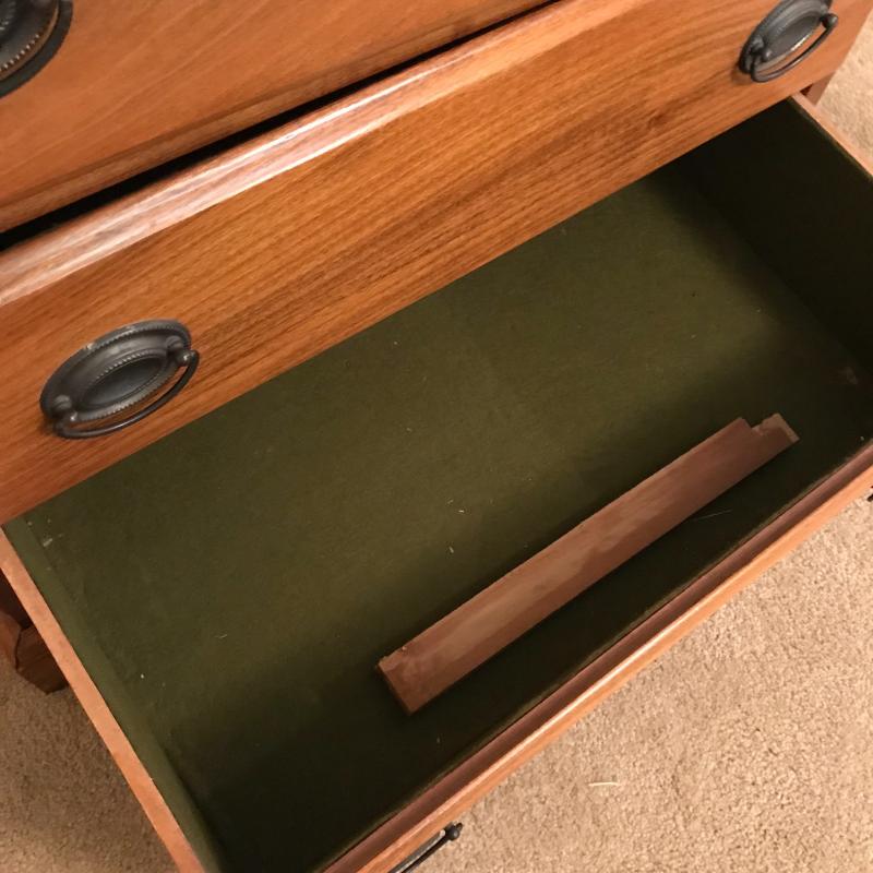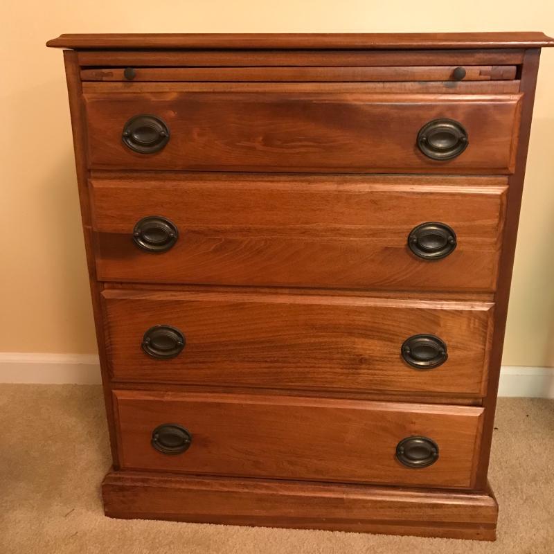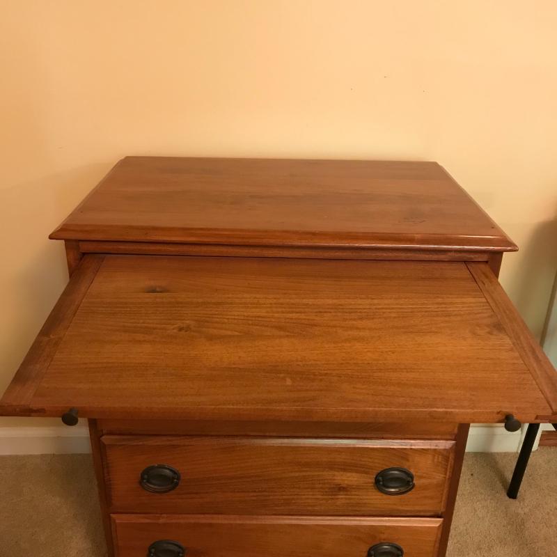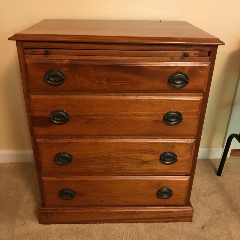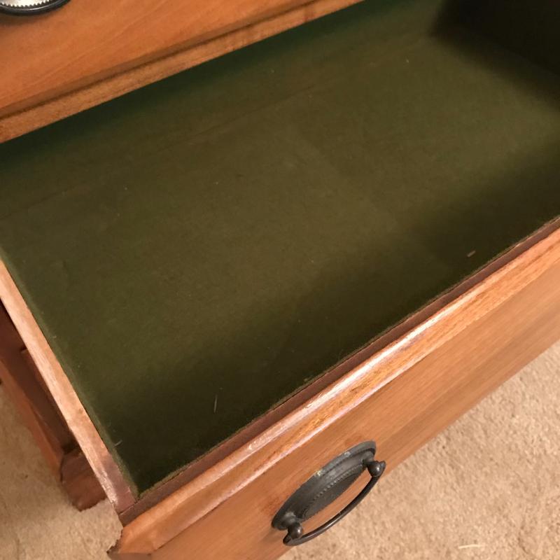Gorgeous smaller dresser measures 26”x16.75”x31” and in excellent condition. Cloth lined drawers and sliding shelf glide smoothly. Local pick up only.