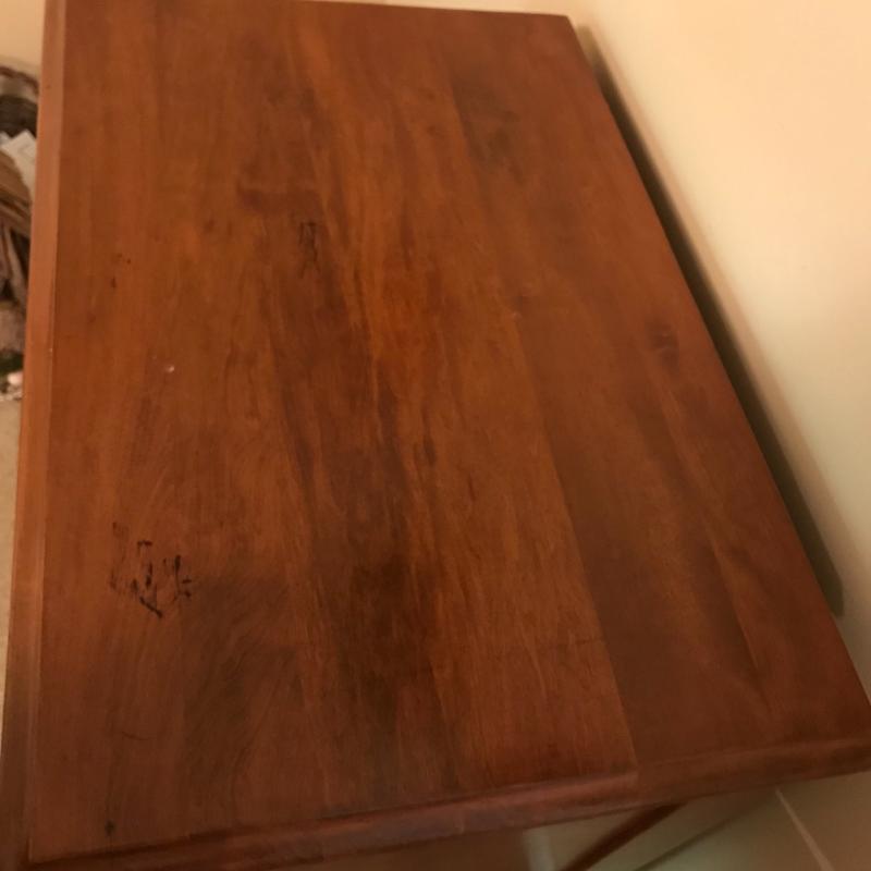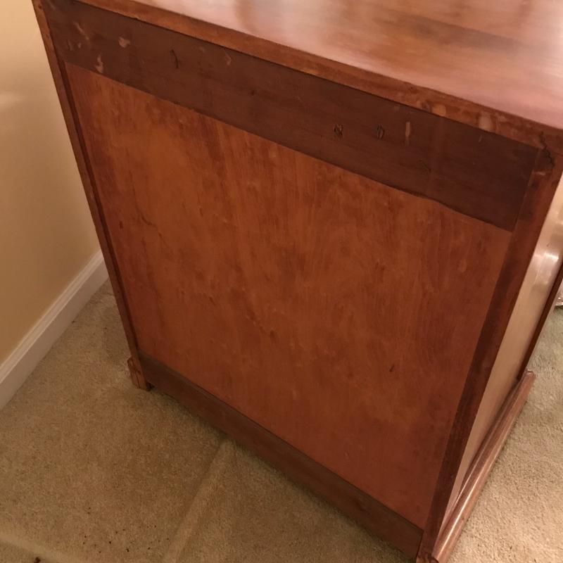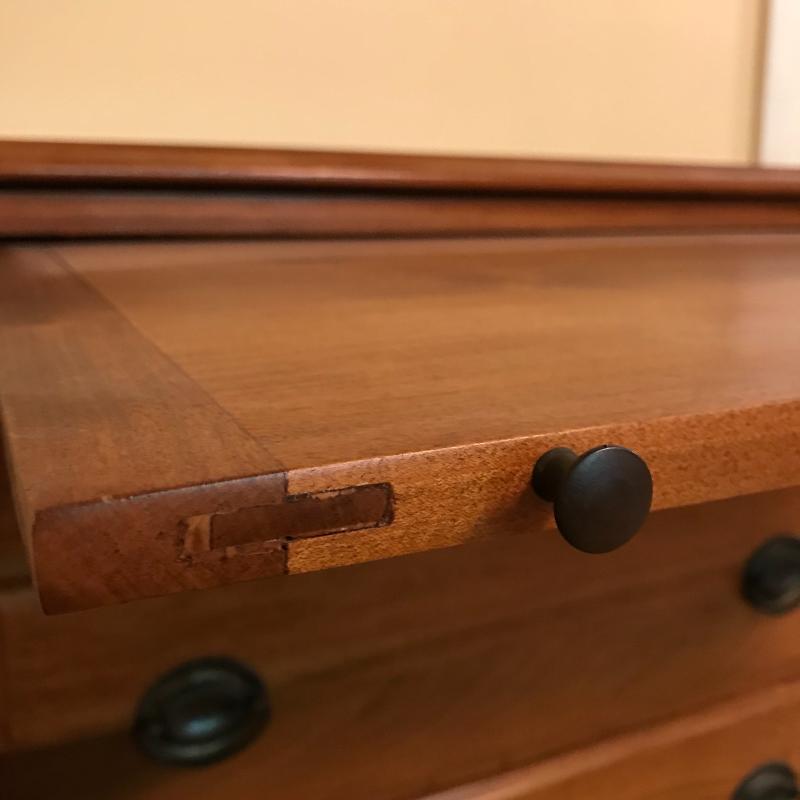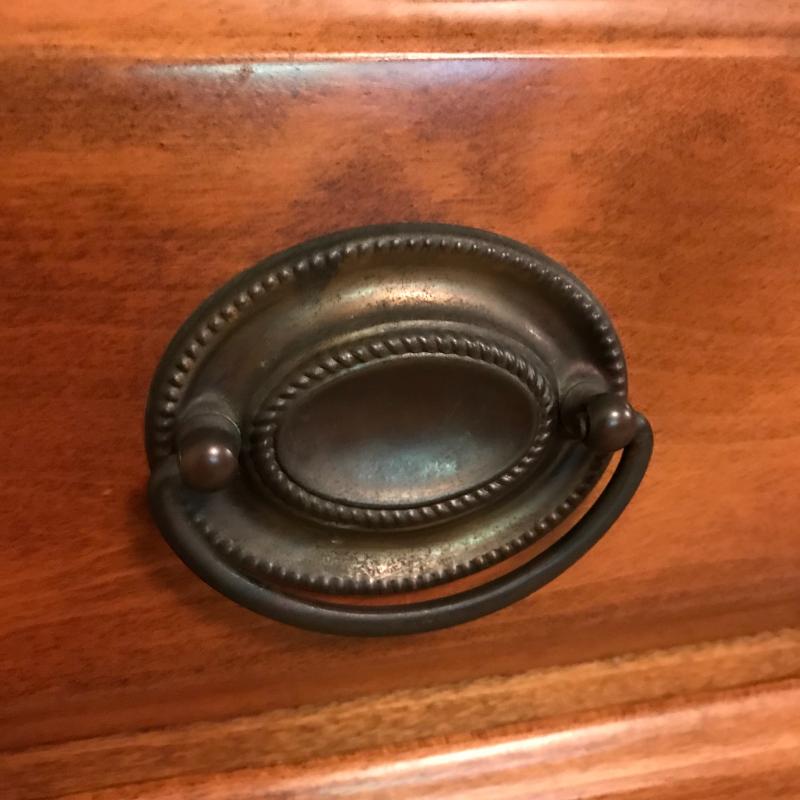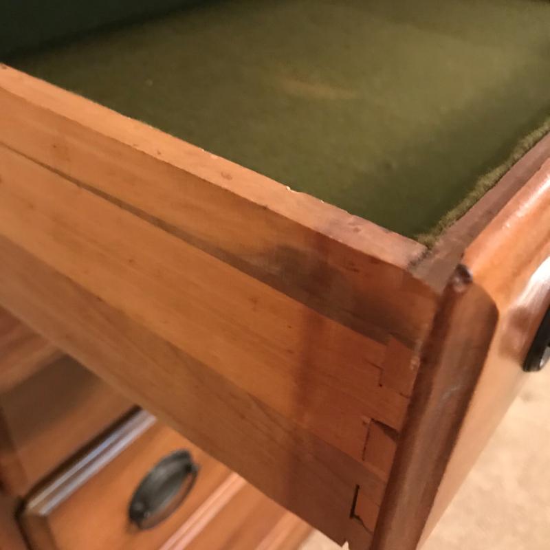 Gorgeous smaller dresser measures 26”x16.75”x31” and in excellent condition. Cloth lined drawers and sliding shelf glide smoothly. Local pick up only.