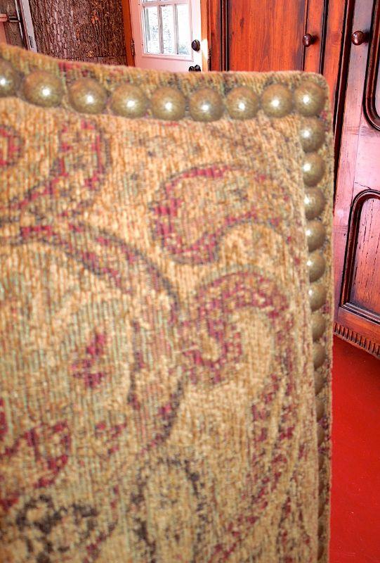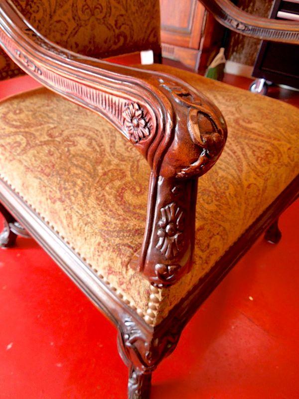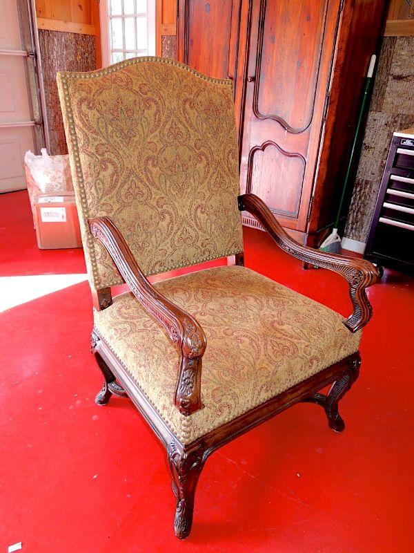Pair of identical impressive occasional chairs. Like having your own personal throne. Simple soft curves define the shaping of the arms, feet. and unique X-brace stretcher. Beautiful soft gold brocade olefin upholstery with carved mahogany stained wood arms and legs. Brass studs along back and edge of seat. Manufactured in 2009 in USA.