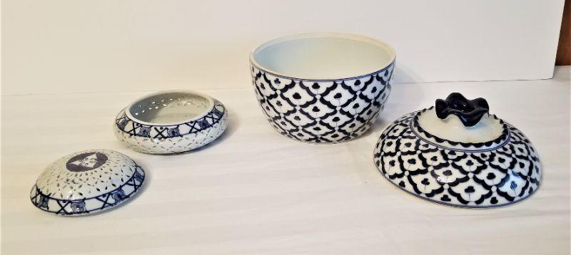Blue and White is always a classic. You get both pieces - Large Jar with lid, 6" tall, and 2.5" tall pierced trinket box (Bombay Company). Both in good condition.