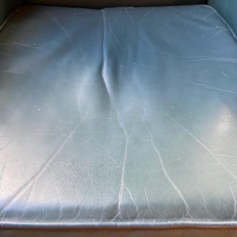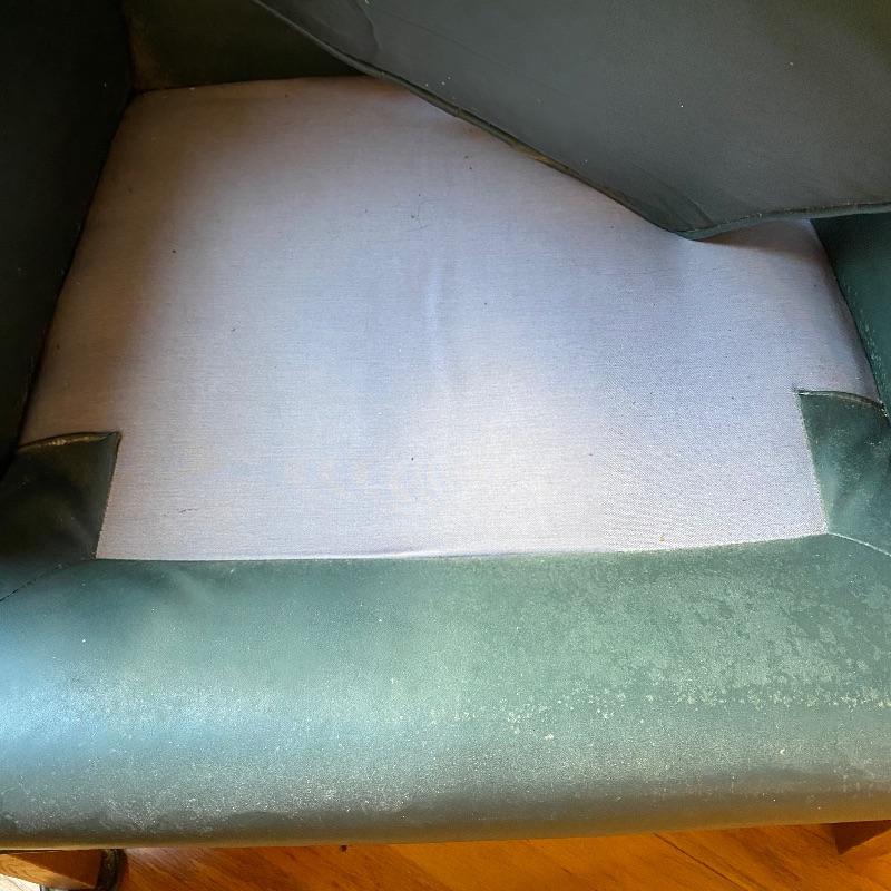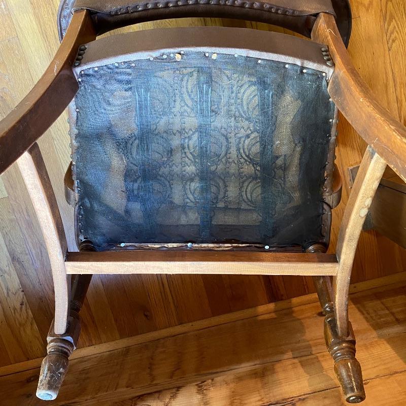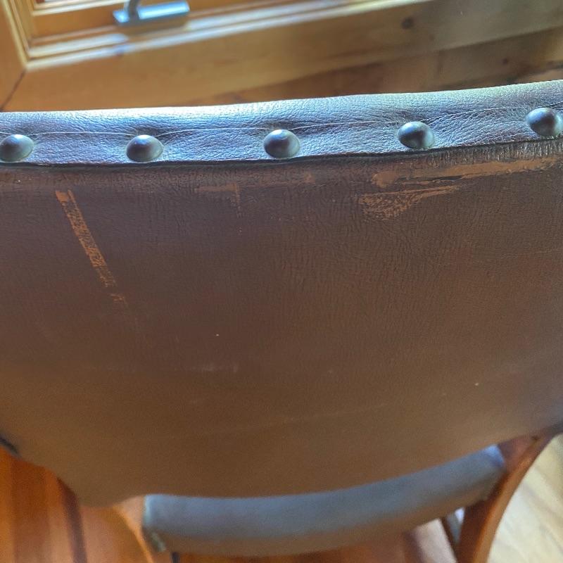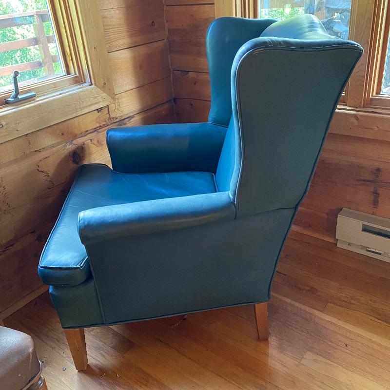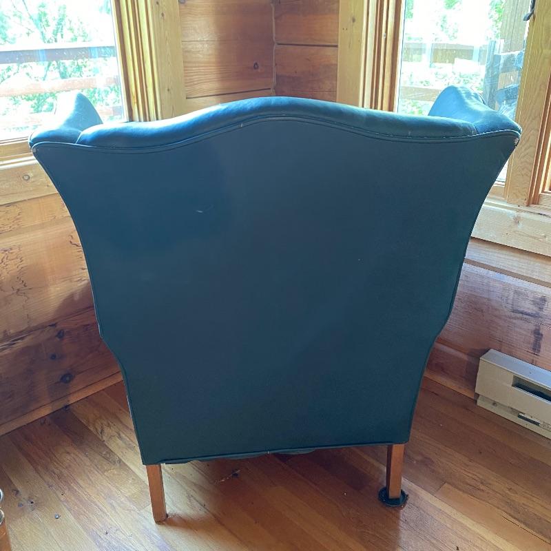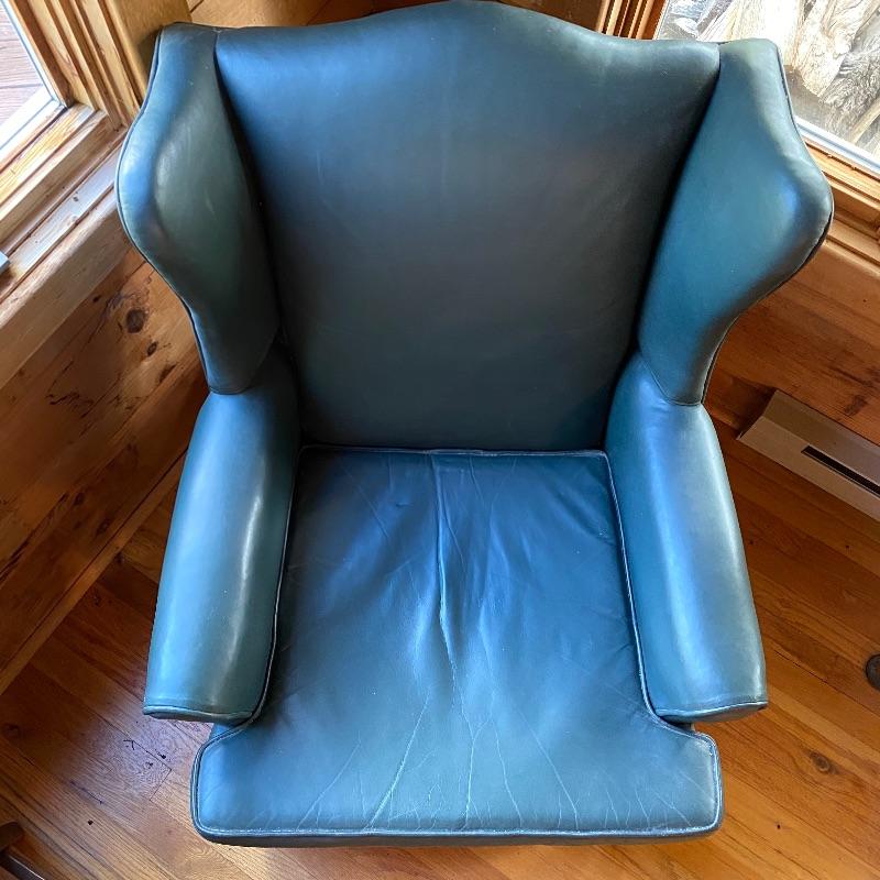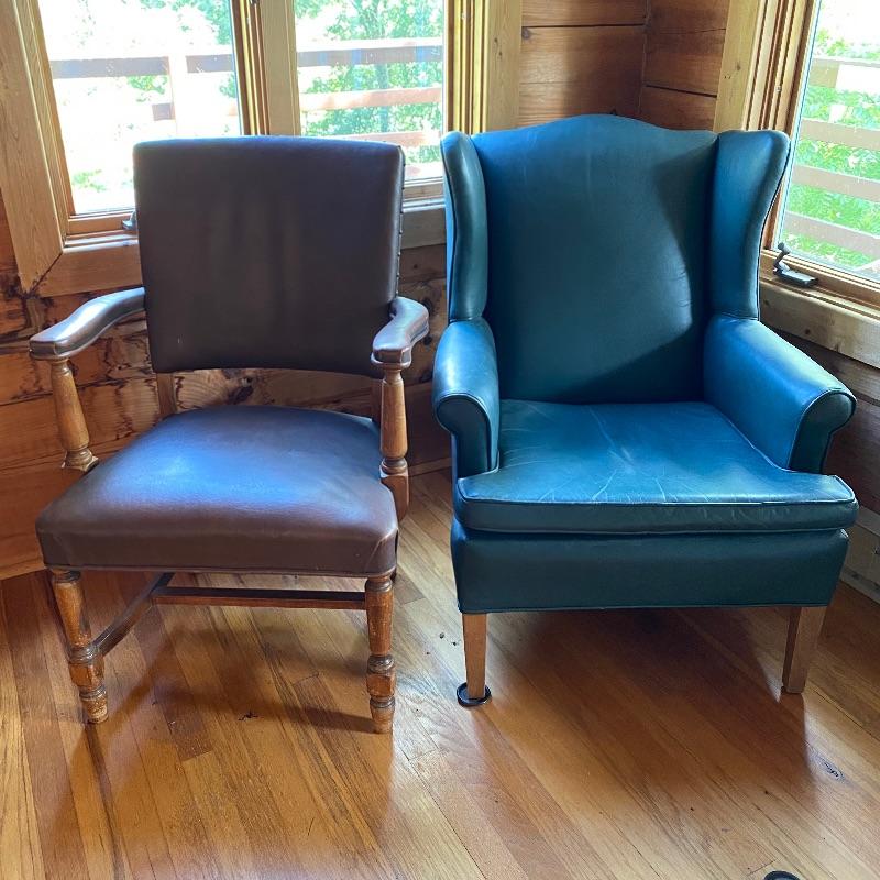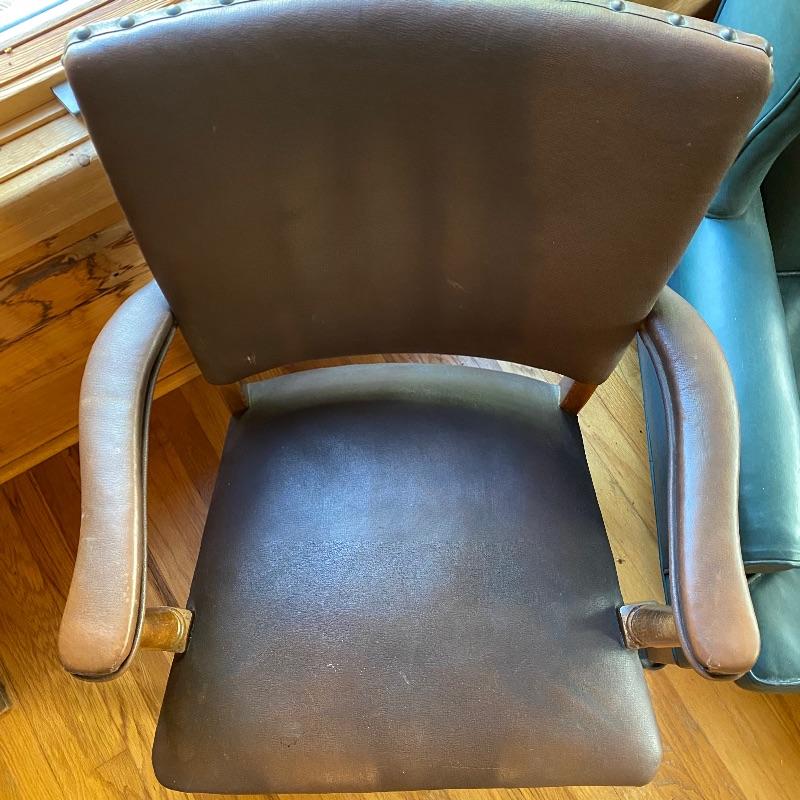Two great sturdy chairs to make your study look more intellectual. The brown and wood one has some great metal button detail. The teal green one is a high back comfy chair that’s perfect to spruce up your office. Both are a little worn but no obvious tears, just character. A little cleaning and live would do wonders. Brown measures approximately 23” x 20” x 36” and Green measures 27” x 32” x 36”. Both seats are 17” from floor. Unsure of material...Possible vinyl? No shipping.