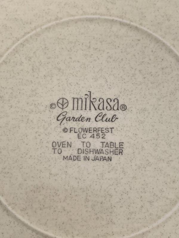 Groovy, 1970’s stoneware dinnerware set by Mikasa. Pattern is Garden Club FLOWERFEST, featuring bright, bold orange flowers and scalloped edges on main plates and bowls. Serving pieces are speckled bone color with golden brown accents. Set in includes 6 dinner plates (11”), 6 salad /bread plates (8”), 6 cereal /soup bowls 8 3/8”), 8 cups, covered sugar, open creamer, covered tureen, covered gravy with under plate and covered butter dish. Excellent condition with no cracks, chips or heavy utensil marks. Total 35 pcs.