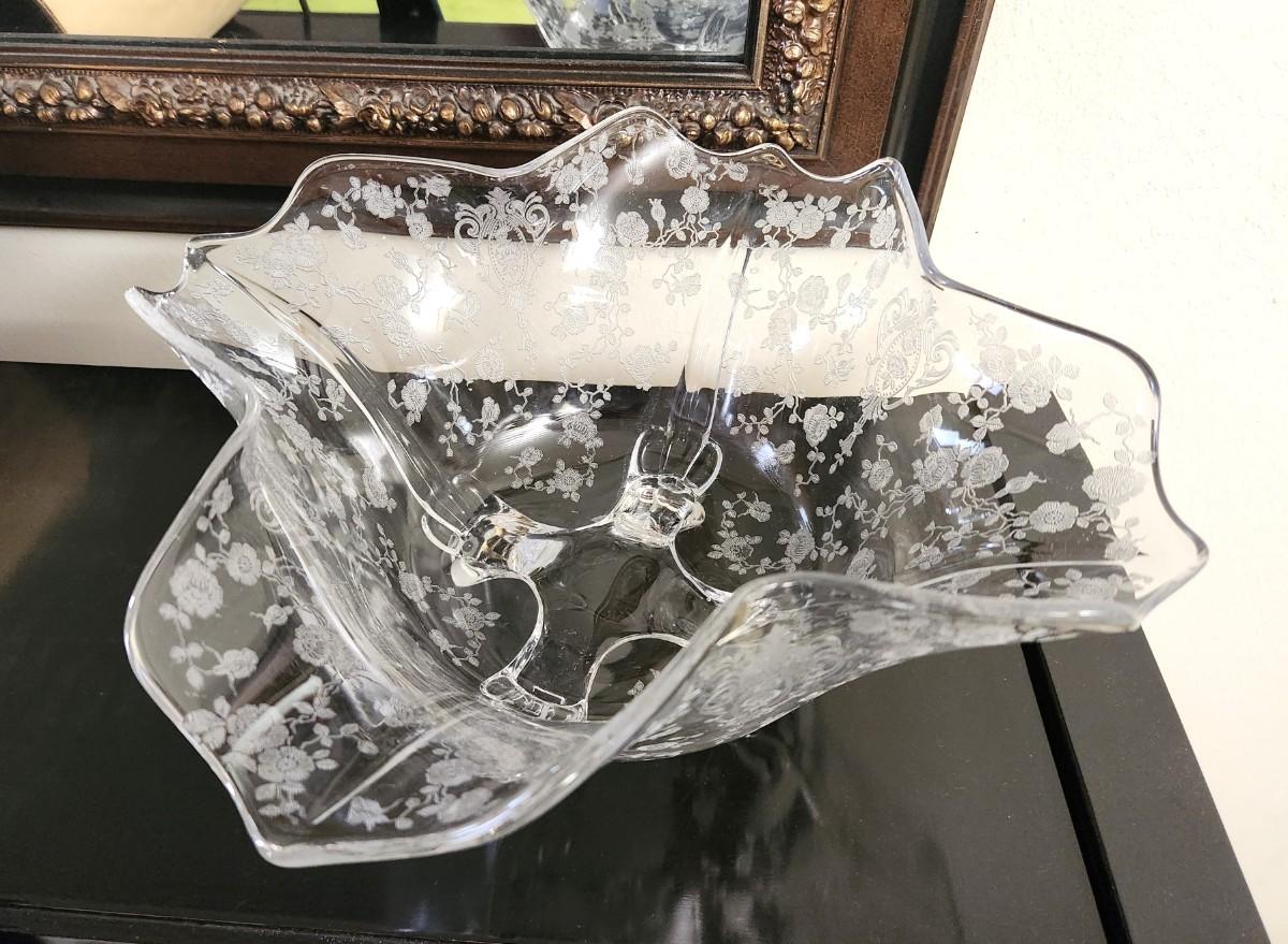 Here's a real beauty - Cambridge Glass - popular "Rose Point" pattern footed bowl - great condition - 11.5" across, 6" tall.