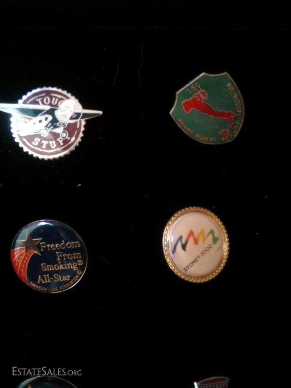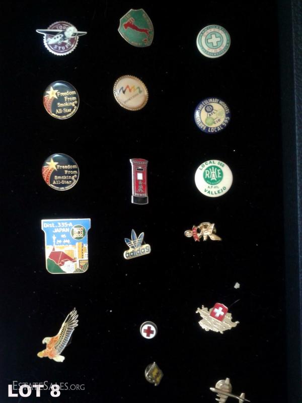 Lot 8 is our last lot for this type of item. This eclectic gathering of pins features unique moments in American history, sports, psa's, and nostalgia. There are 5 examples of foreign pins (Italy - slight wear on surface of pin with scratches, 2 Switzerland, a rare Lion's Club Japanese pin and a small pin of Scotland's yellow flag and red lion); 3 vintage labor-relations pins (AFLCIO - blue pin has slight discoloration and CFC 10-year service pin); 2 sports related pins (vintage enamel-coated addidas and Sydney 2000 Olympics pin, both with slight discoloration of the enamel) and 6 miscellaneous pins (from American Lung Association, an old school mailbox and a gold-plated plane pin). All in excellent condition except already-noted enamel discolorations and scratches on surface of Italian pin. Interestingly enough, the blue background version of the Sydney Olympics pin featured here sold recently at auction on ebay for $52! Any of these pins would make an excellent addition to a collection. Only the Switzerland (state) and Sydney pins are missing their backing.