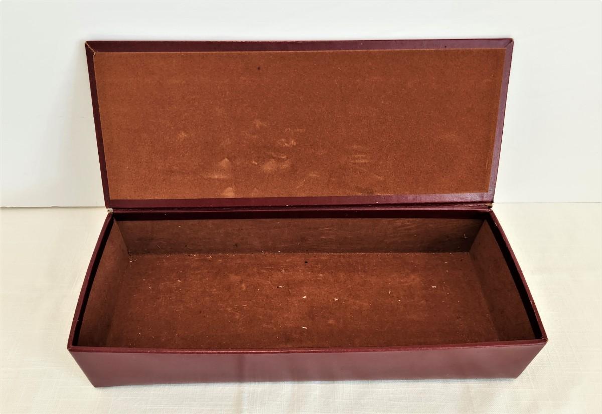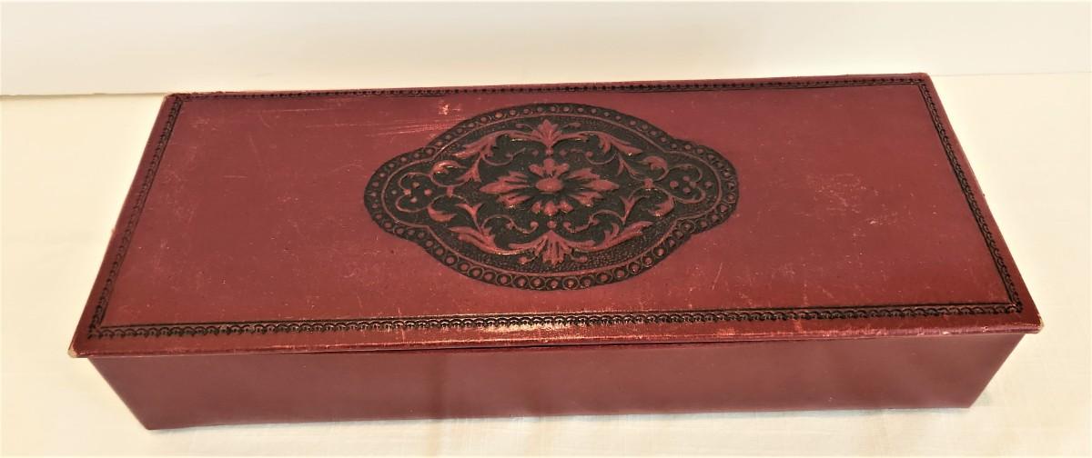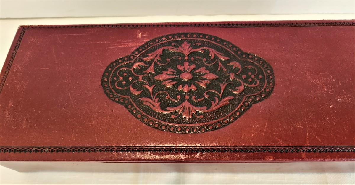 Vintage red leatherette box - embossed design on time - vintage condition. 2.5" tall, 13" across, 5" deep.