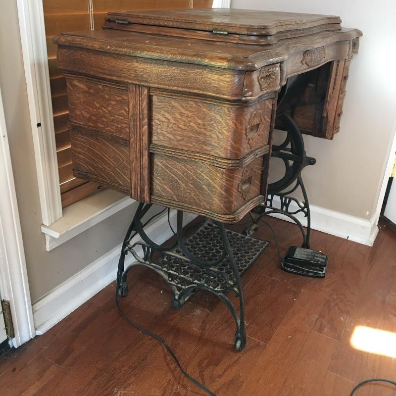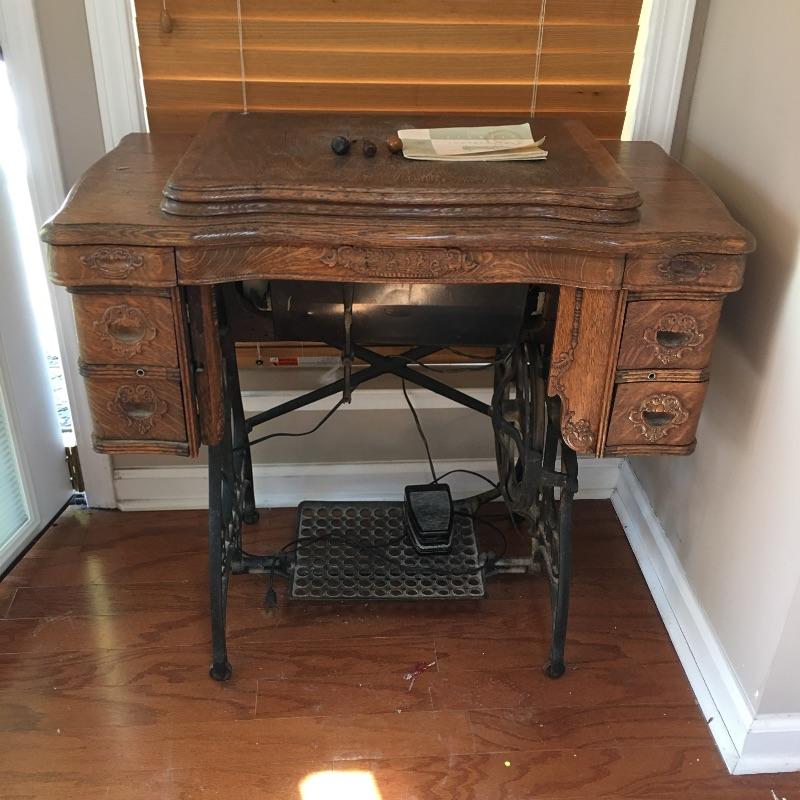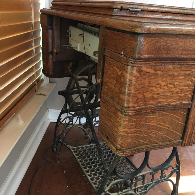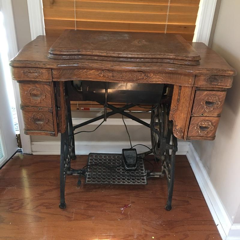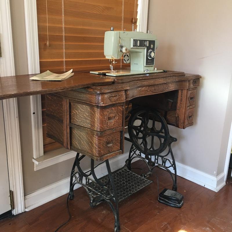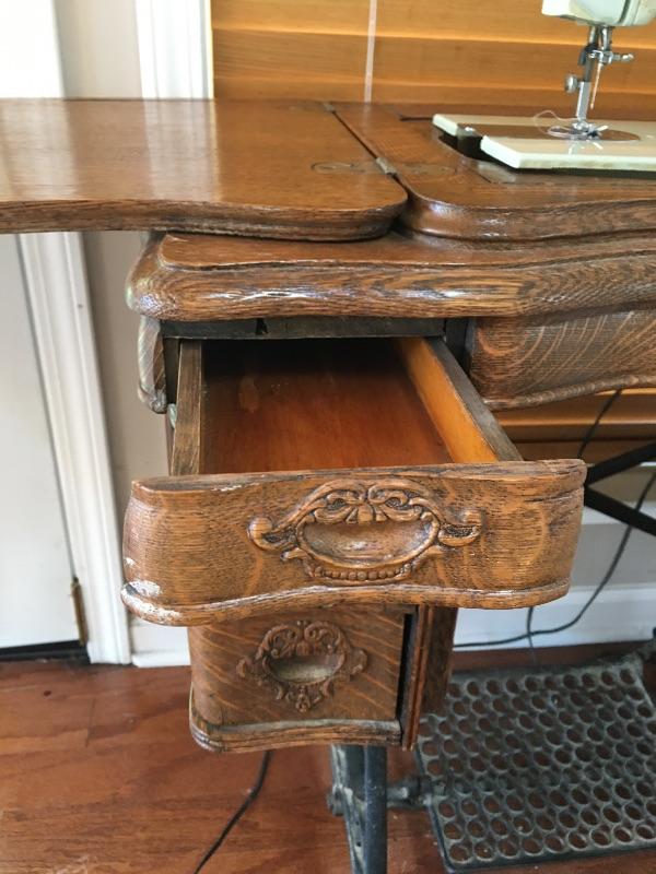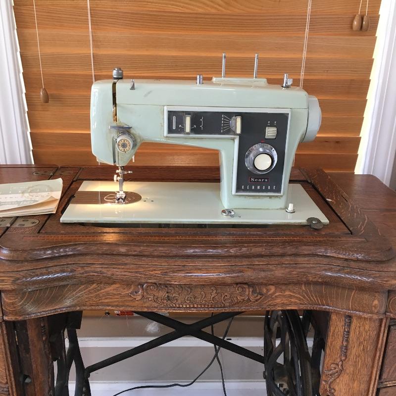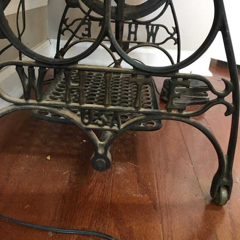 Mix old with new with this antique White treadle sewing table with a Kenmore electric sewing machine fitted inside. Sewing machine worked when tested. Cabinet is in nice shape except on the top. There is a spot where veneer has a hole in it and is scratched, see pictures.