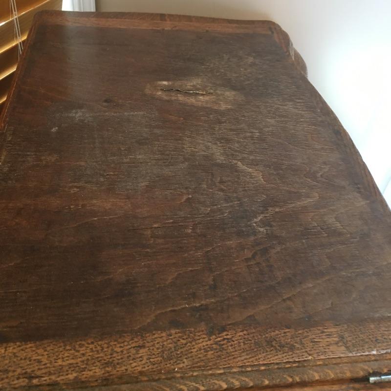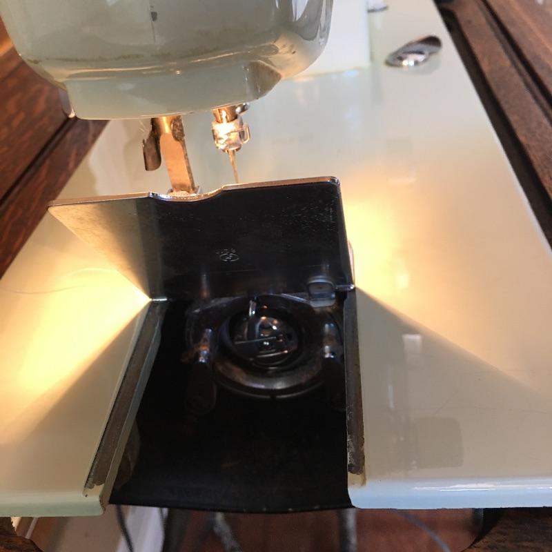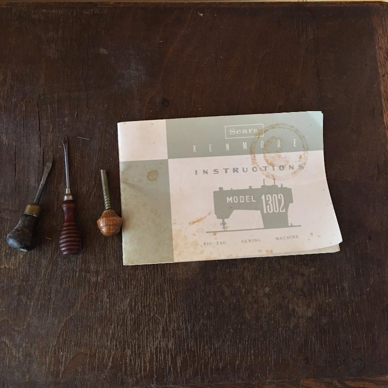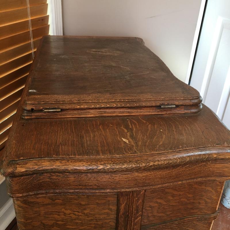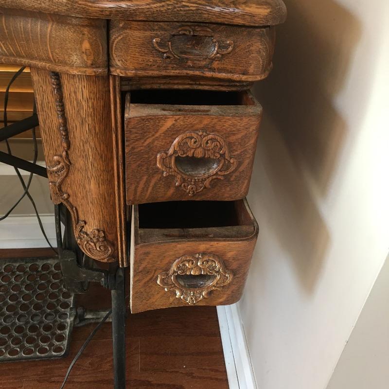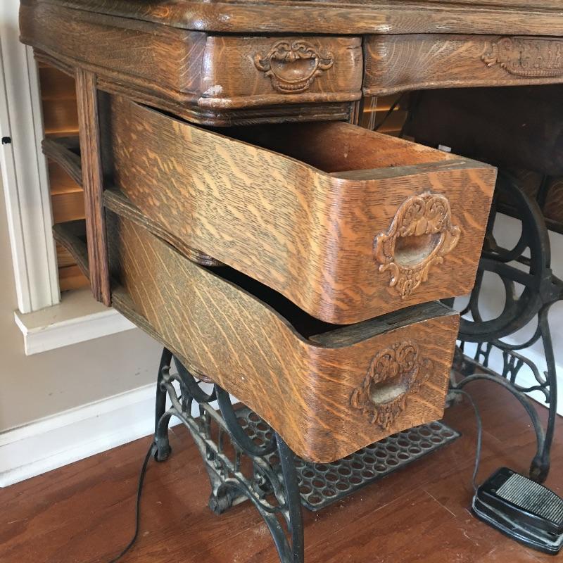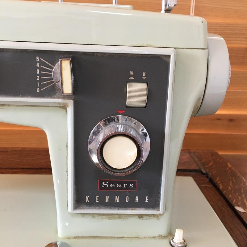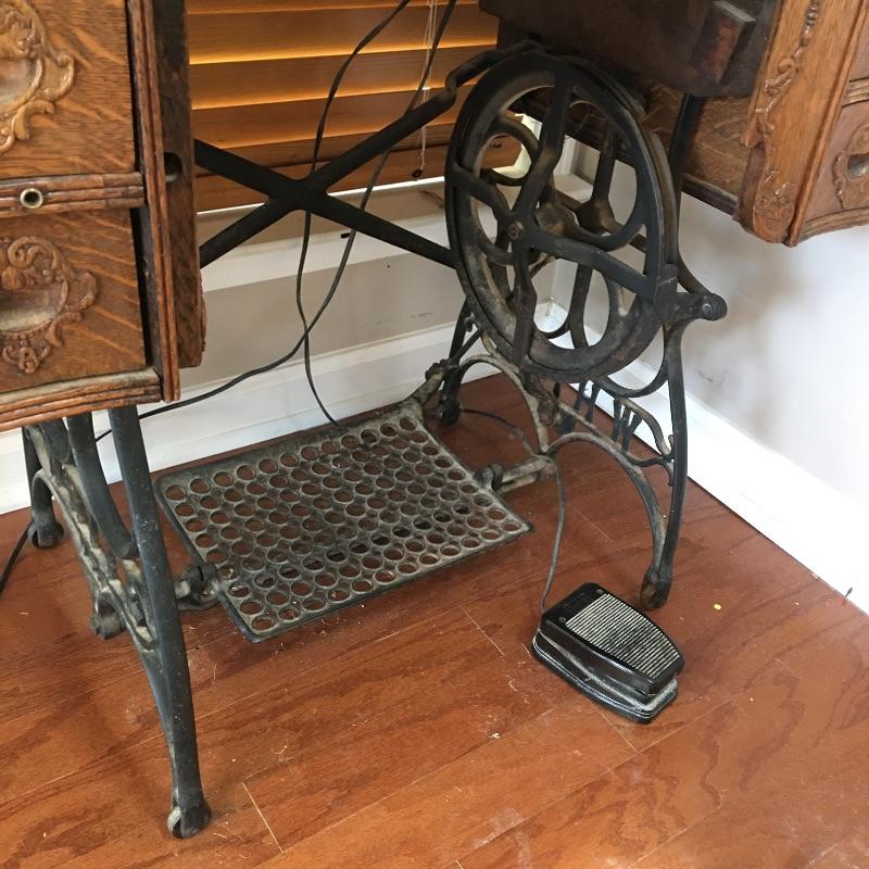 Mix old with new with this antique White treadle sewing table with a Kenmore electric sewing machine fitted inside. Sewing machine worked when tested. Cabinet is in nice shape except on the top. There is a spot where veneer has a hole in it and is scratched, see pictures.