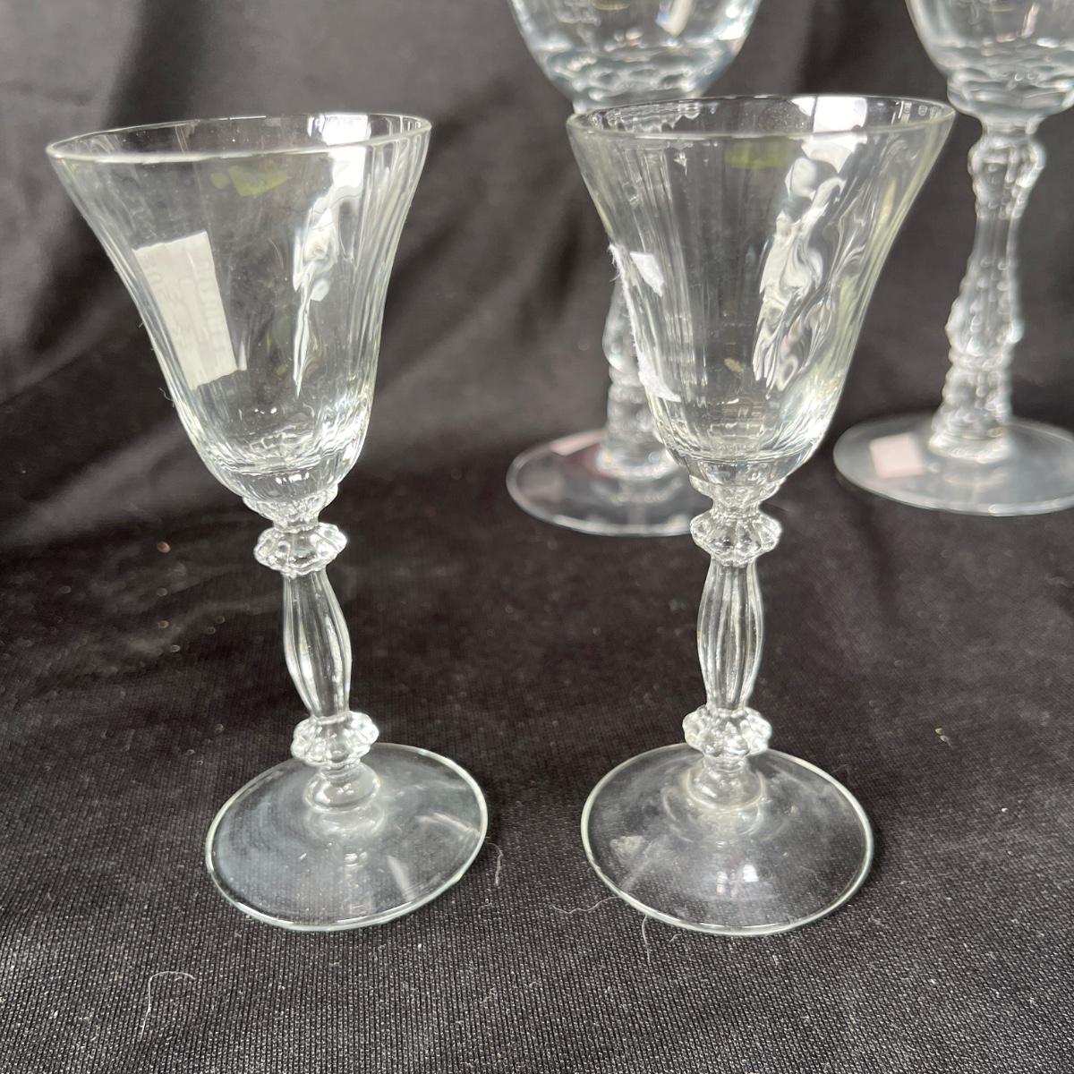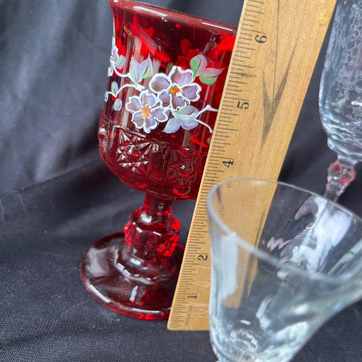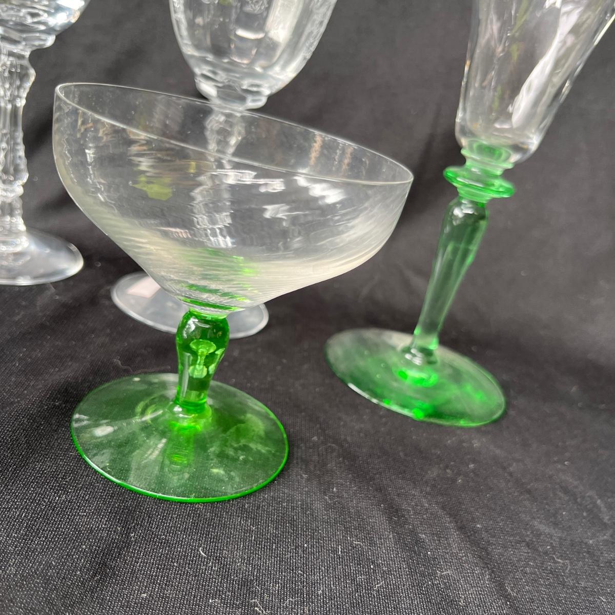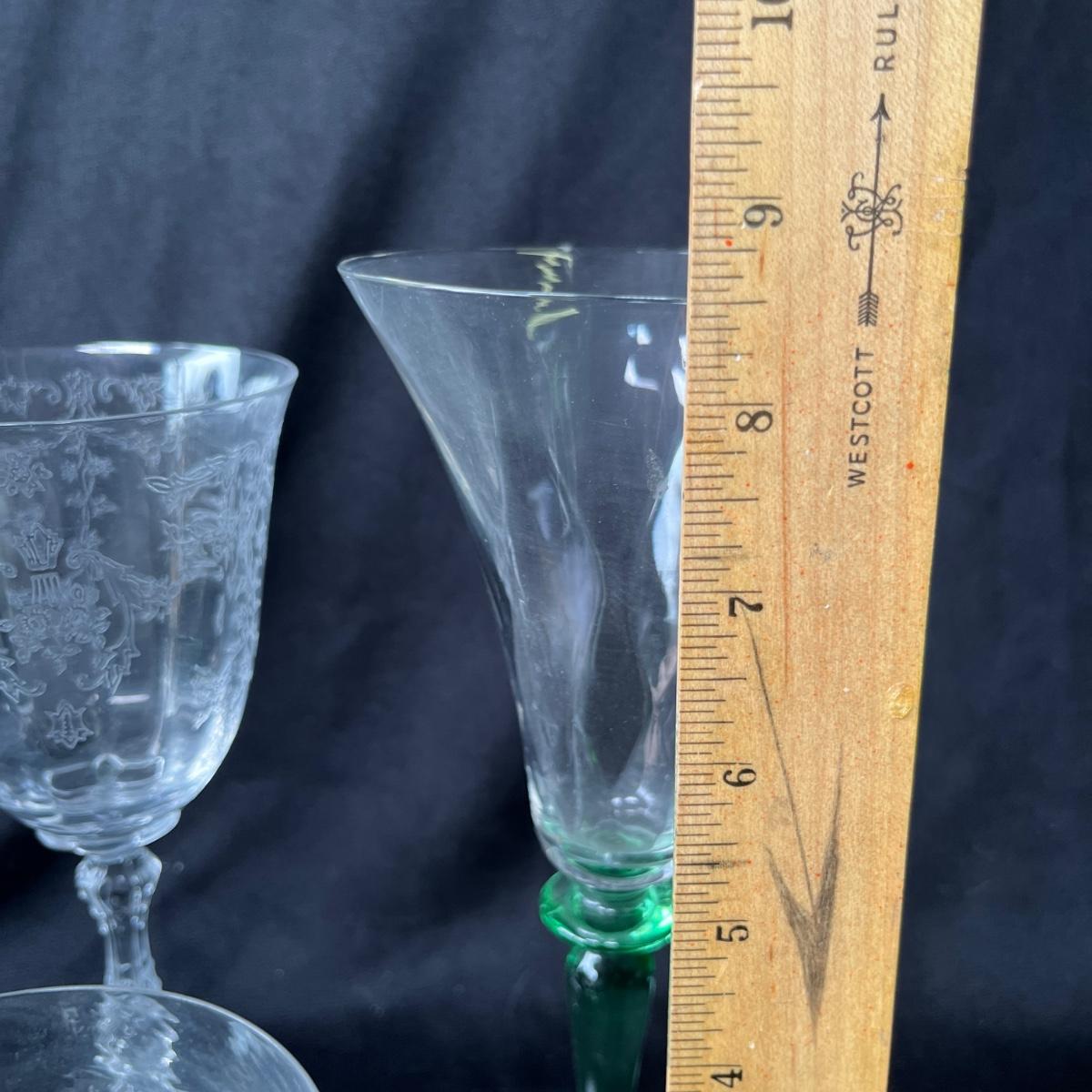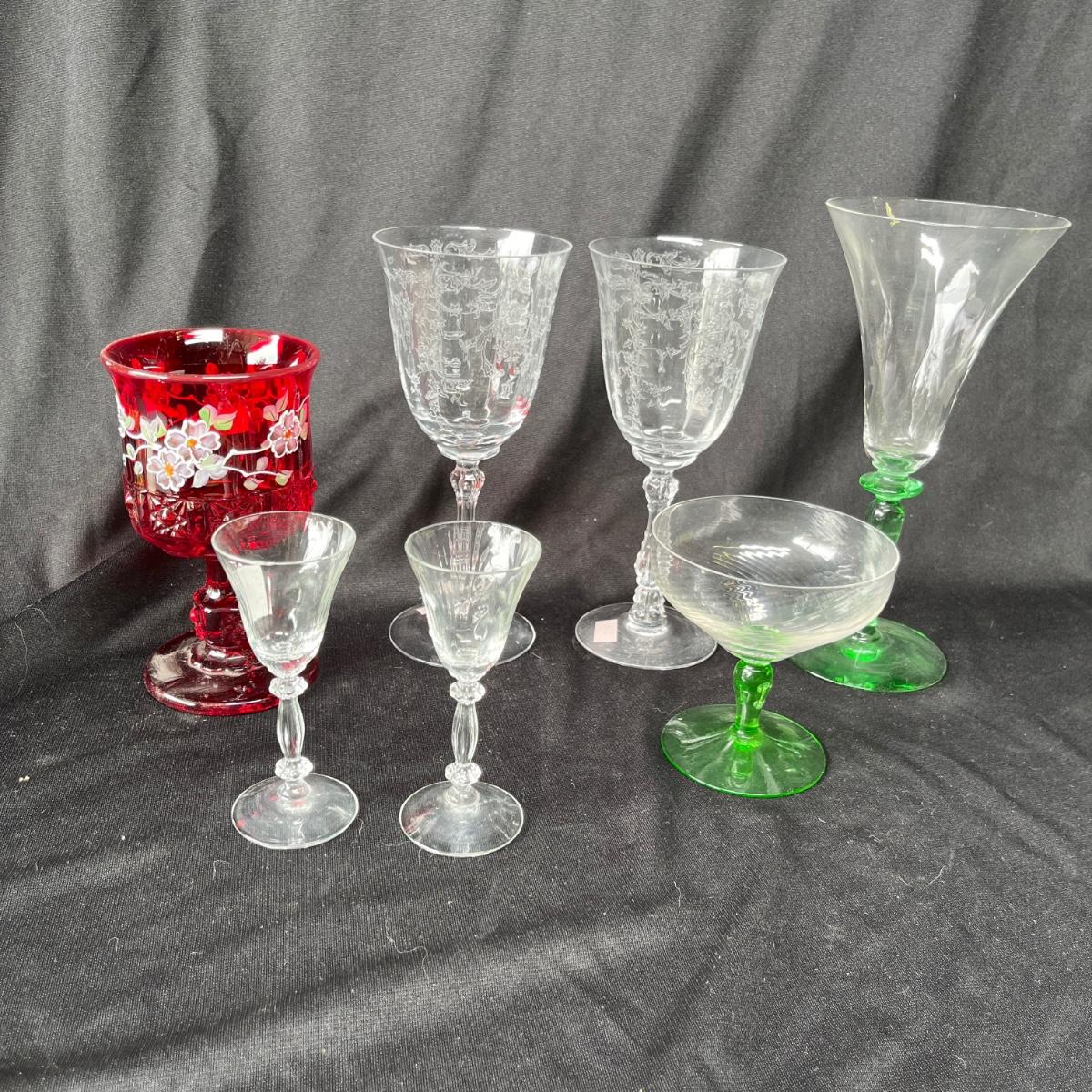 LG Wright Goblet, Fostoria Navarre (2) Heisey Yeoman (fluoresces), Cambridge Caprice liquor (there are 2 photo'd, but one arrived broke), & unidentified sherbet (fluoresces). All in good shape!