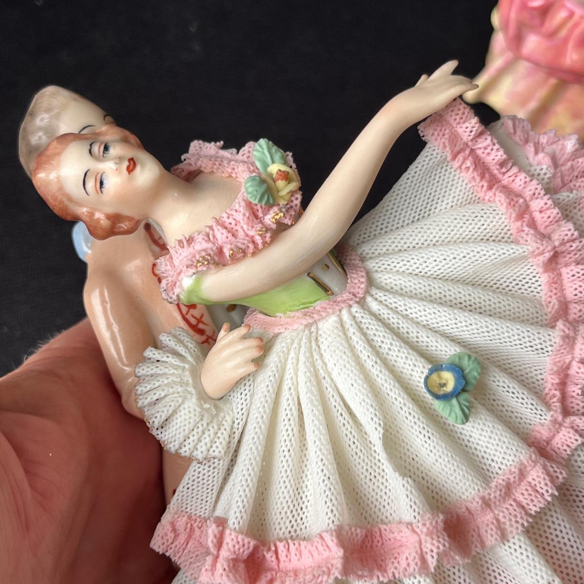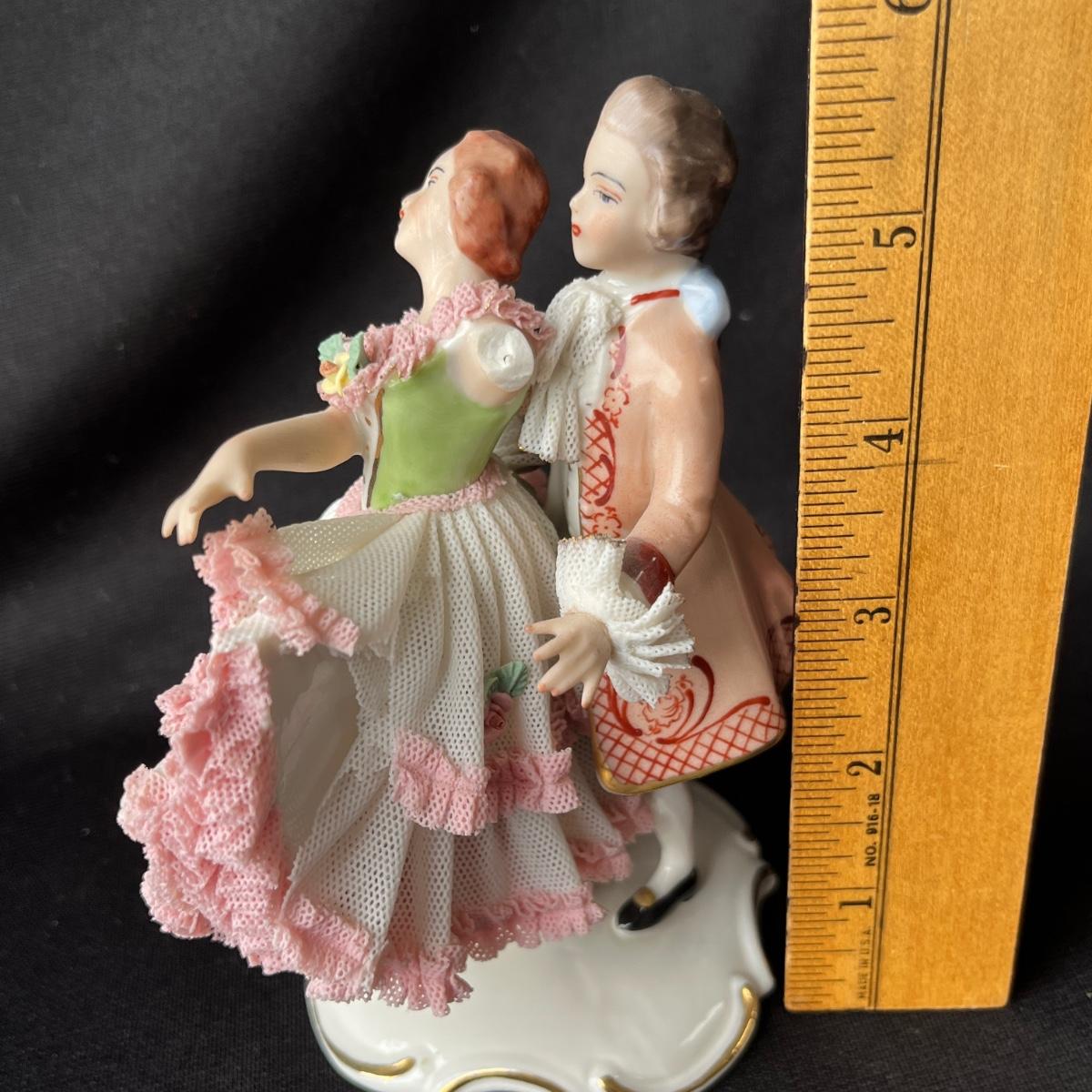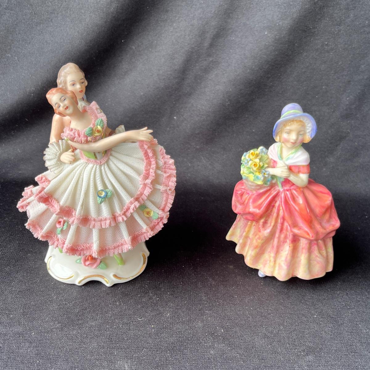 Dresden has seen better days, the lady's left hand is gone. Royal Doulton is in mint condition!