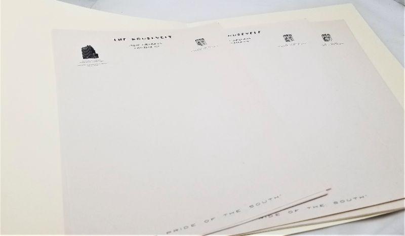 From the Huey Long era (Seymour Weis was Managing Director) - 17 sheets of unused letter paper from The Roosevelt, "The Pride of the South." Each sheet measures 10.5" x 7.5". Pages are not bent - a few have some minor foxing.