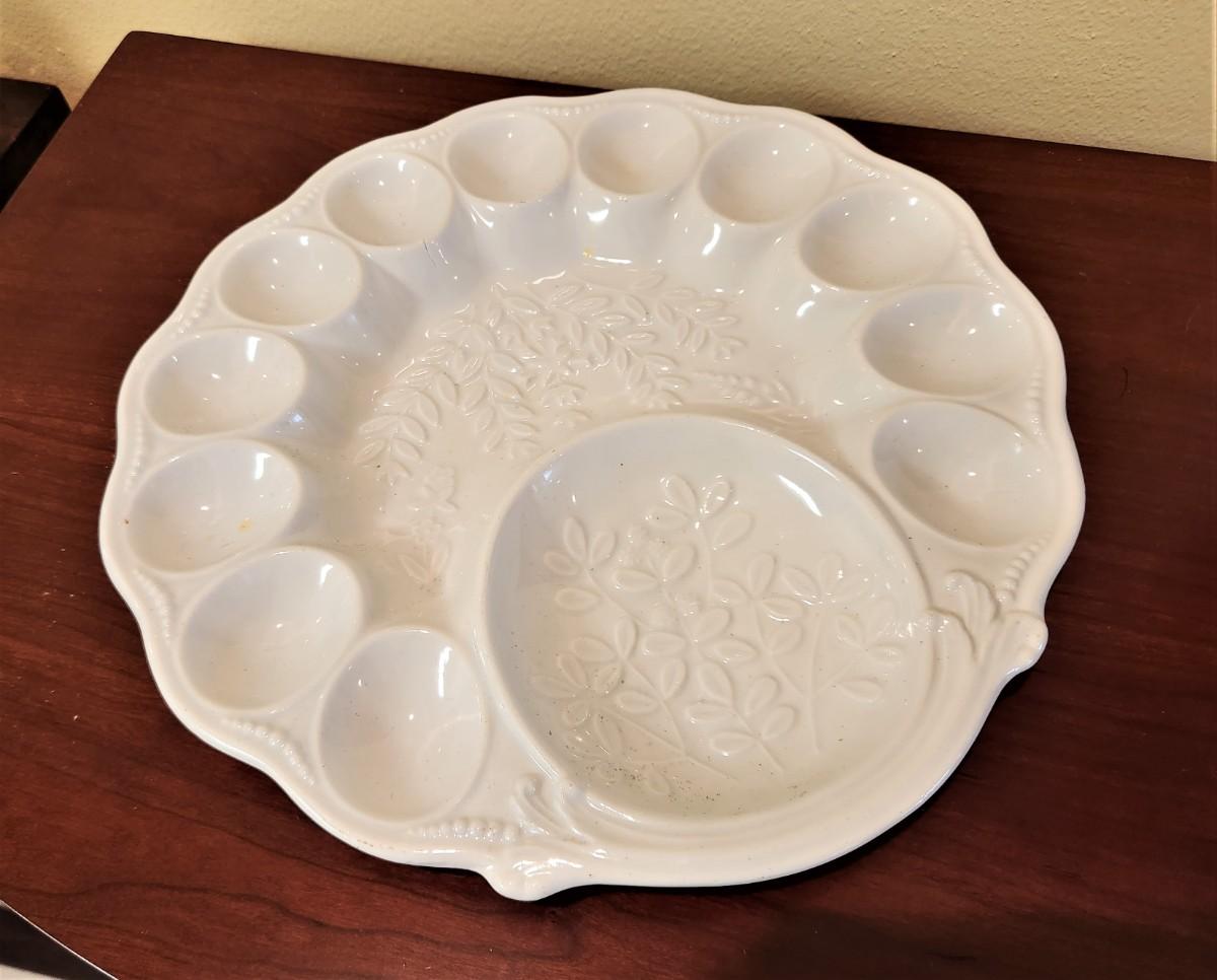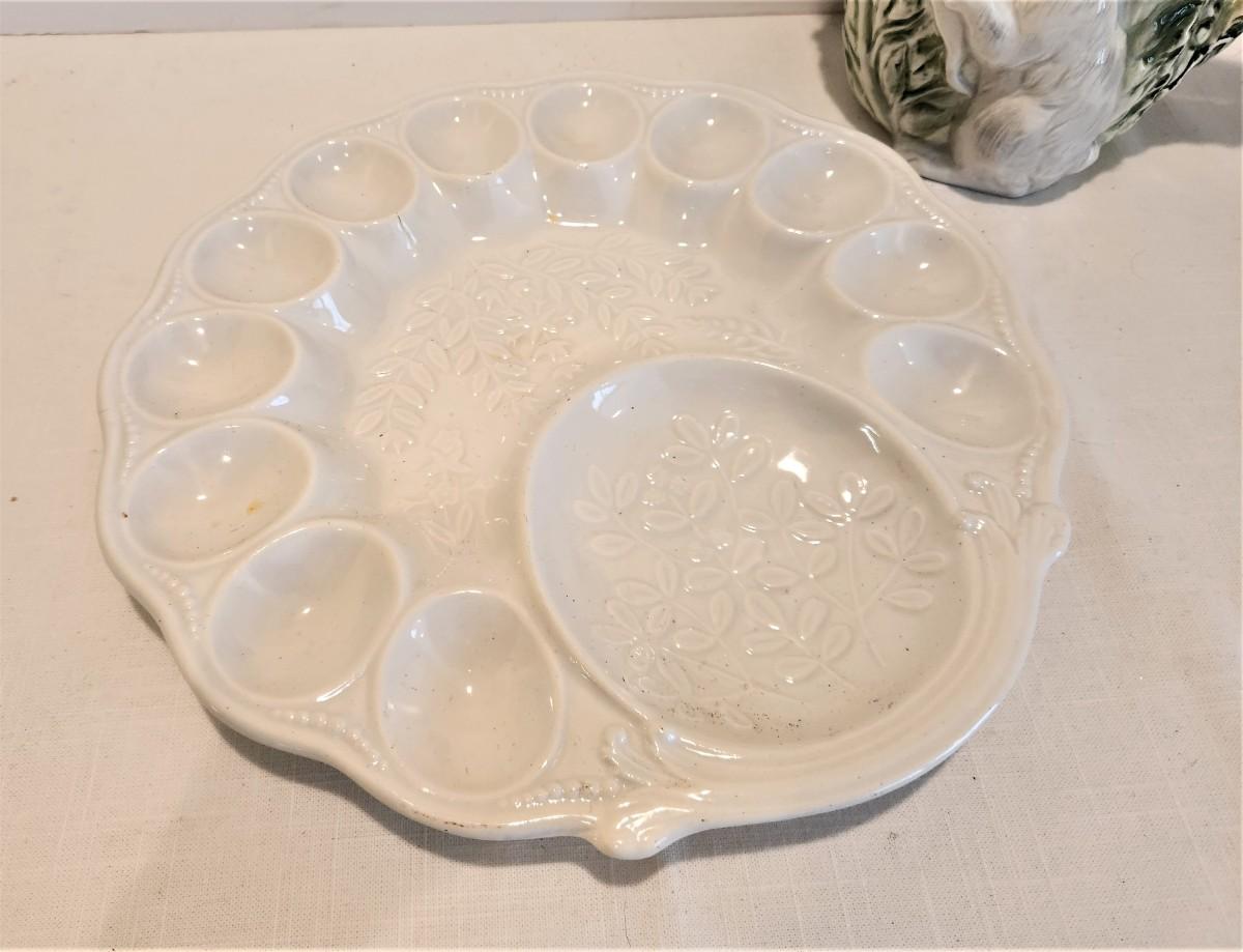 Both pieces for one money - just in time for Easter, cute Shafford Ceramics Rabbit pitcher, 9" tall, along with a classic white ceramic deviled egg platter, 12" across. Both in good condition.