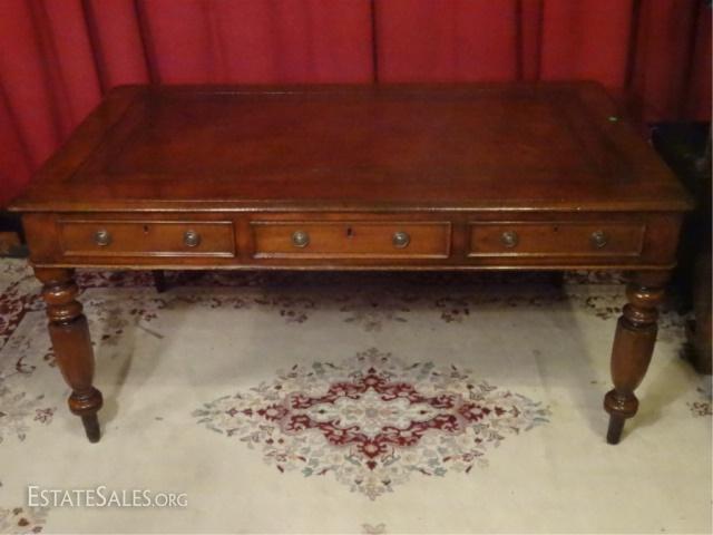 LOT 80: 19TH C. ENGLISH REGENCY PARTNER'S DESK, EMBOSSED LEATHER TOP, 3 DRAWERS ON EACH SIDE, VERY GOOD CONDITION WITH WEAR COMMENSURATE WITH AGE AND USE, SKU127.18