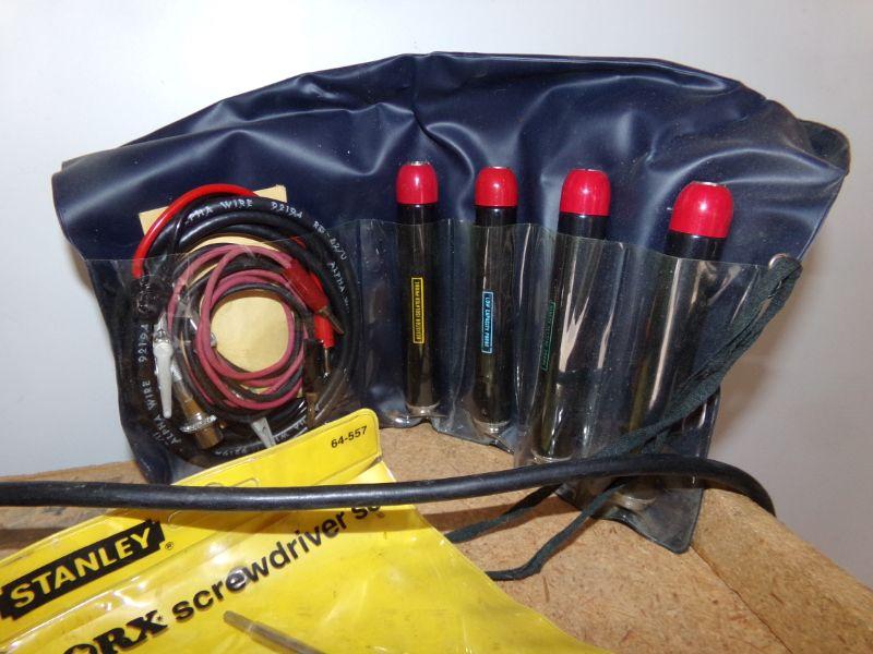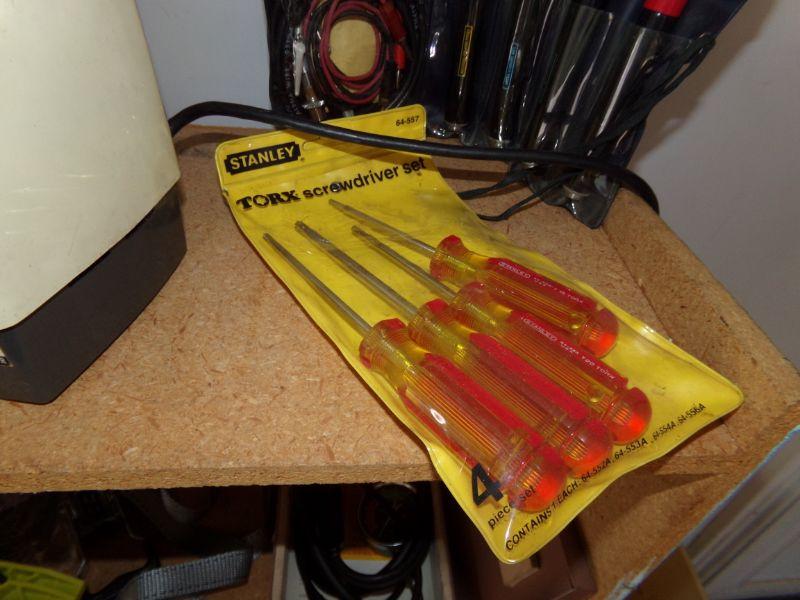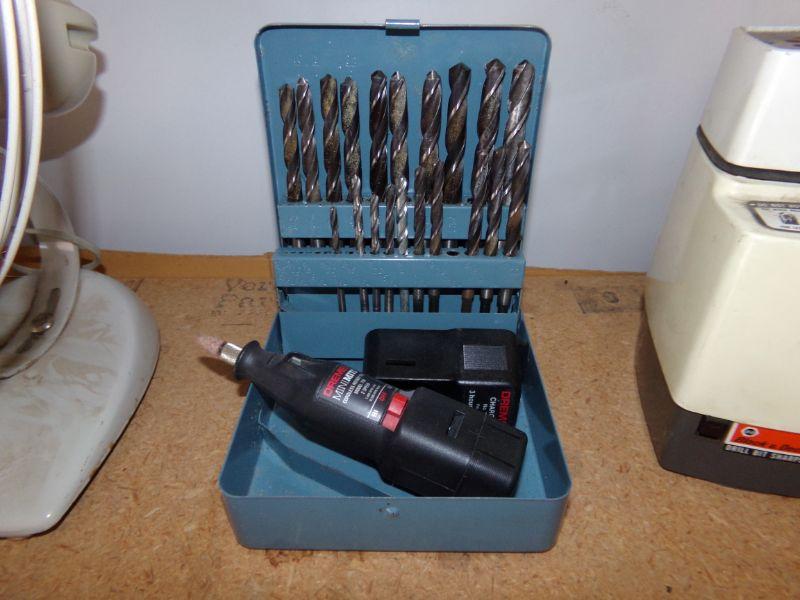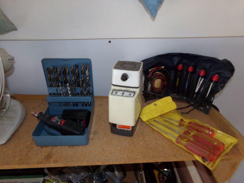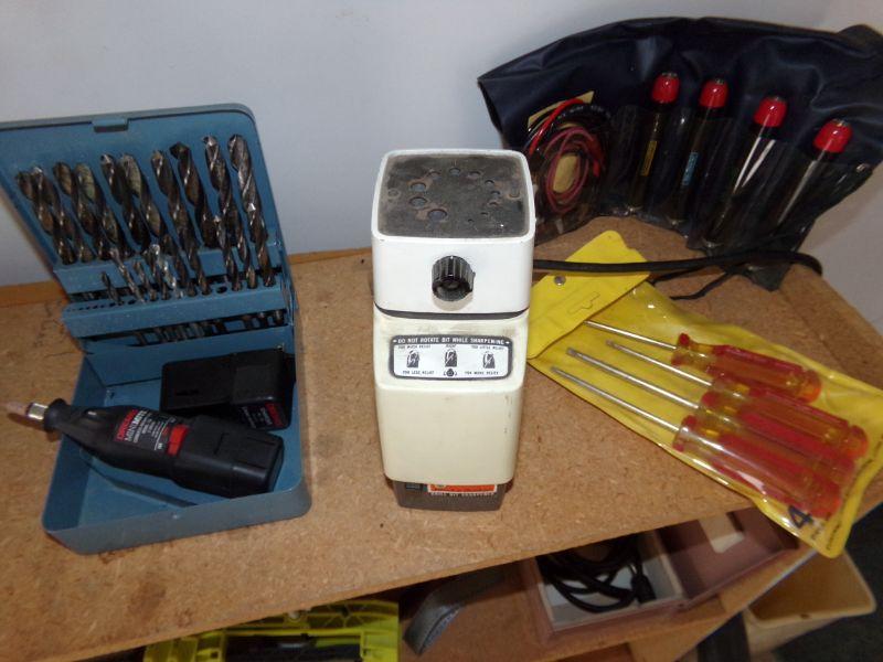 DRILL BITS IN METAL BOX, DRILL BIT SHARPENER, DREMEL, STANLEY TORX SCREWDRIVER SET, AND AN ELECTRICAL TESTER