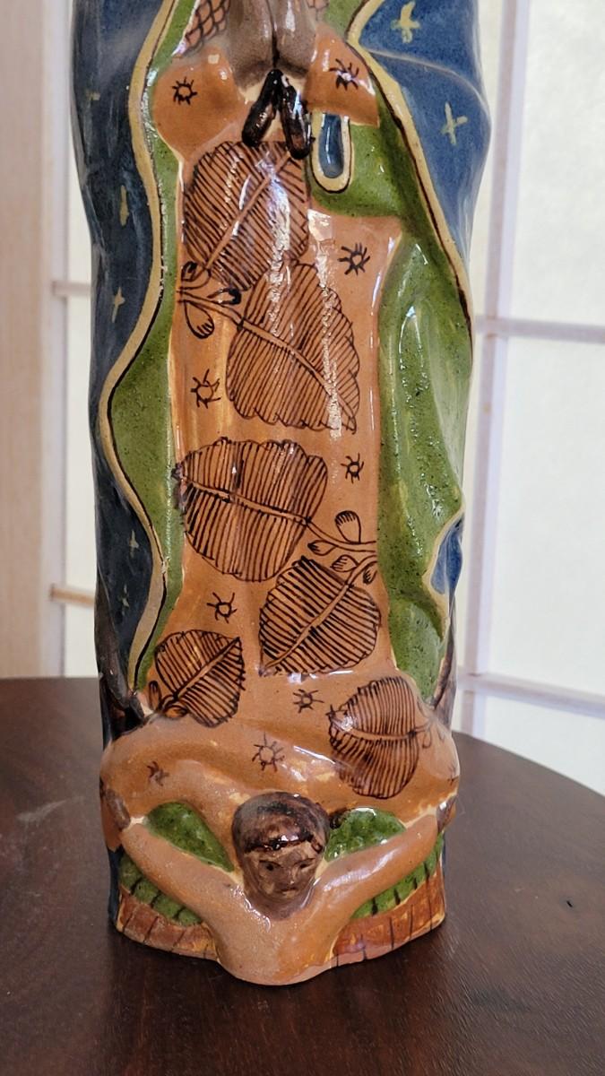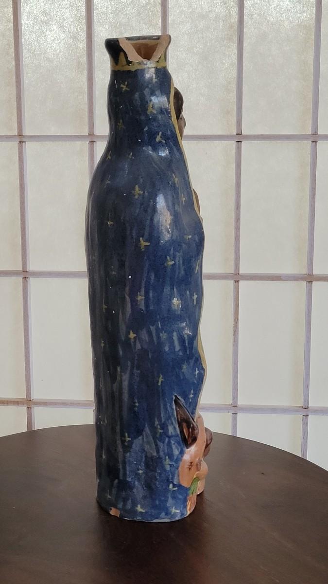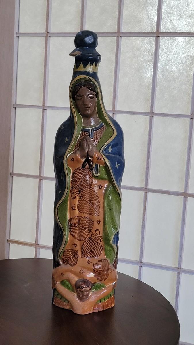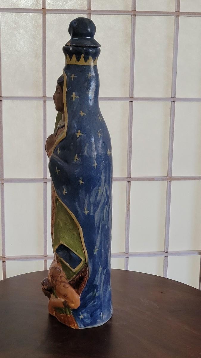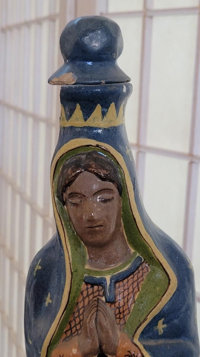 Mexican pottery holy water bottles in the form of "Our Lady of Guadalupe" represent a folk art form unique to a specific area, based on a 16th Century event reported by Juan Diego that happened outside Mexico City. After another appearance of the Holy Virgin to Diego, he gathered some flowers, and, as he'd been instructed, took them to a Bishop name Zumarraga. That's when a "Miracle" happened. That is why Our Lady of Guadalupe is the most beloved symbol of Mary among the Mexican people.Pottery bottles in this form started showing up at vendor's roadside booths when tourism to Mexico City increased dramatically in the 1930s and 1940s.