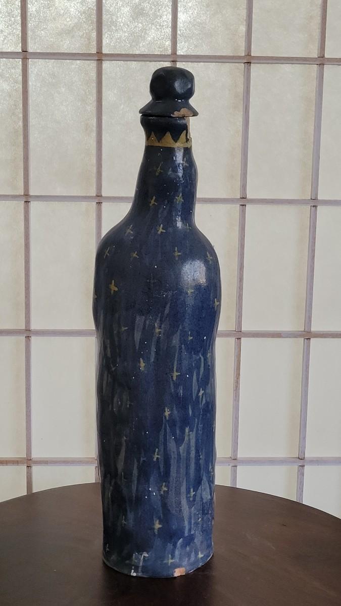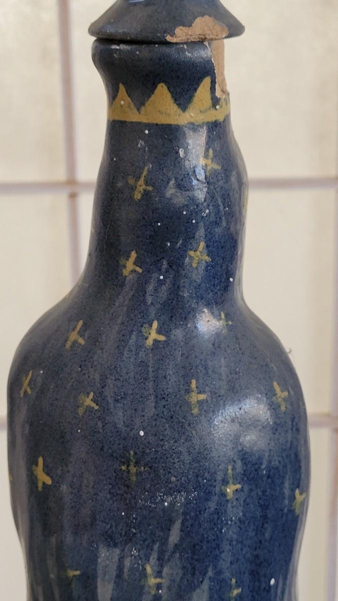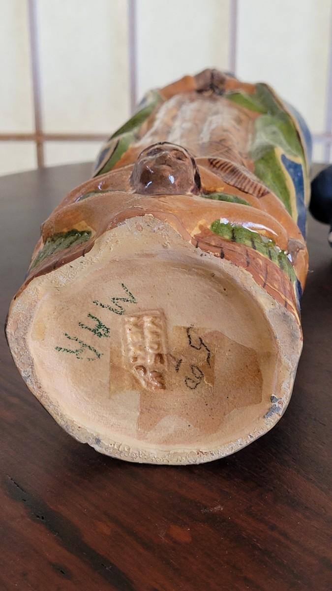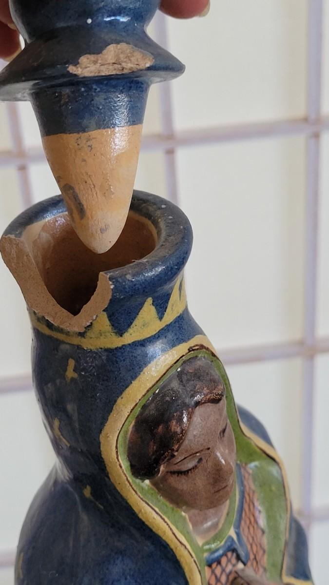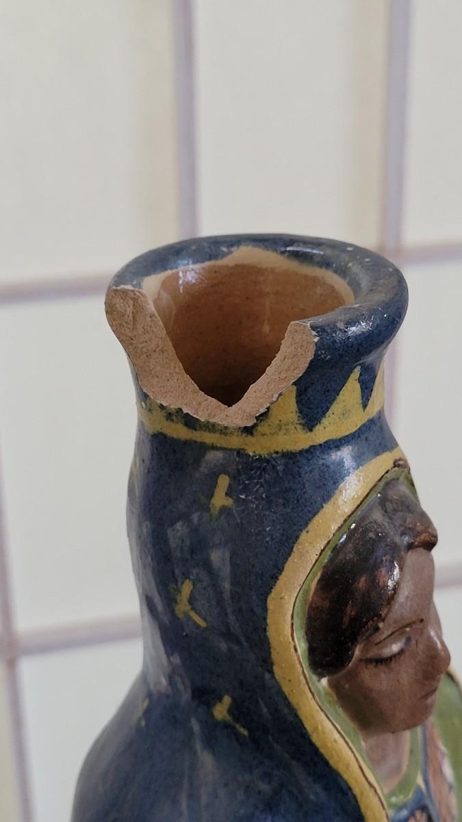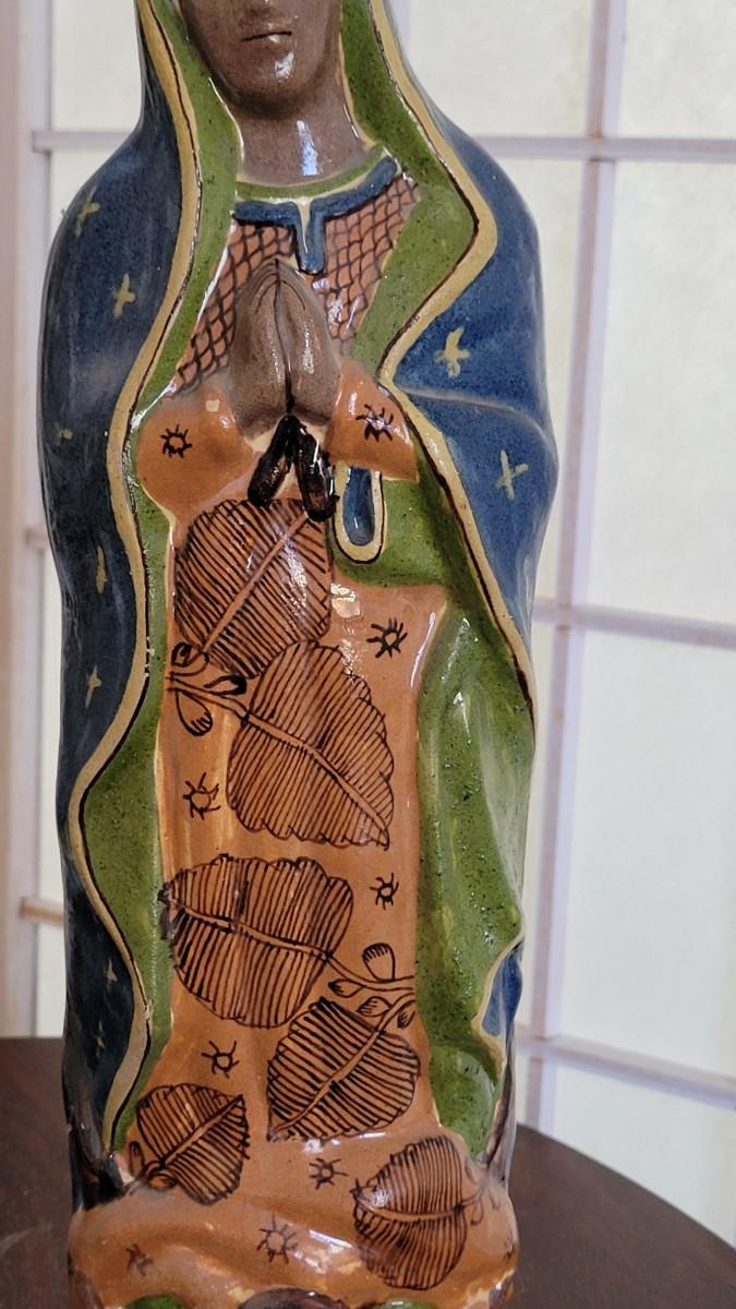 Mexican pottery holy water bottles in the form of "Our Lady of Guadalupe" represent a folk art form unique to a specific area, based on a 16th Century event reported by Juan Diego that happened outside Mexico City. After another appearance of the Holy Virgin to Diego, he gathered some flowers, and, as he'd been instructed, took them to a Bishop name Zumarraga. That's when a "Miracle" happened. That is why Our Lady of Guadalupe is the most beloved symbol of Mary among the Mexican people.Pottery bottles in this form started showing up at vendor's roadside booths when tourism to Mexico City increased dramatically in the 1930s and 1940s.