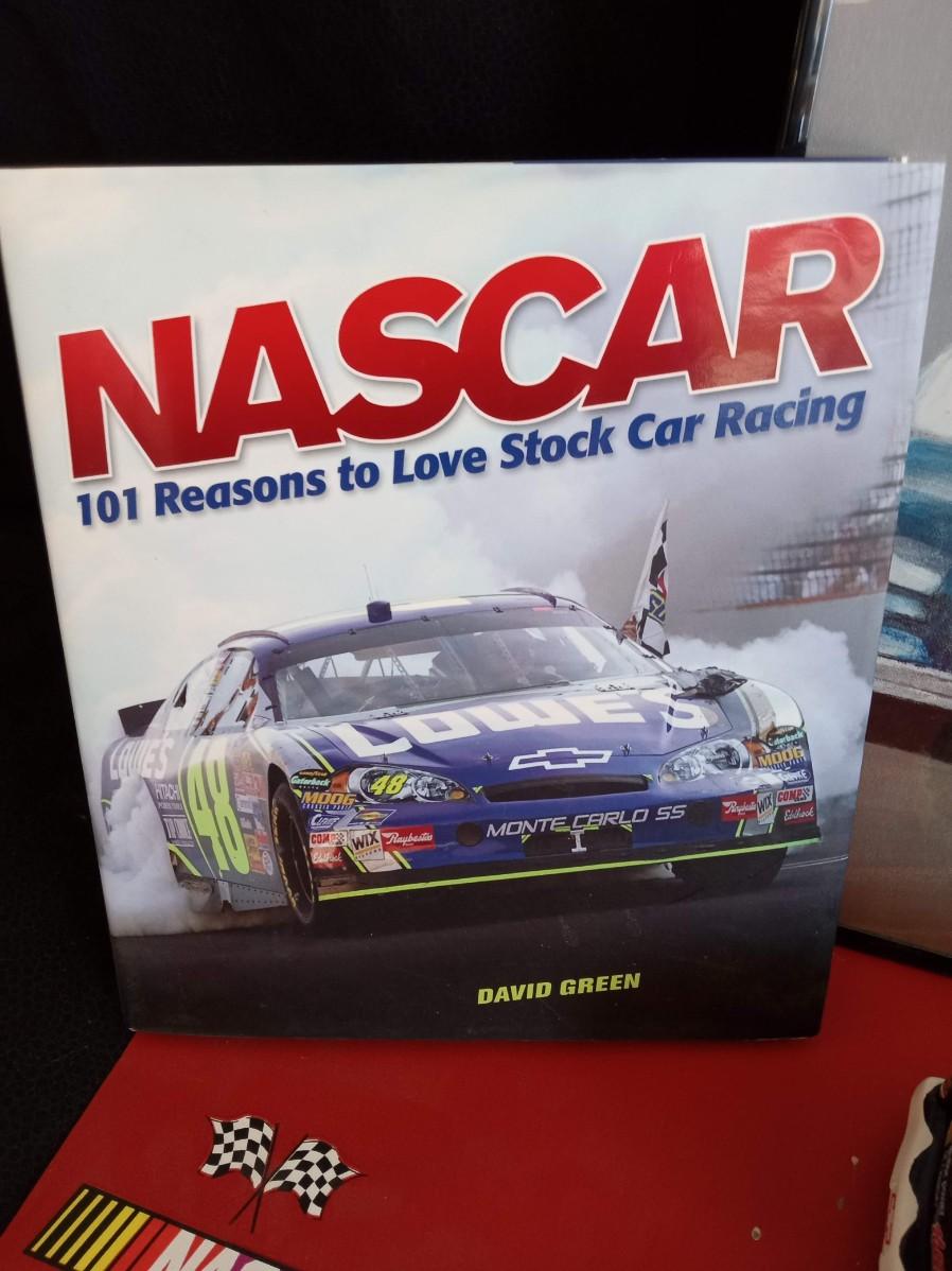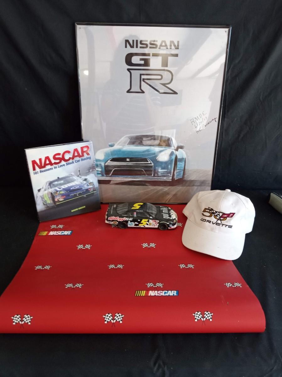 ROLL OF NASCAR WALLPAPER, BALL CAP, BOOK AND A FRAMED POSTER