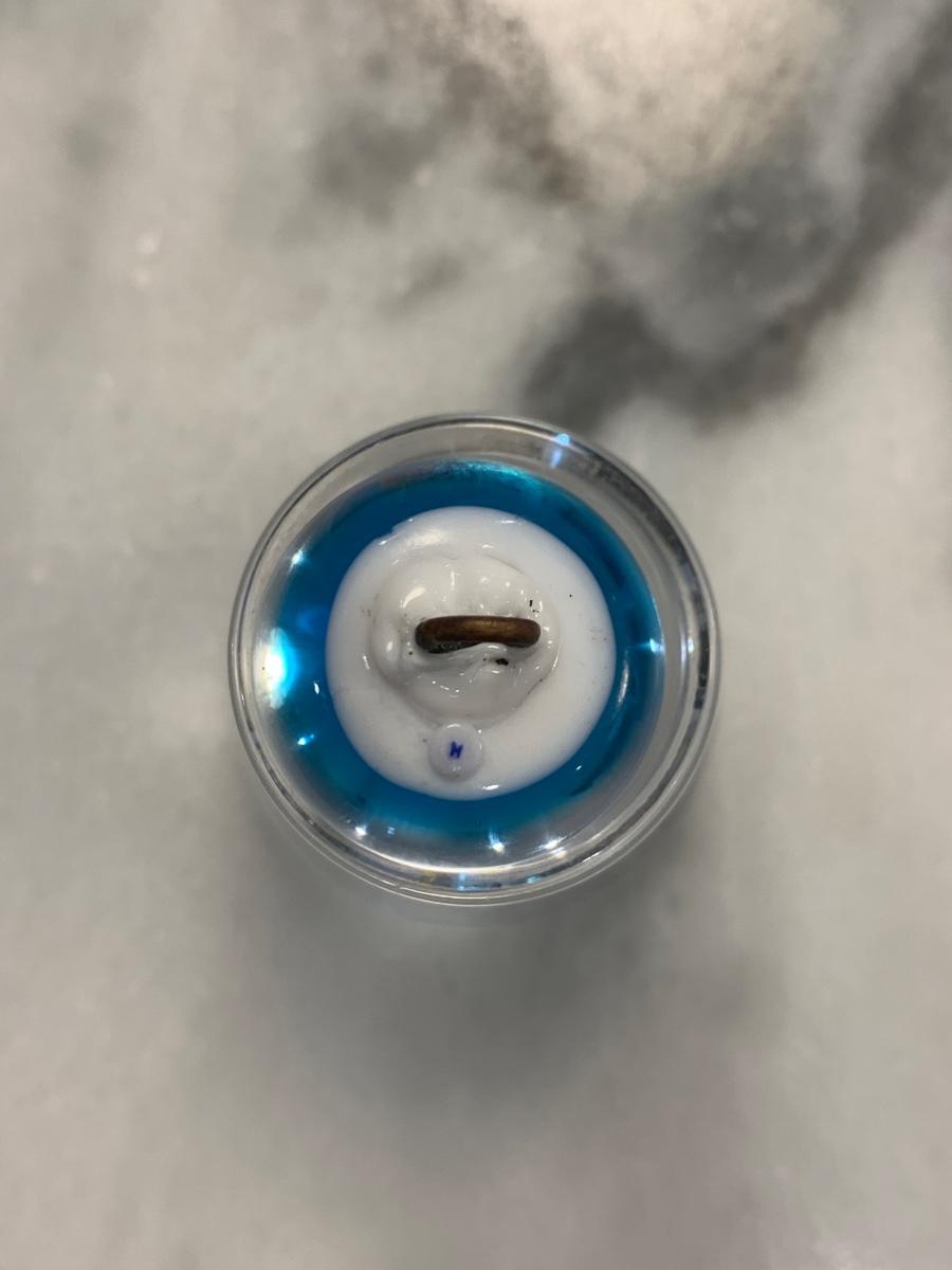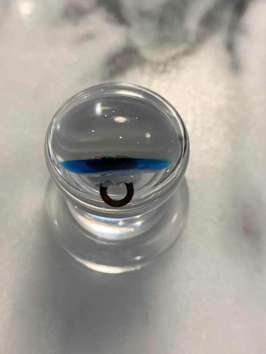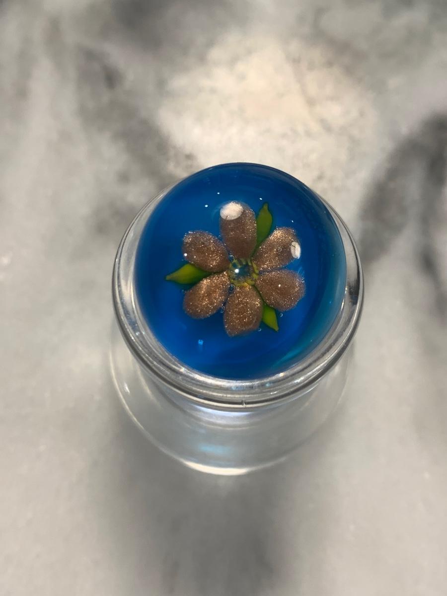 Robert Hasen metallic goldish petals with three green leaves on a bright blue ground, signature "H" is on back. 7/8" in diameter