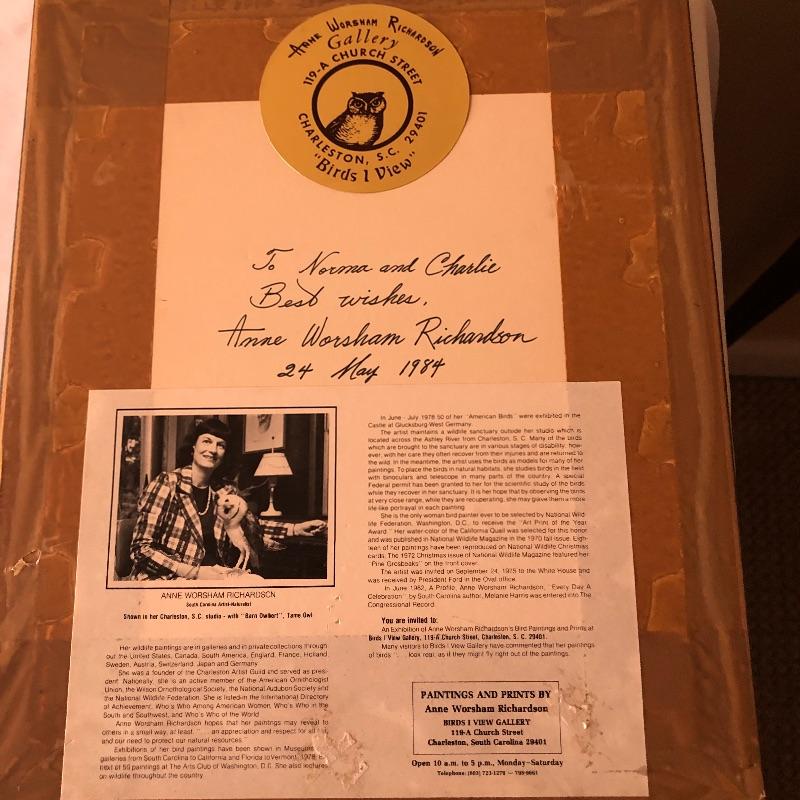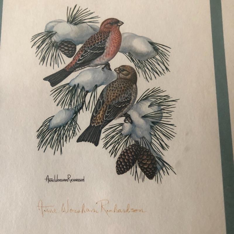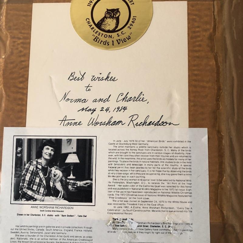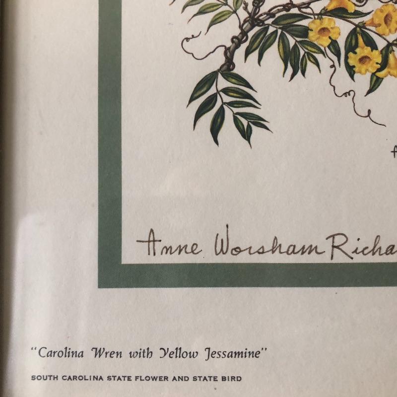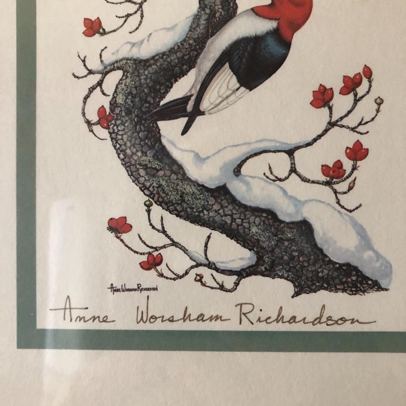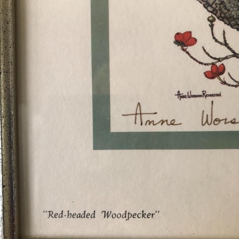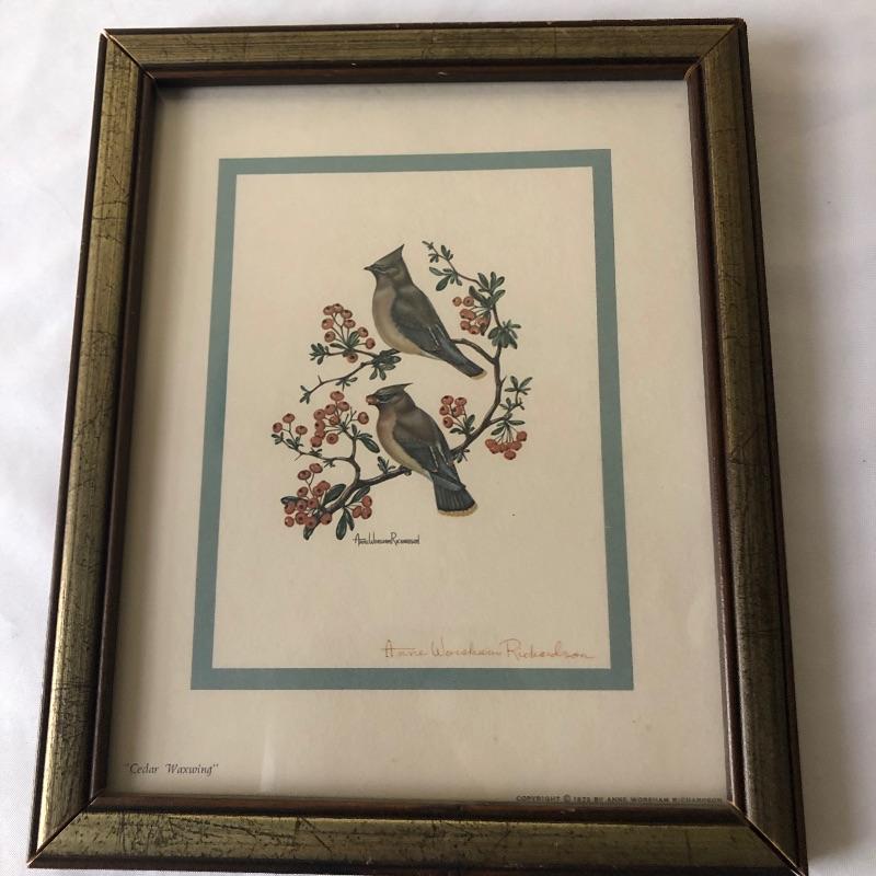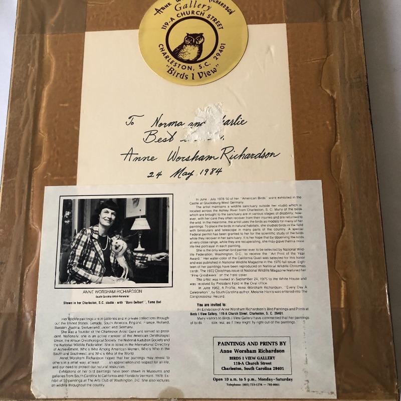 This lot includes five signed prints by Anne Worsham Richardson. The silver and gold frames measure 9 1/2” x approximately 12”. The brown and gold frames measure 9” x 11”. Shipping available.