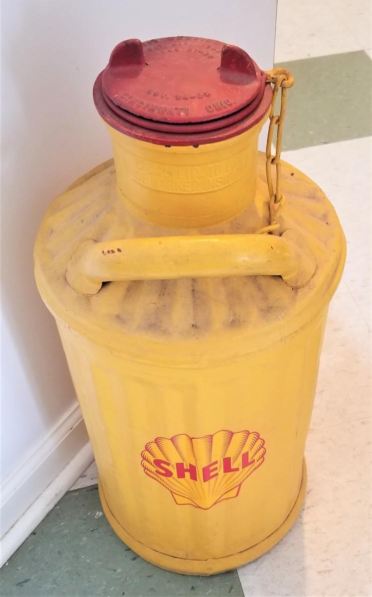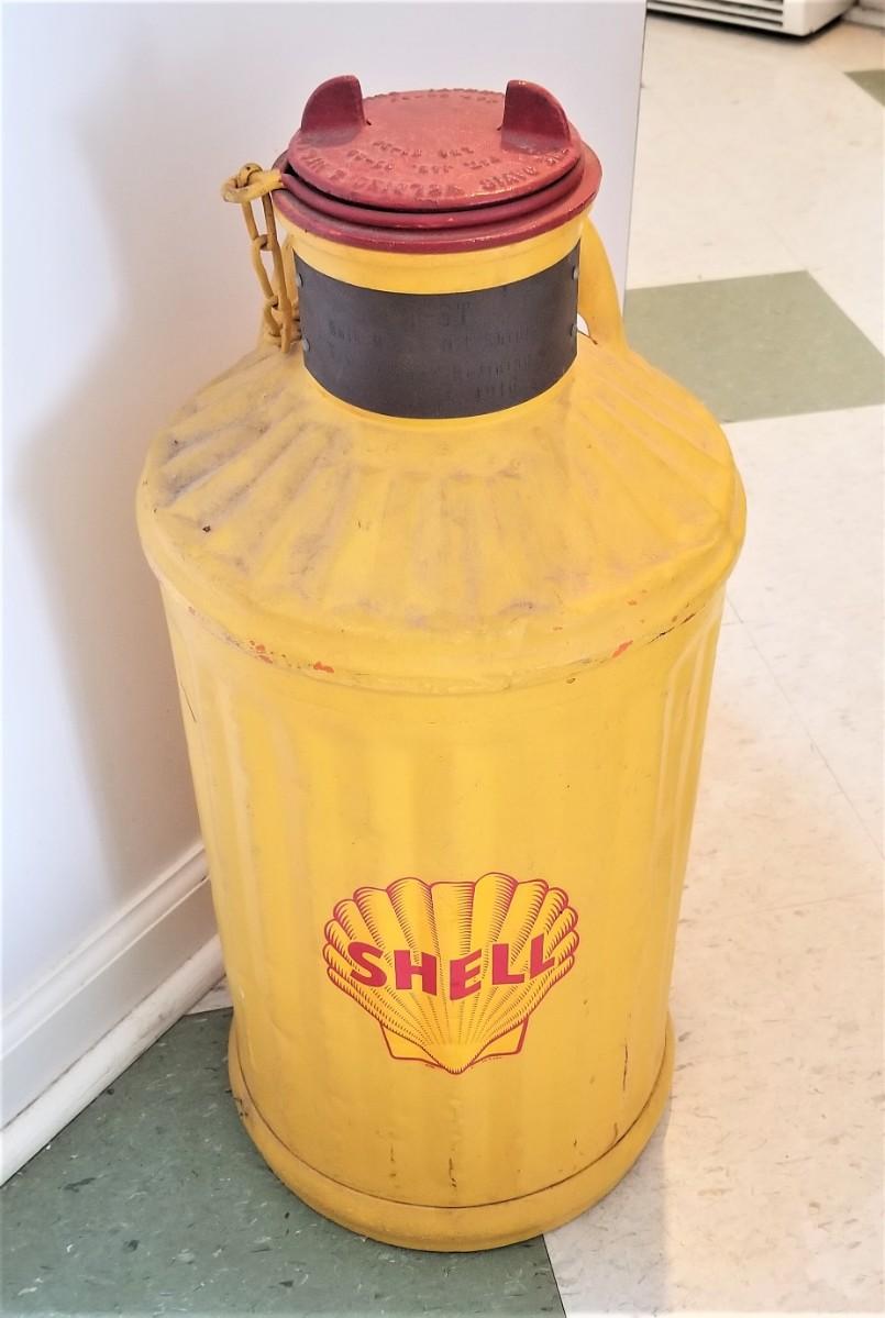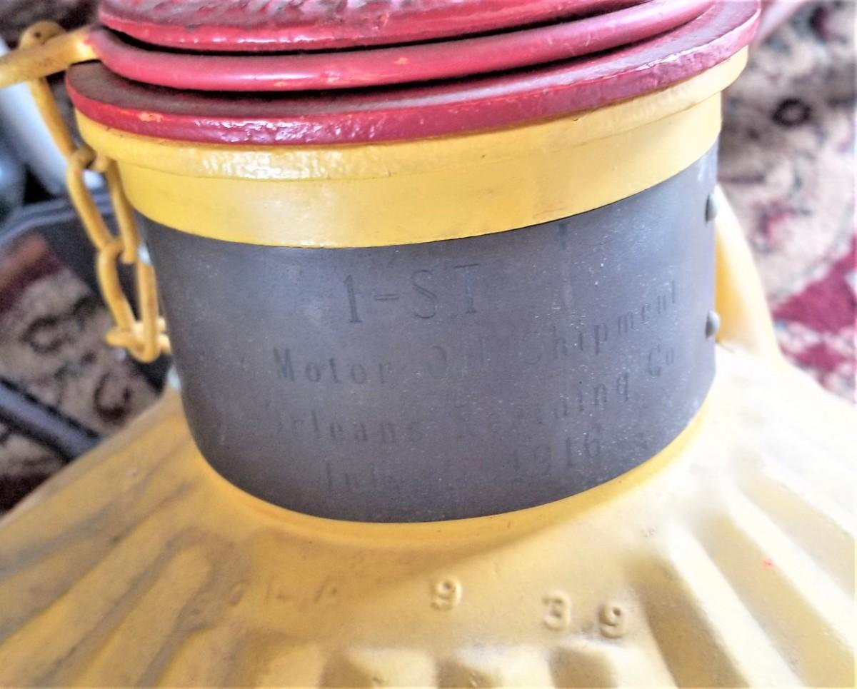 An interesting piece from one of our consignors - Antique Shell Oil Barrel with brass commemorative plaque that reads "1st Bulk Motor Oil Shipment, New Orleans Refining Co, July 1, 1916." Davis Welding and Manufacturing Co. can stands about 22" tall.