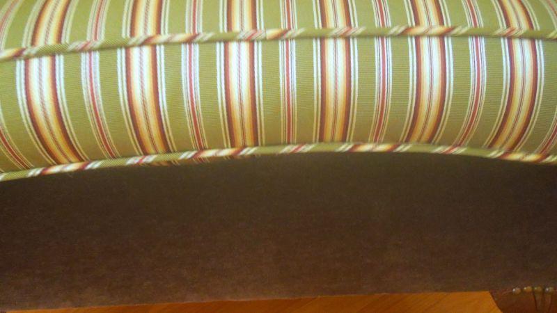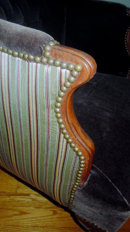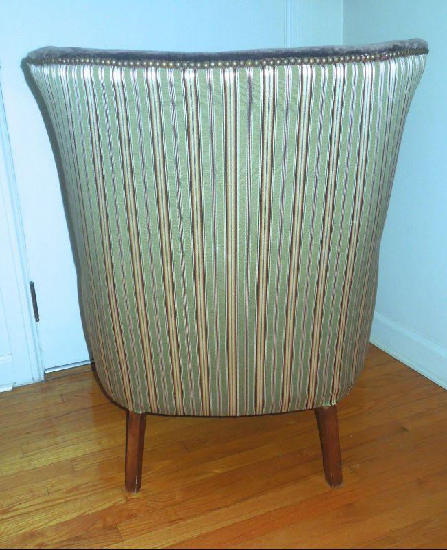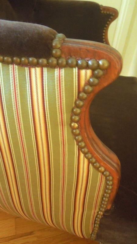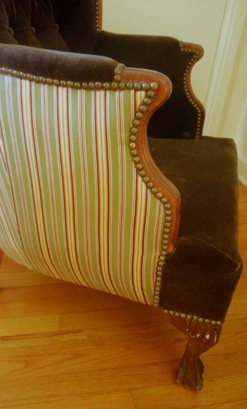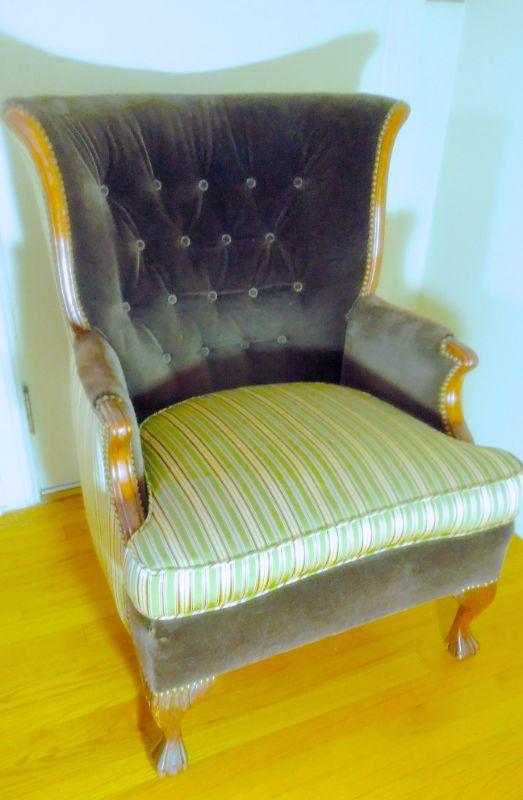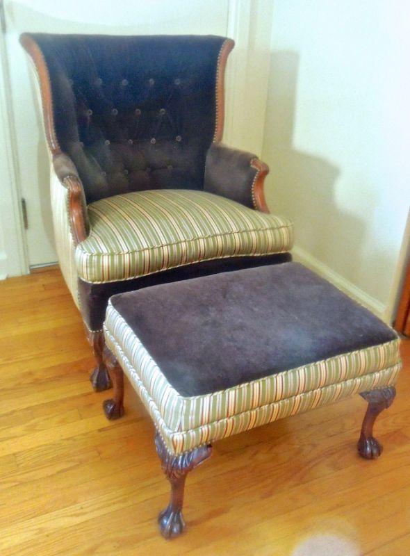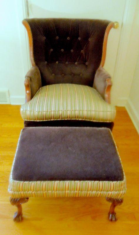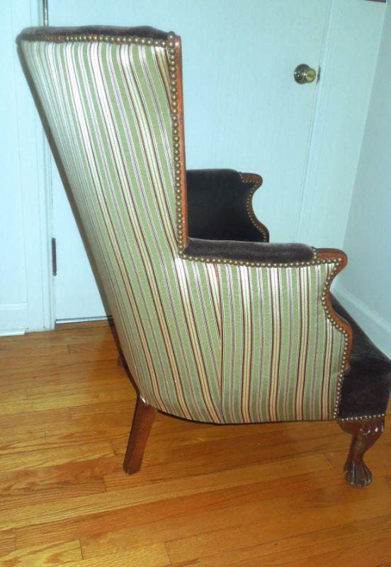 Antique upholstered clawfoot wingback sitting chair and ottoman. Green striped upholstery is a silk blend and paired with solid chocolate brown velvet. Ottoman is not stained, it is a flaw in photo. There are no rips in upholstery. Brass nailhead accents. 39" H x 29" W x 28" D.