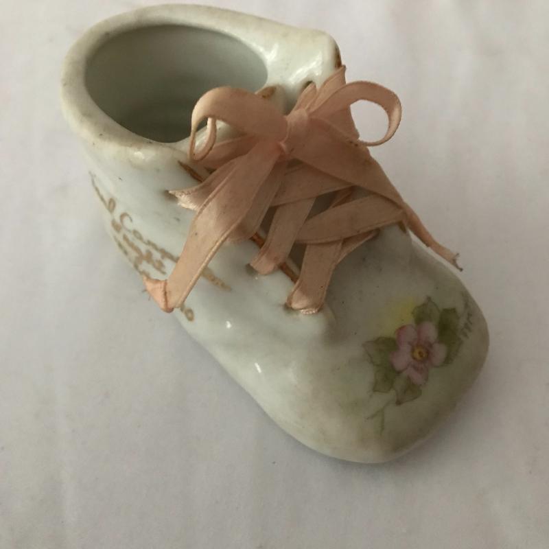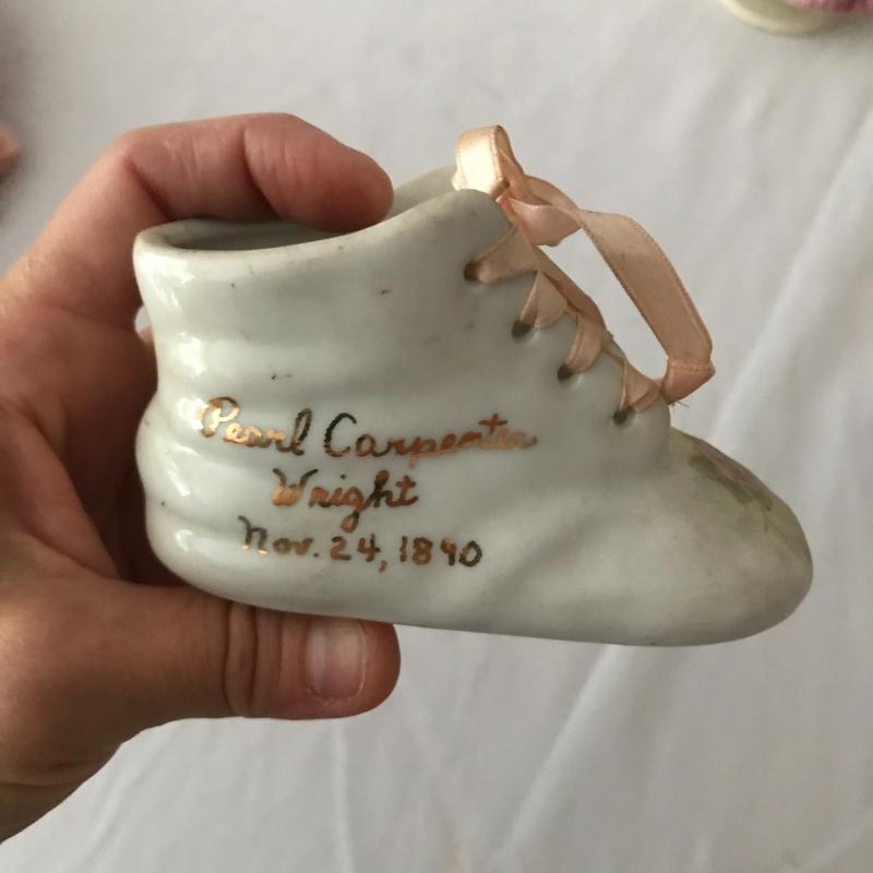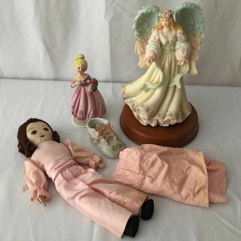 Lot includes a vintage, hand-sewn doll (her skirt needs repair), musical spinning figurine (unsure of song), musical angel statue on stand that plays “˜Wind Beneath My Wings’ (approx. 12” tall on stand), and porcelain baby shoe that reads “Pearl Carpenter Wright Nov. 24, 1890”. No shipping available. Local pickup only in Asheville, NC.