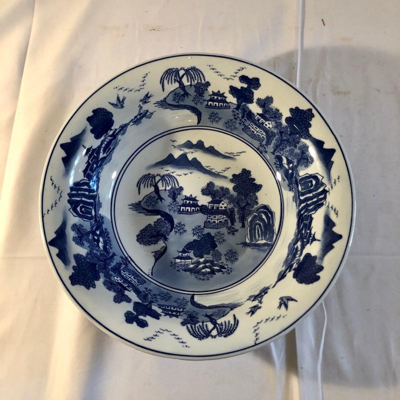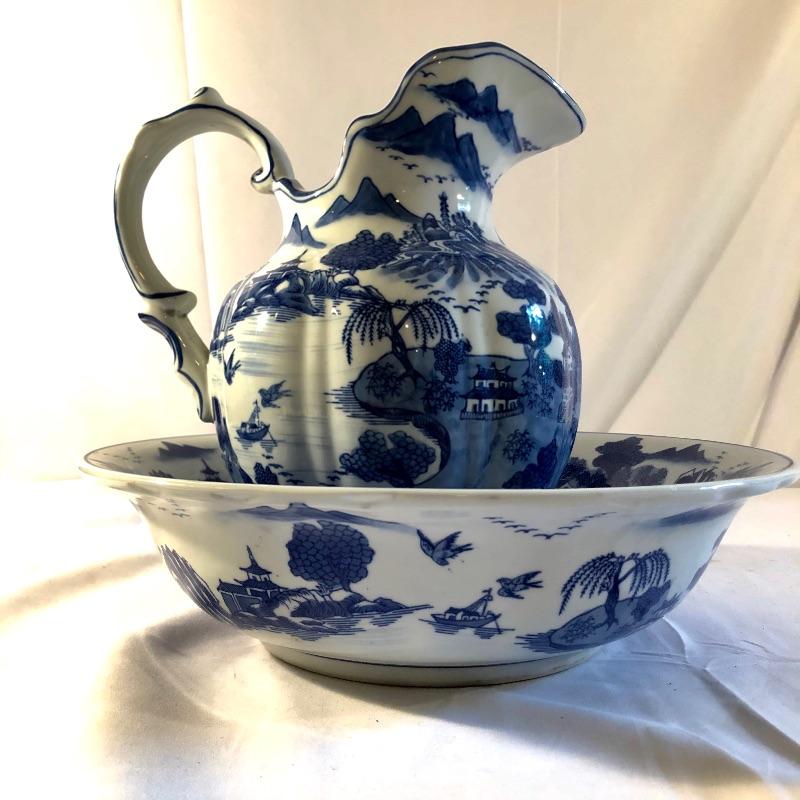 This matching set with basin and pitcher are extremely attractive with their “˜Spode blue’ style print. The pieces are not marked. This duo is in great condition. .