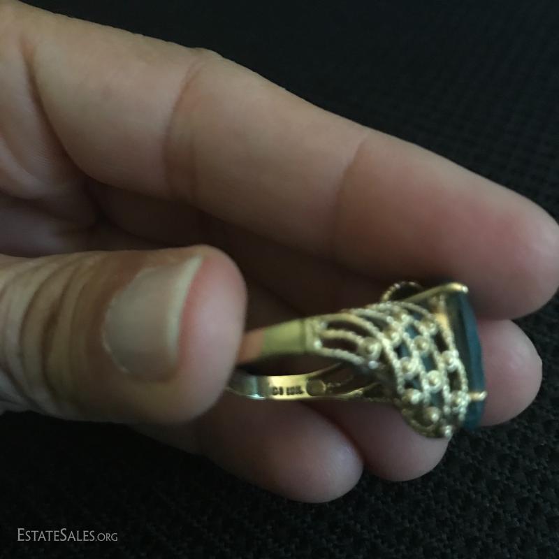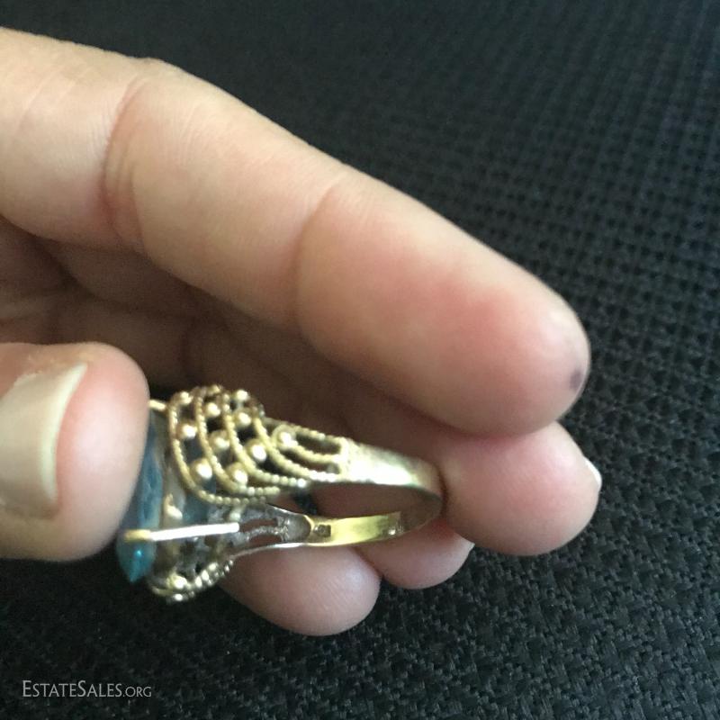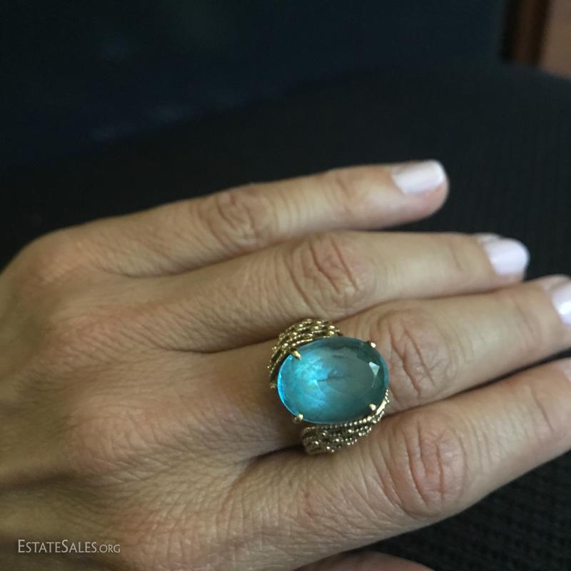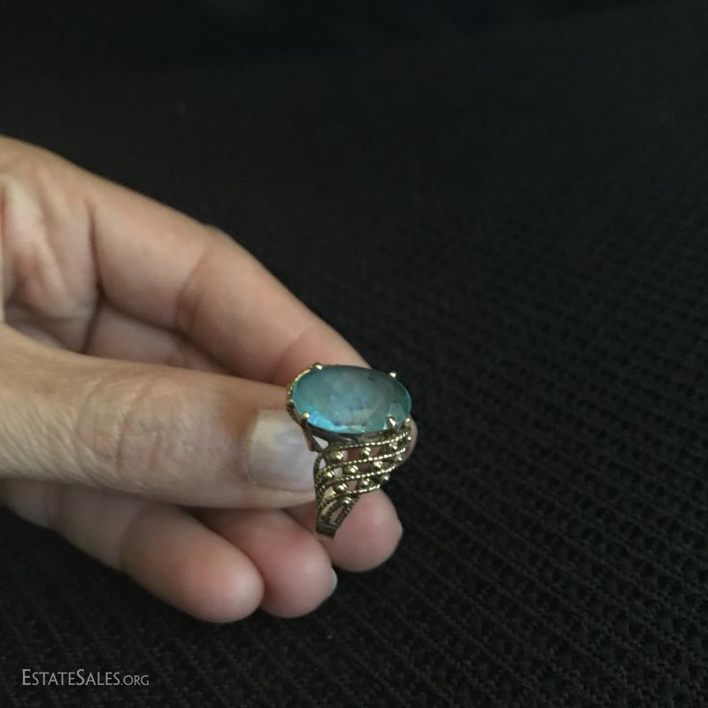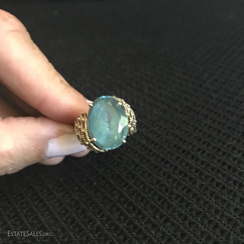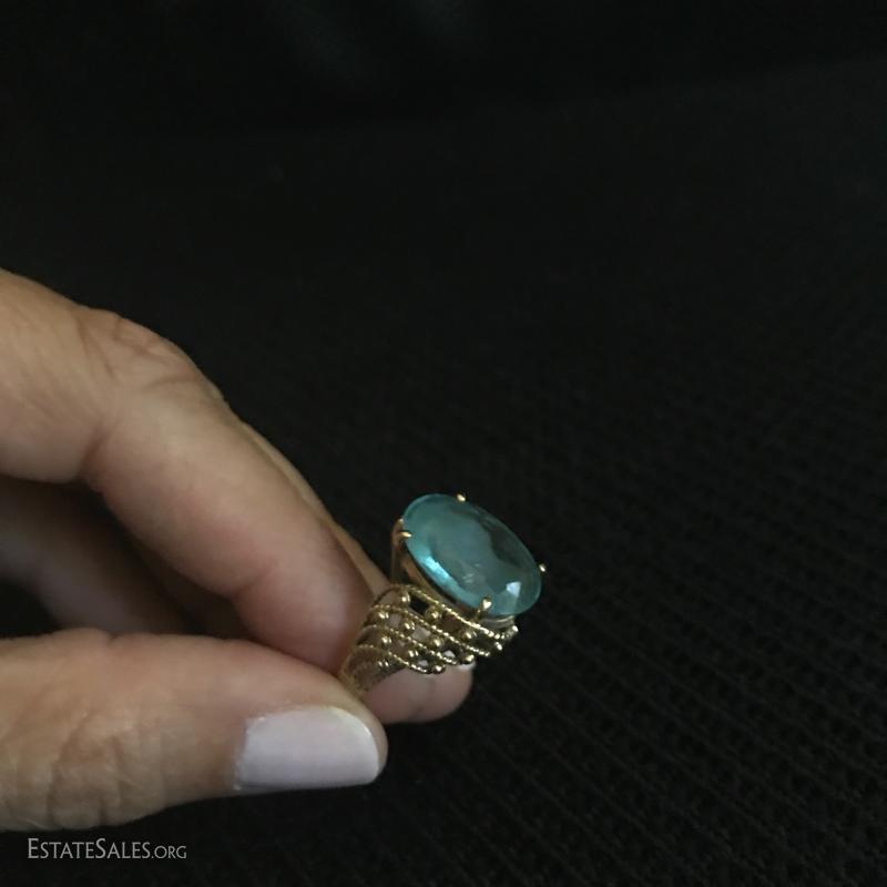 Beautiful aquamarine colored stone gold ring. Gold marked 10k. Approx size 9. We can not verify the authenticity of any of these items. We are stating what is seen to the naked eye. Shipping available or local pick up in Saluda, NC.