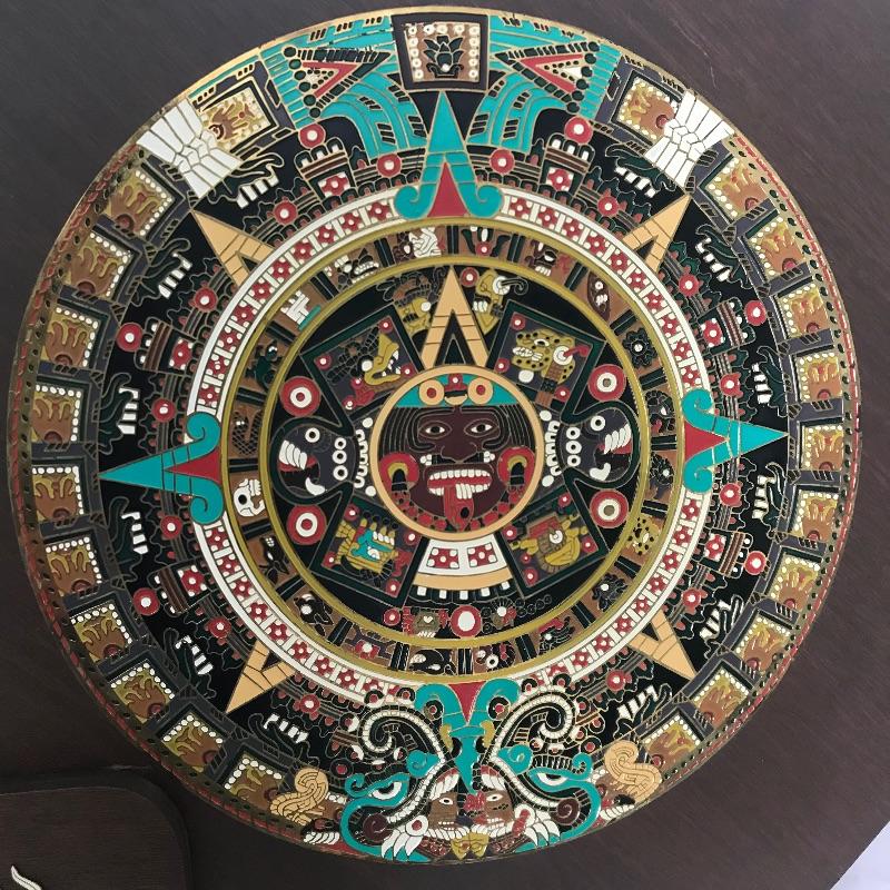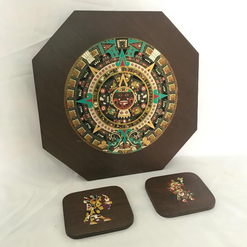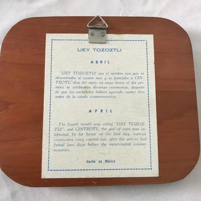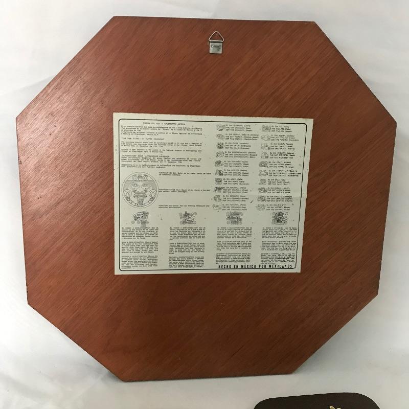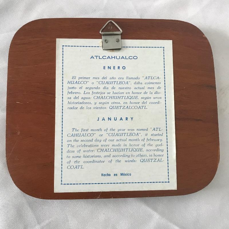 Awesome Mexican art featuring the “Sun Stone” or “Aztec Calendar”. Art appears to be a thin decorative sheet of metal mounted on a dark wood back. The full calendar measures about 16.5” x 16.5”. Two supplemental months that are January and April are in the same style as the larger calendar. These each measure approximately 6” x 5”. Each piece has information in at least two languages (including English) on the back along with mounting. See photos. Shipping available.