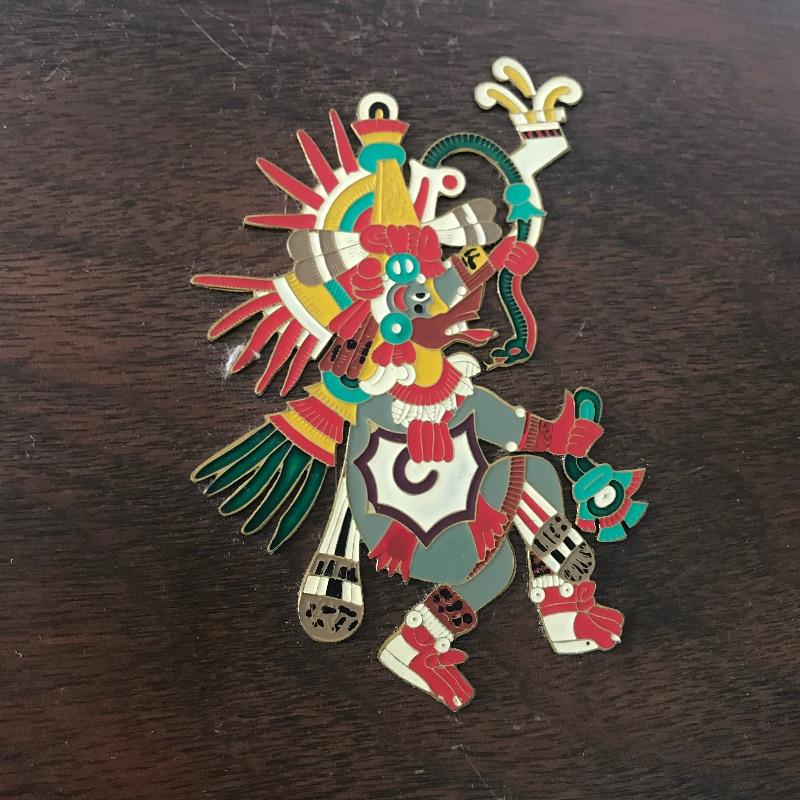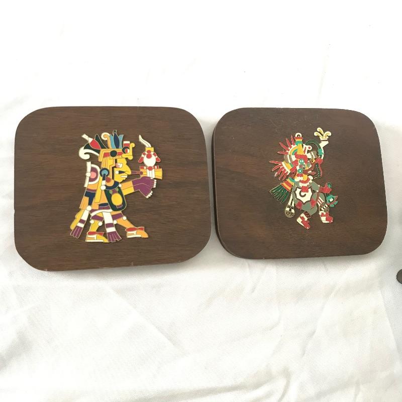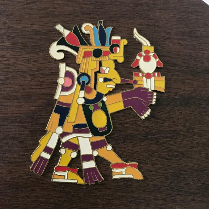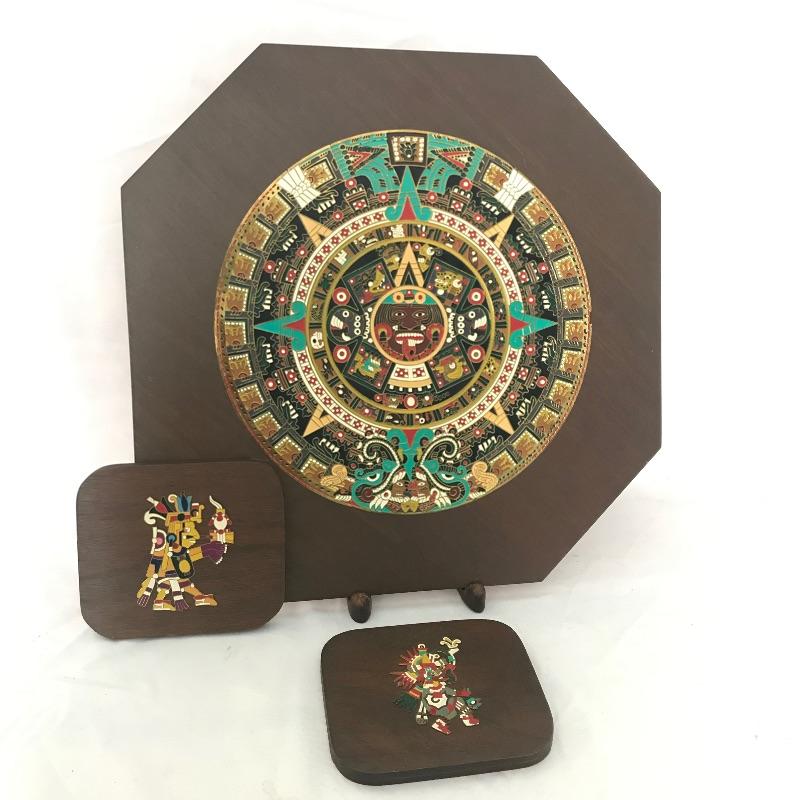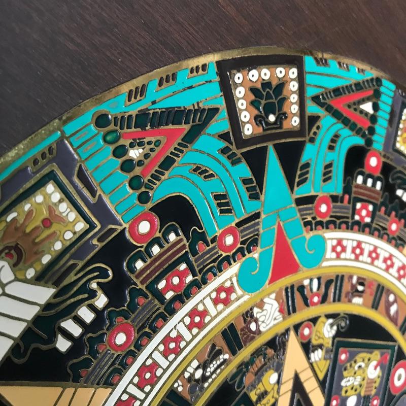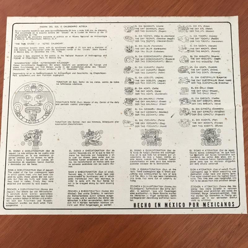 Awesome Mexican art featuring the “Sun Stone” or “Aztec Calendar”. Art appears to be a thin decorative sheet of metal mounted on a dark wood back. The full calendar measures about 16.5” x 16.5”. Two supplemental months that are January and April are in the same style as the larger calendar. These each measure approximately 6” x 5”. Each piece has information in at least two languages (including English) on the back along with mounting. See photos. Shipping available.