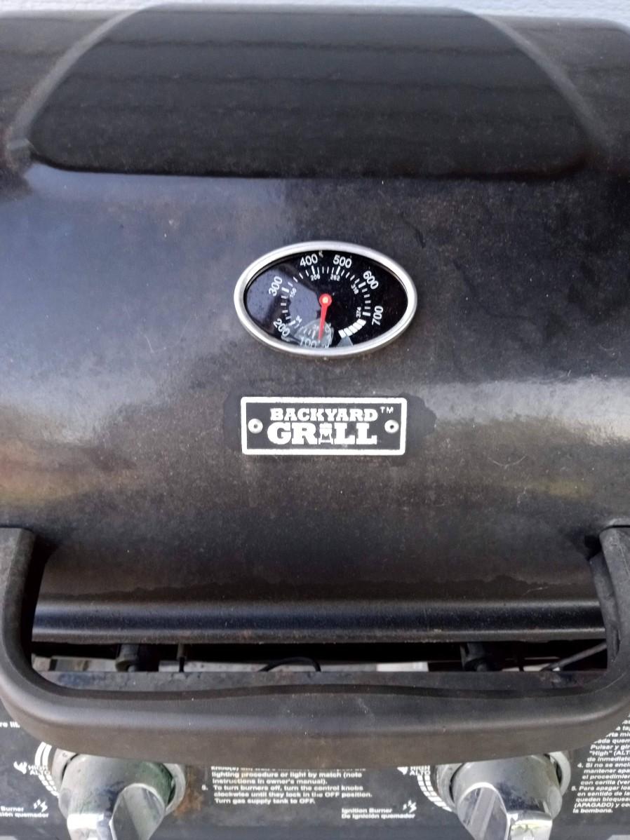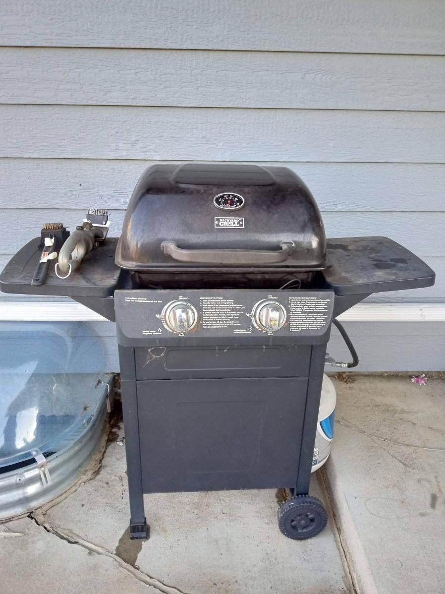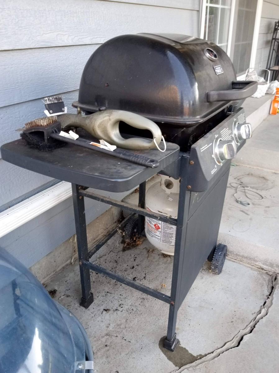A PROPANE BACKYARD GRILL WITH GRILL BRUSHES, AND A GRILL COVER