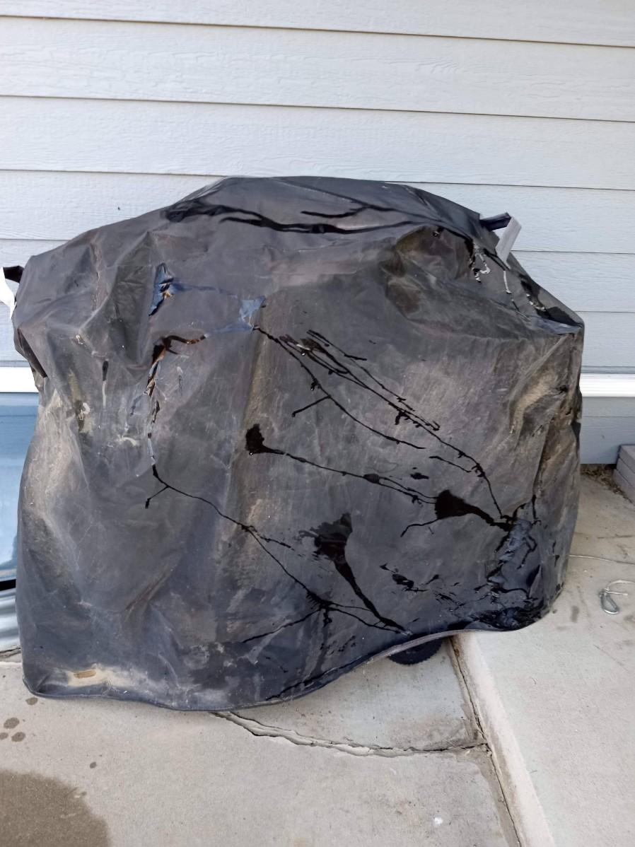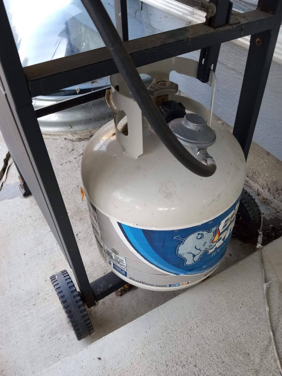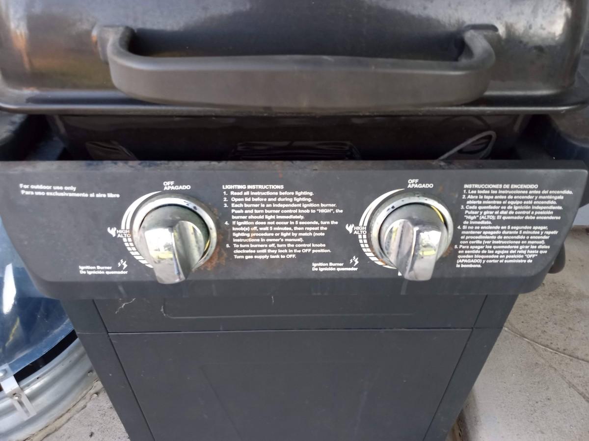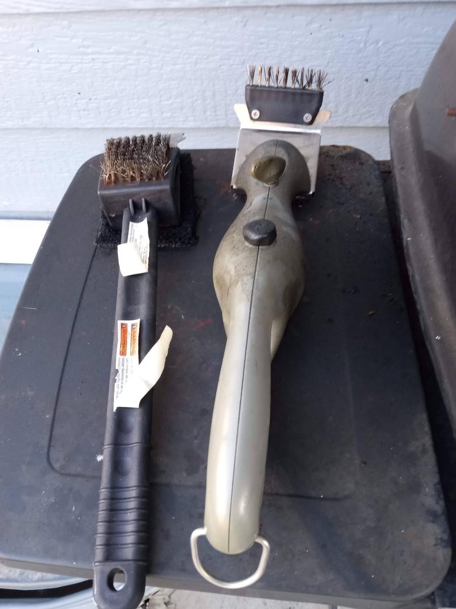 A PROPANE BACKYARD GRILL WITH GRILL BRUSHES, AND A GRILL COVER