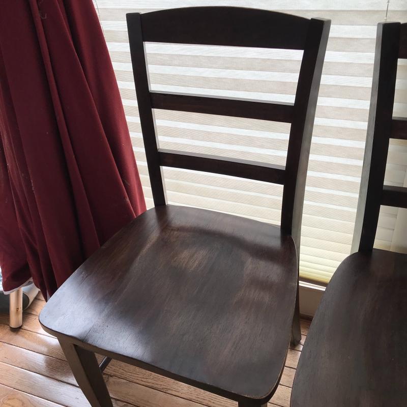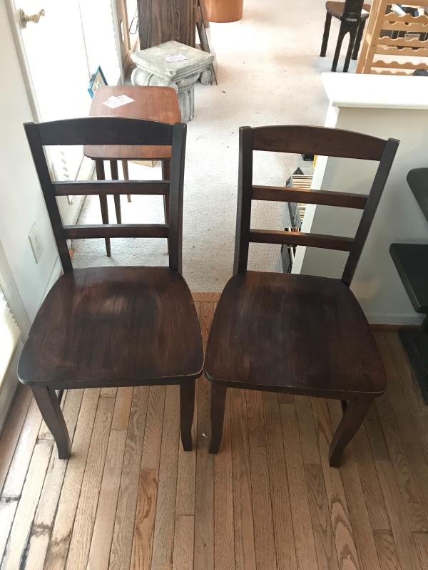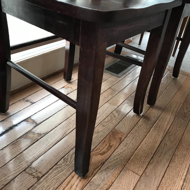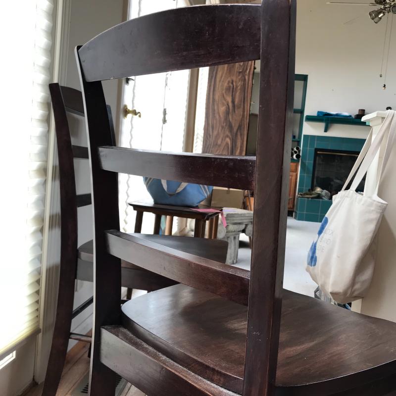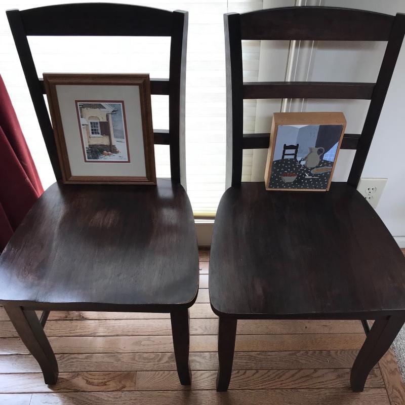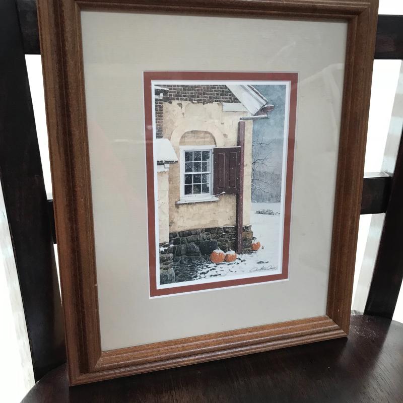 Lot includes matching chairs with dark stain finish. Approx. 18” x 18” x 35”. Also included in Lot are two pieces of artwork. One is painted and unsigned, the other appears to be signed “David E. Doss.” Local pickup only.