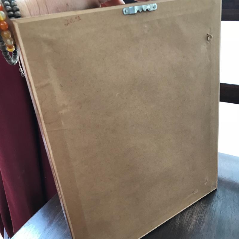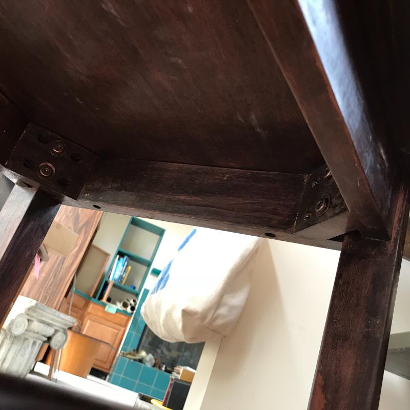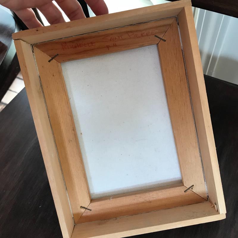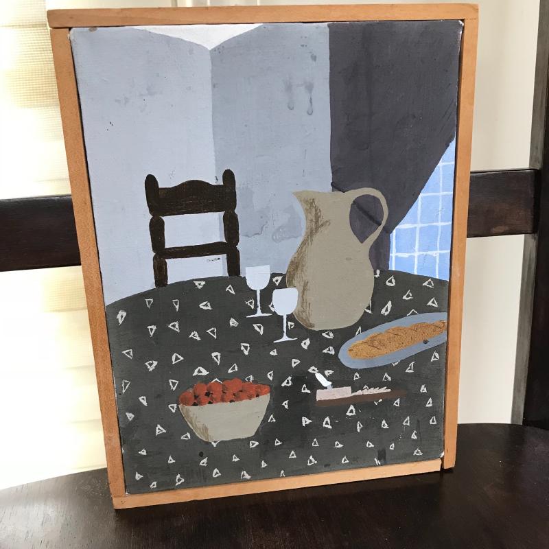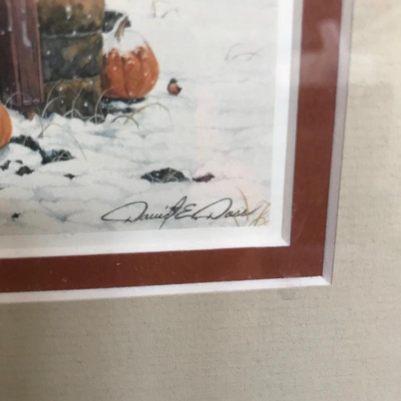 Lot includes matching chairs with dark stain finish. Approx. 18” x 18” x 35”. Also included in Lot are two pieces of artwork. One is painted and unsigned, the other appears to be signed “David E. Doss.” Local pickup only.
