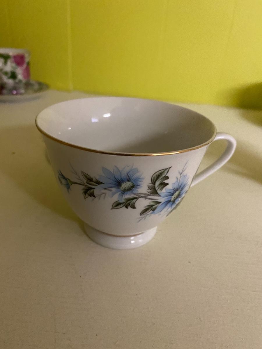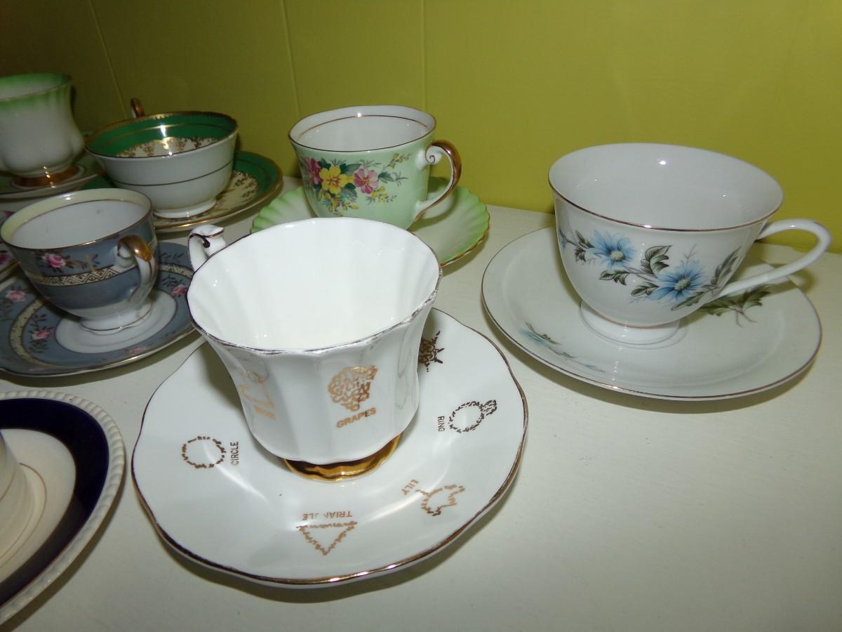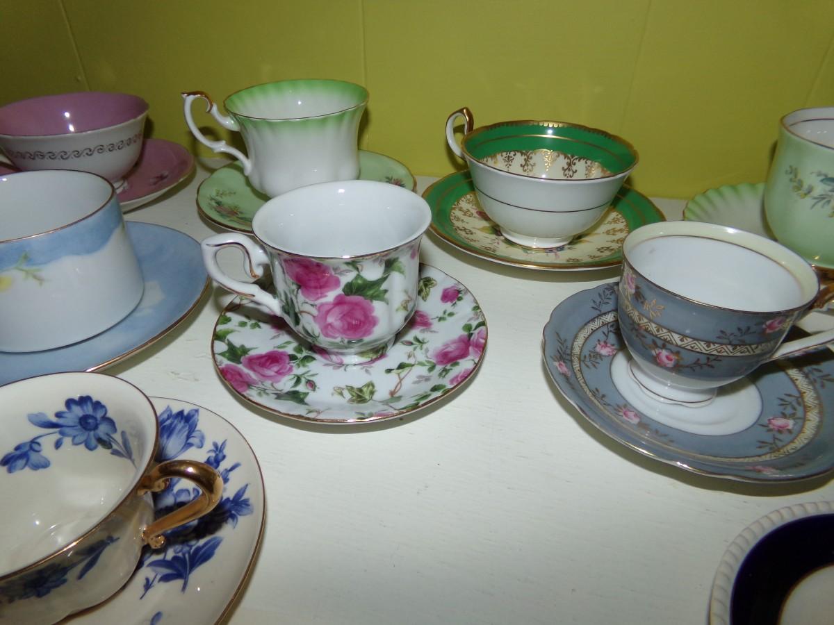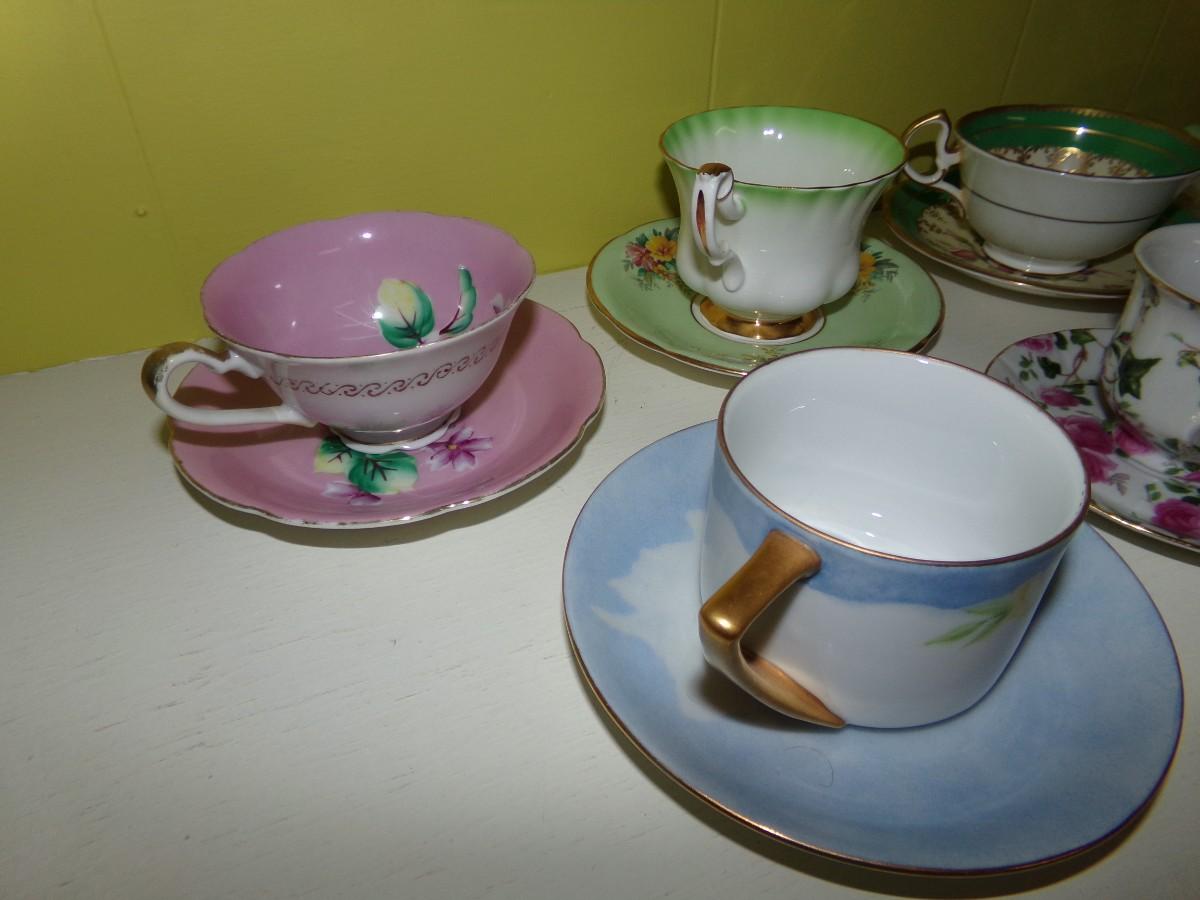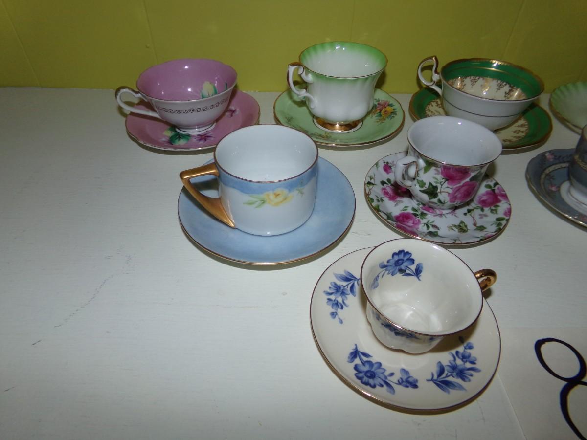 NICE ASSORTMENT OF CHINA CUPS AND SAUCERS. THEY ARE MADE IN DIFFERENT PLACES LIKE CHINA AND ENGLAND.