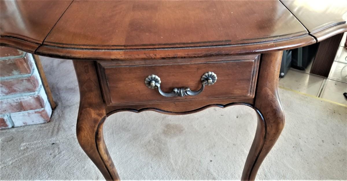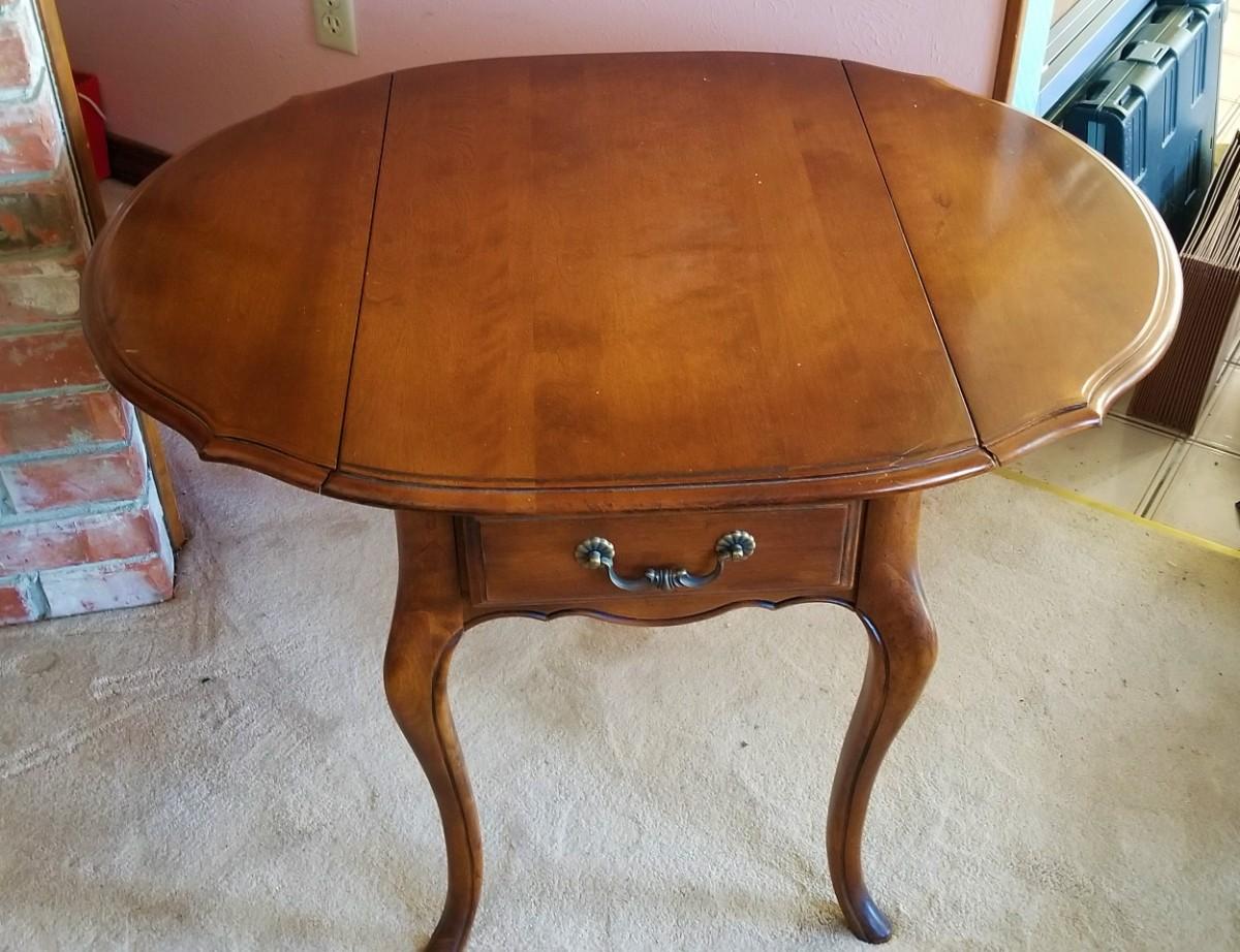 Classic ETHAN ALLEN drop leaf end/lamp table with drawer. Queen Anne style legs, scalloped top. 22" tall, 28" deep, 3 feet across with fully extended. Good condition.