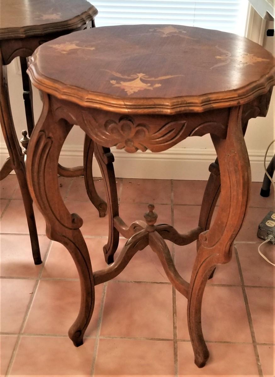 Very cute matched pair of antique inlaid parlor tables. Each measures 19" across, 27" tall. Pretty inlaid design - both gently used condition.
