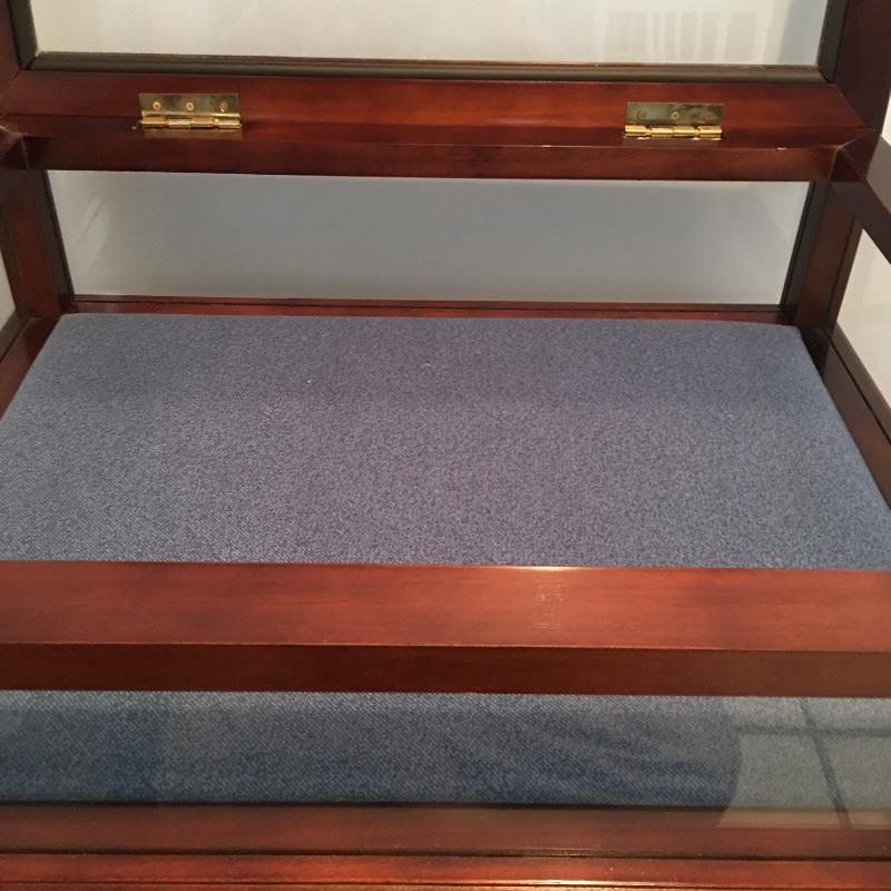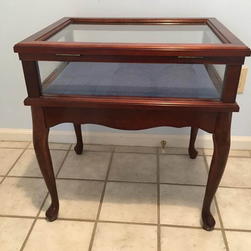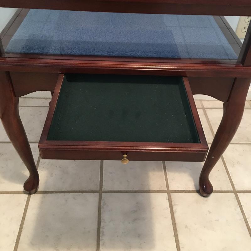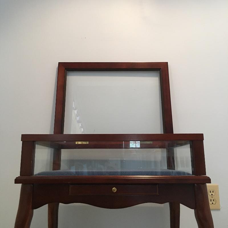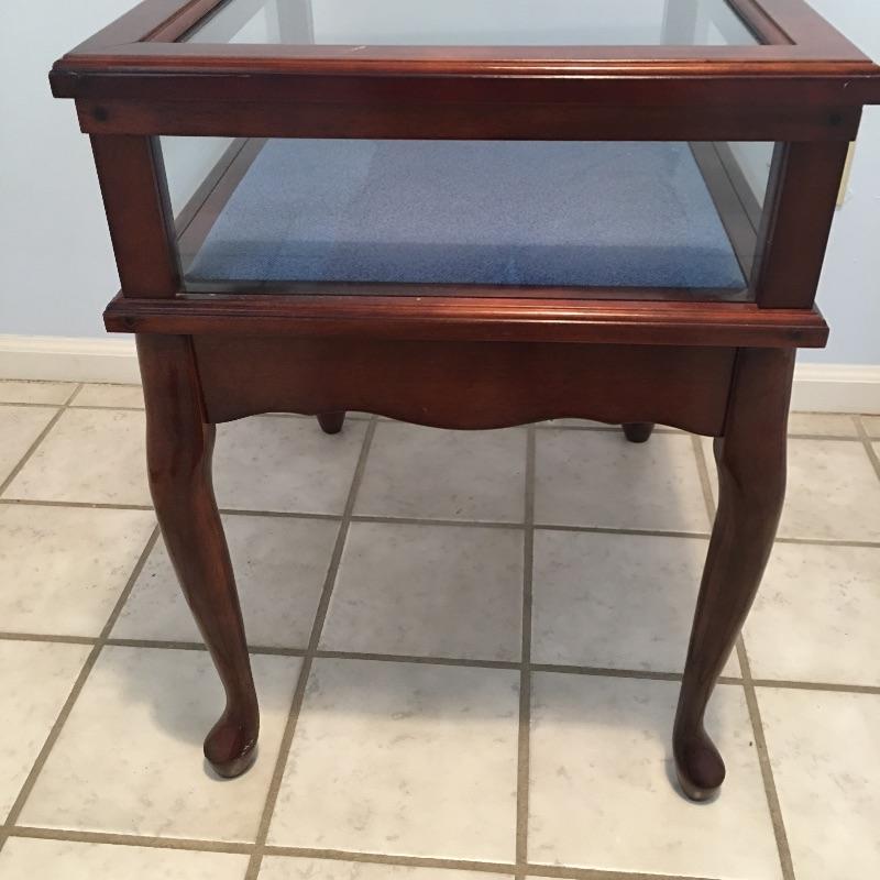 Display table is a great way to display some photos or memorabilia while protecting them. Easy to see what's inside with all the glass. Top lifts up to add your goods. Small front drawer for storage. Small scratch on wood on top right. Display table measures 17.5” x 22.5” x 23.75”.