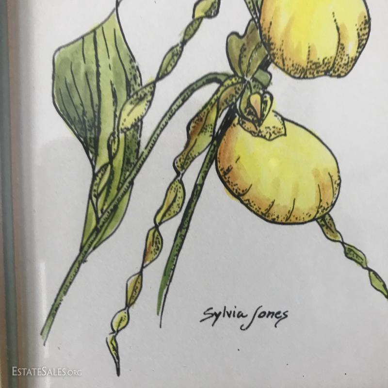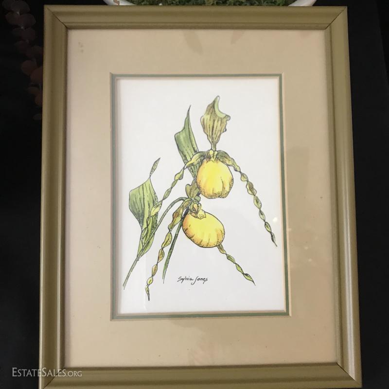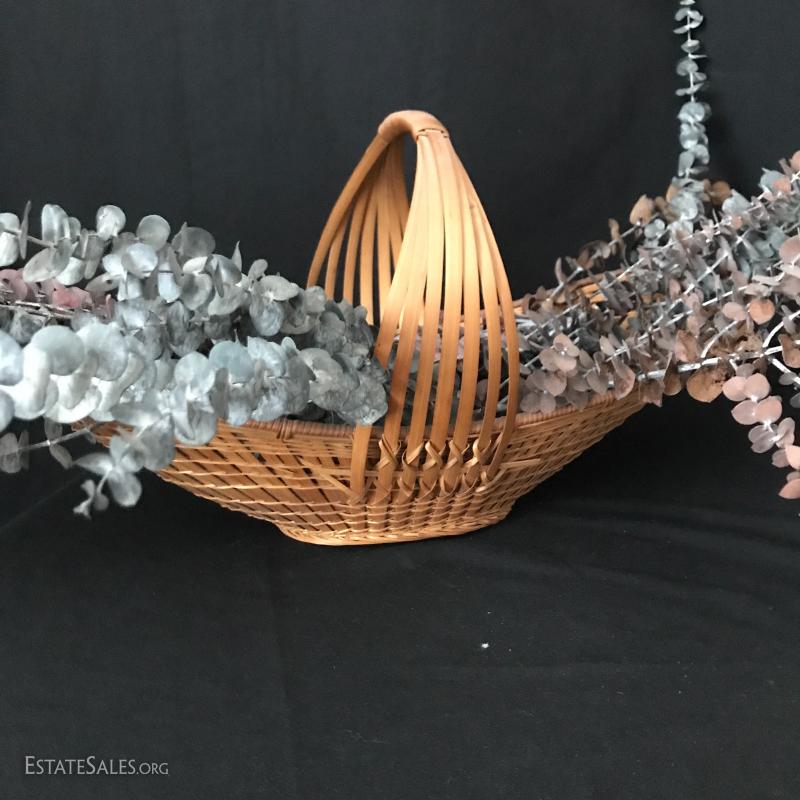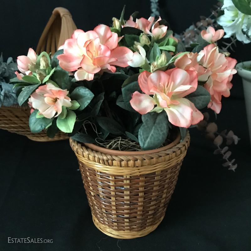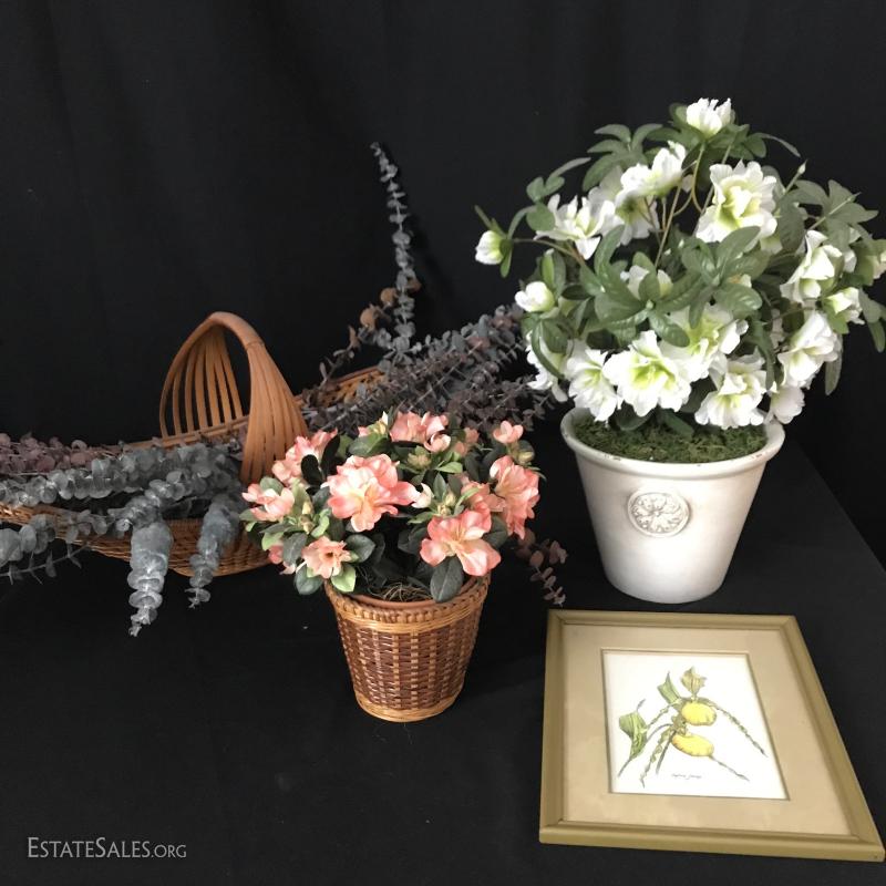Faux flowers in containers. Largest measures 18" tall. Long basket is by Paul Marshall and measures 21" long. Print by Sylvia Jones. Measures 11"l x 9"w. No shipping. Local pick up in Asheville, NC.
