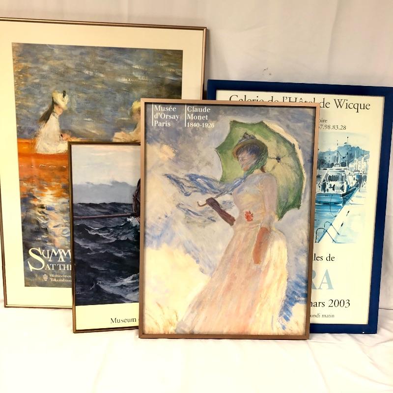 Four museum posters by renowned artists like Monet and more are included here, see images. All are framed, 3 in metal frames, the fourth in a medium blue.